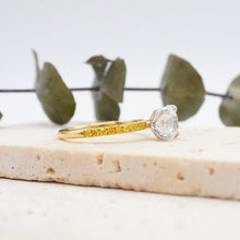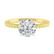 This forever piece features delicate petal prongs and a classic pavé band, a design as graceful and captivating as she is. Like her, its beauty isn’t loud; it blooms softly, effortlessly, like a flower kissed by morning light. This round cut diamond engagement ring's yellow diamond pavé accents shimmer gently, just like the true and steady love you’ve nurtured together.
