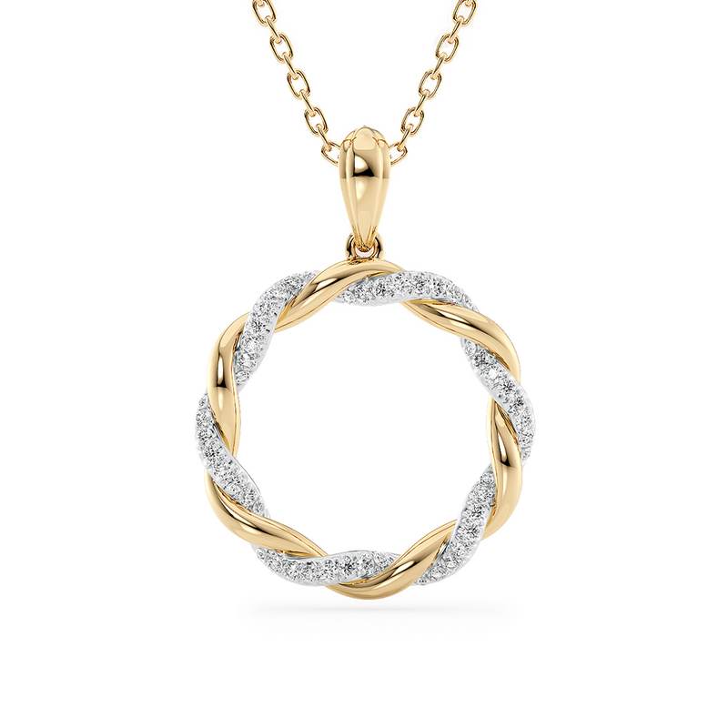 Introducing our Fiore Necklace — this exquisite piece is designed for the modern woman who appreciates both sophistication and adaptability— one side, experience the enchantment of diamonds meticulously arranged to catch and reflect the light, adding a brilliant sparkle to your look. The other side offers a sleek and polished surface, allowing for a more understated and classic appearance. Crafted with precision, the round pendant boasts a captivating twisted design and is meticulously plated in two tones of gold for a luxurious touch.