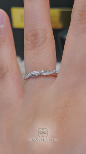 Ribbons of pavé-set gems and high polished precious metal appear gracefully woven together in this nature-inspired eternity design. This ring signifies the blending of hearts and interwoven lives in a couple's new chapter together.