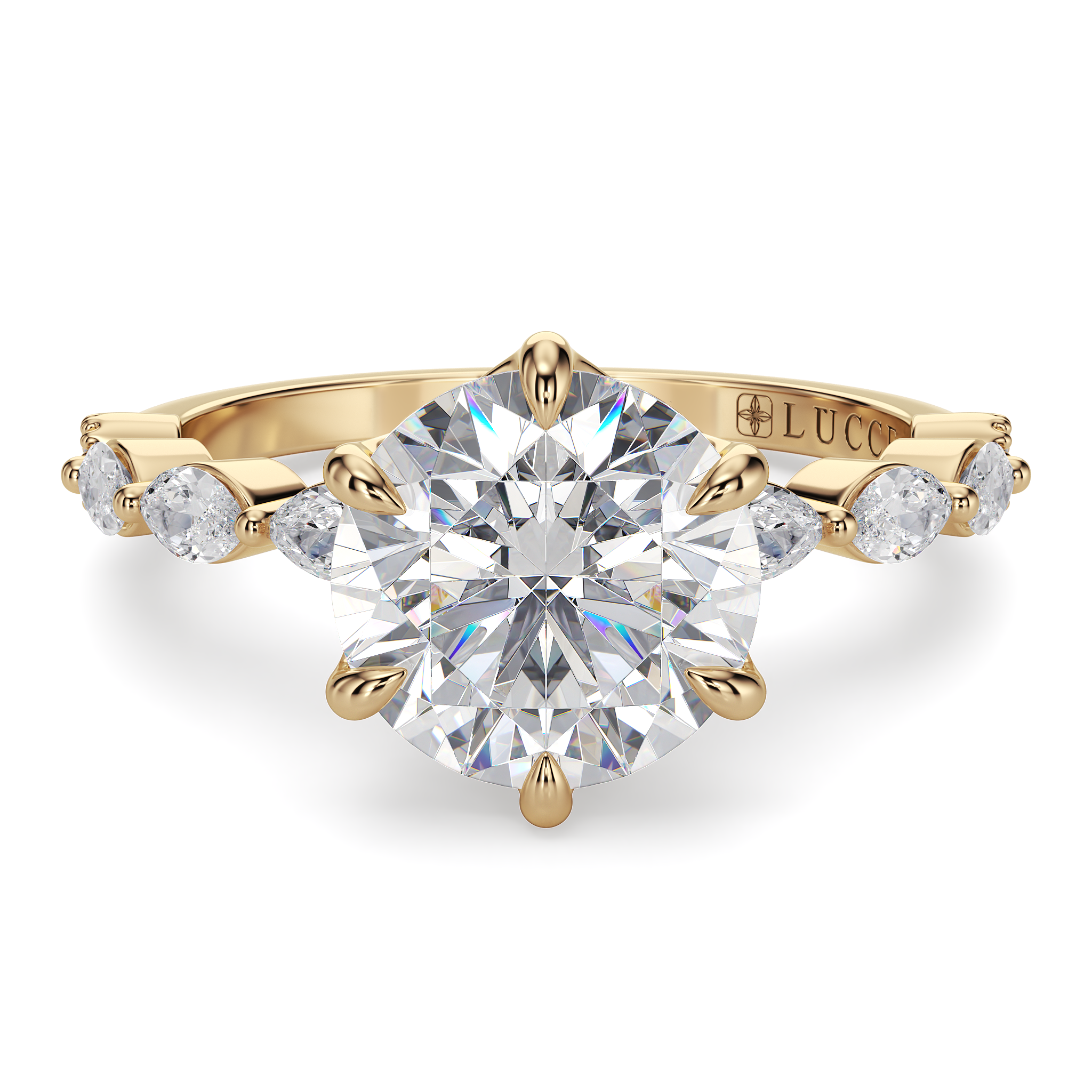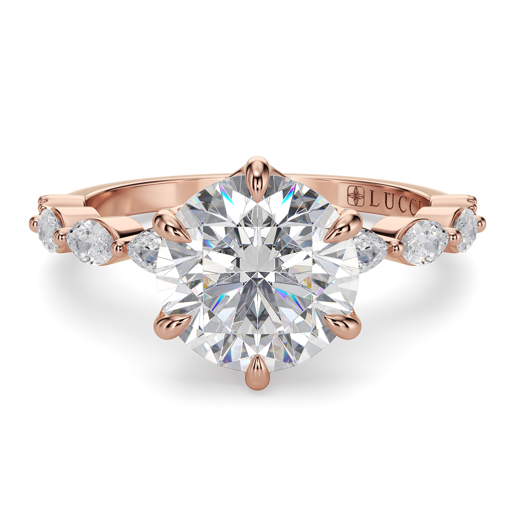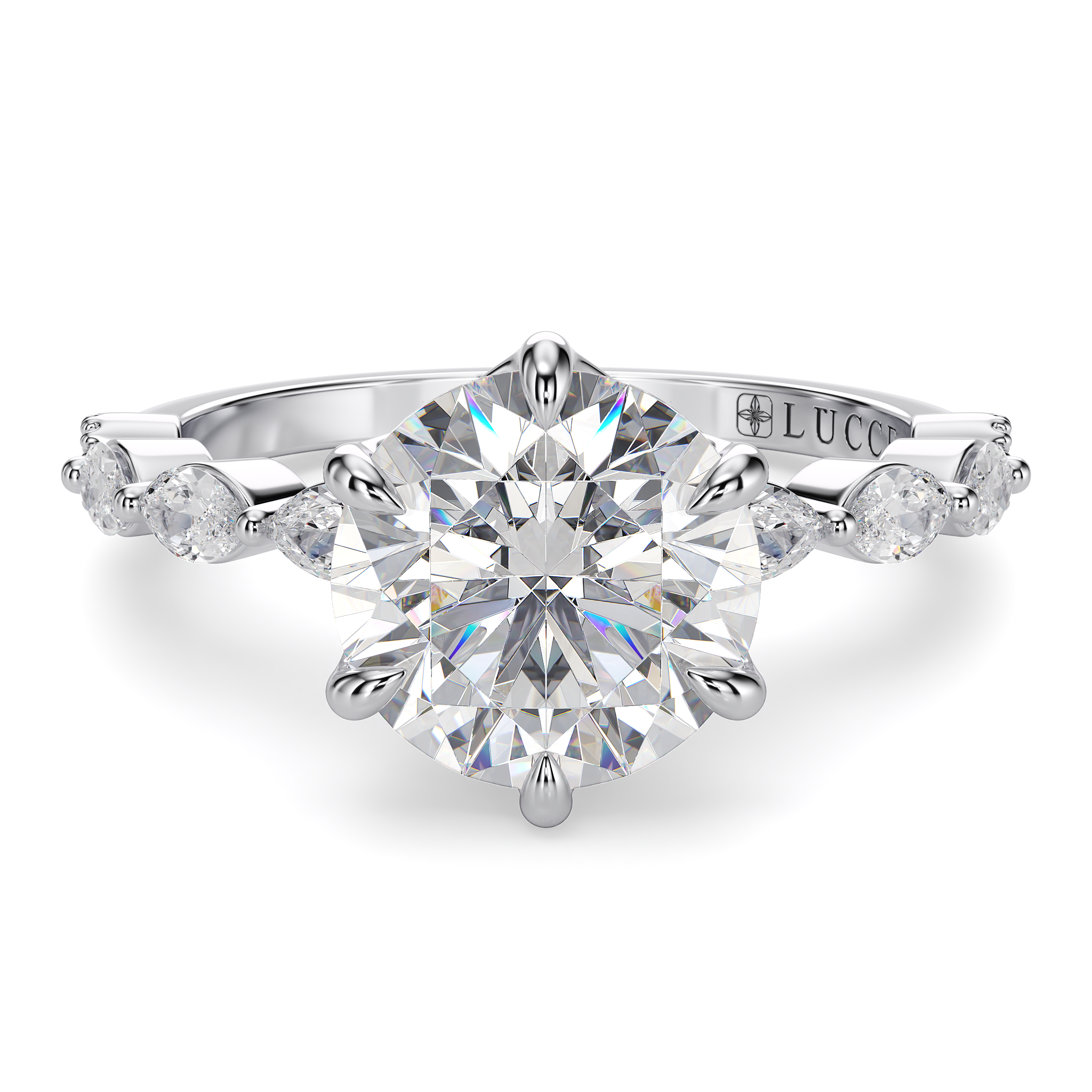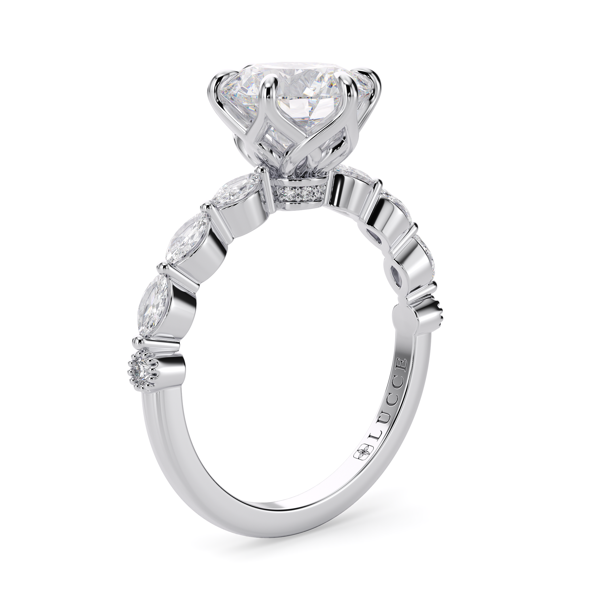 Lucce’s Paula Ring, featuring a mesmerizing cluster design meticulously crafted with marquise and round-cut stones that beautifully emphasize the brilliance of the Round Cut Moissanite Center Stone. This exquisite ring goes beyond ordinary elegance with its hidden petal design, adding a touch of romance and sophistication to every gesture.