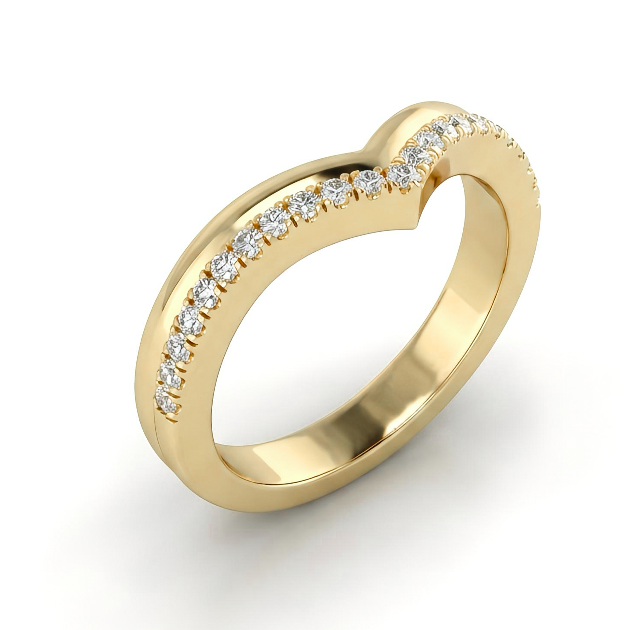This forever piece features a distinctive double-layered design, with one layer set in shimmering pavé stones. Half plain and half pavé, it symbolizes two lives becoming one; balance, contrast, and perfect unity. The downward contour symbolizes your love's depth and devotion.