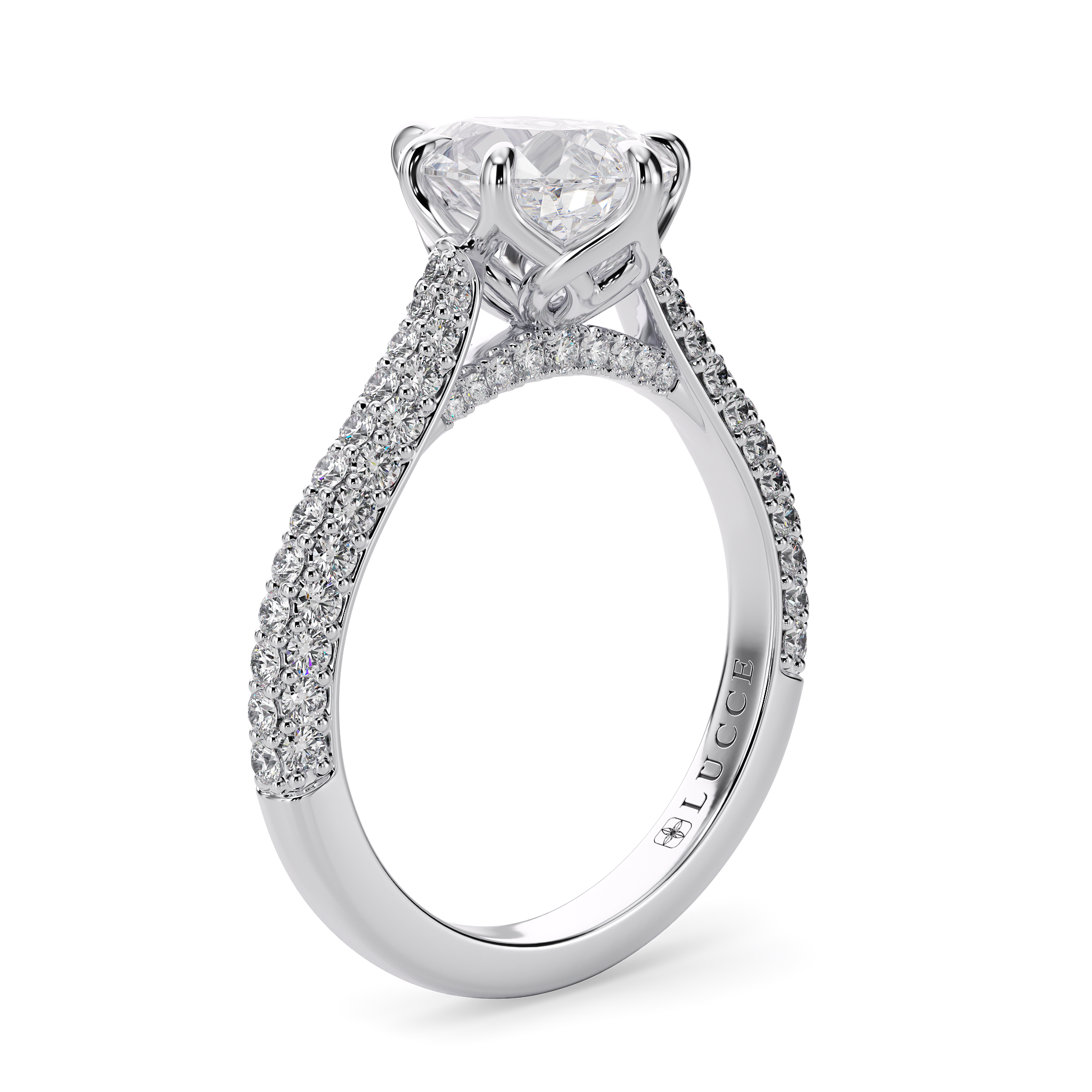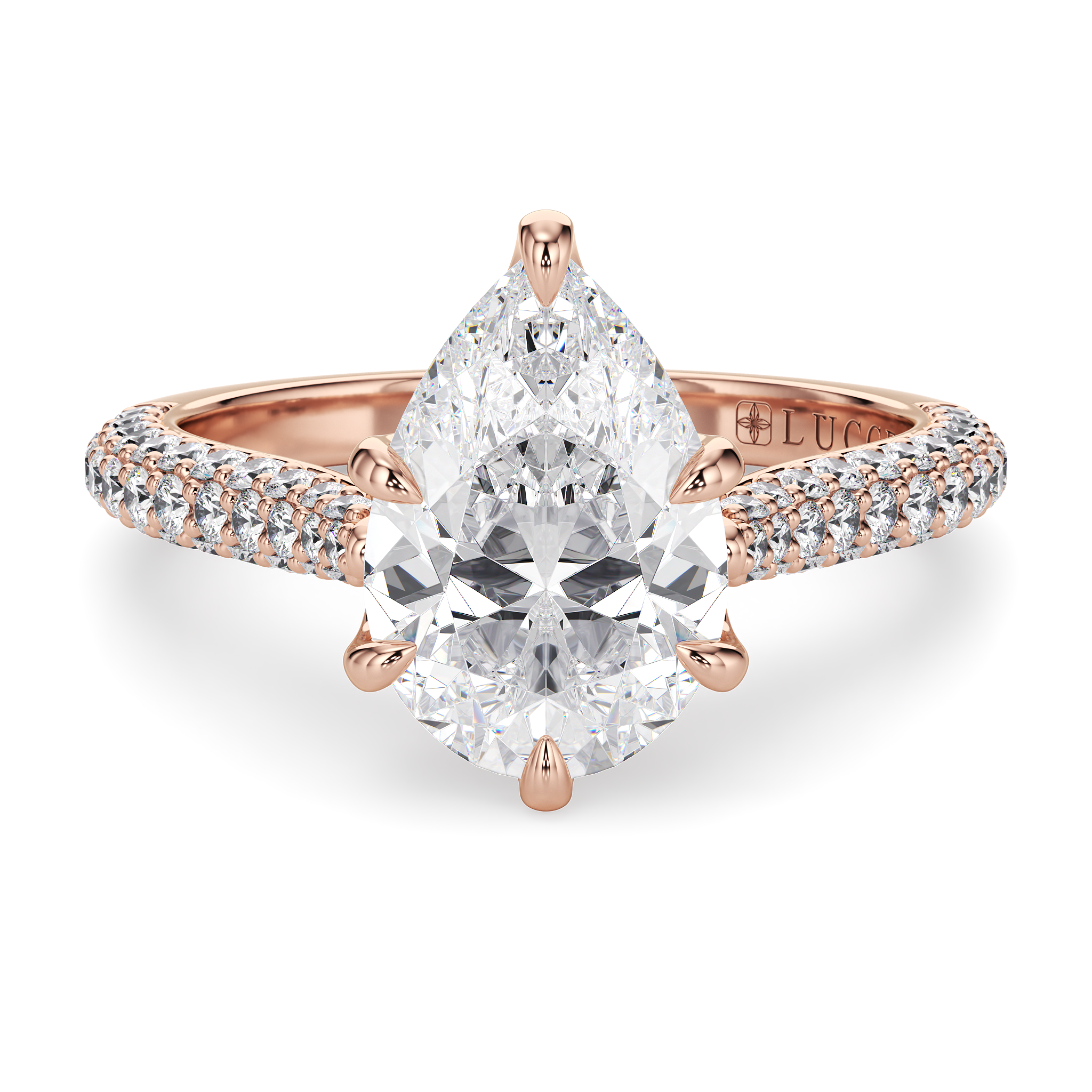 This forever piece is crafted with meaningful details, perfect for an unforgettable proposal. This pear cut diamond engagement ring features a radiant tri-row band, a graceful cathedral setting with tapered bridge accents, and Lucce’s signature petal prongs. The tri-row band sparkles from every angle, just like her, beautiful in every way you see her. This ring speaks of a love that says she deserves everything, and of your heartfelt promise to give her nothing less than your all.