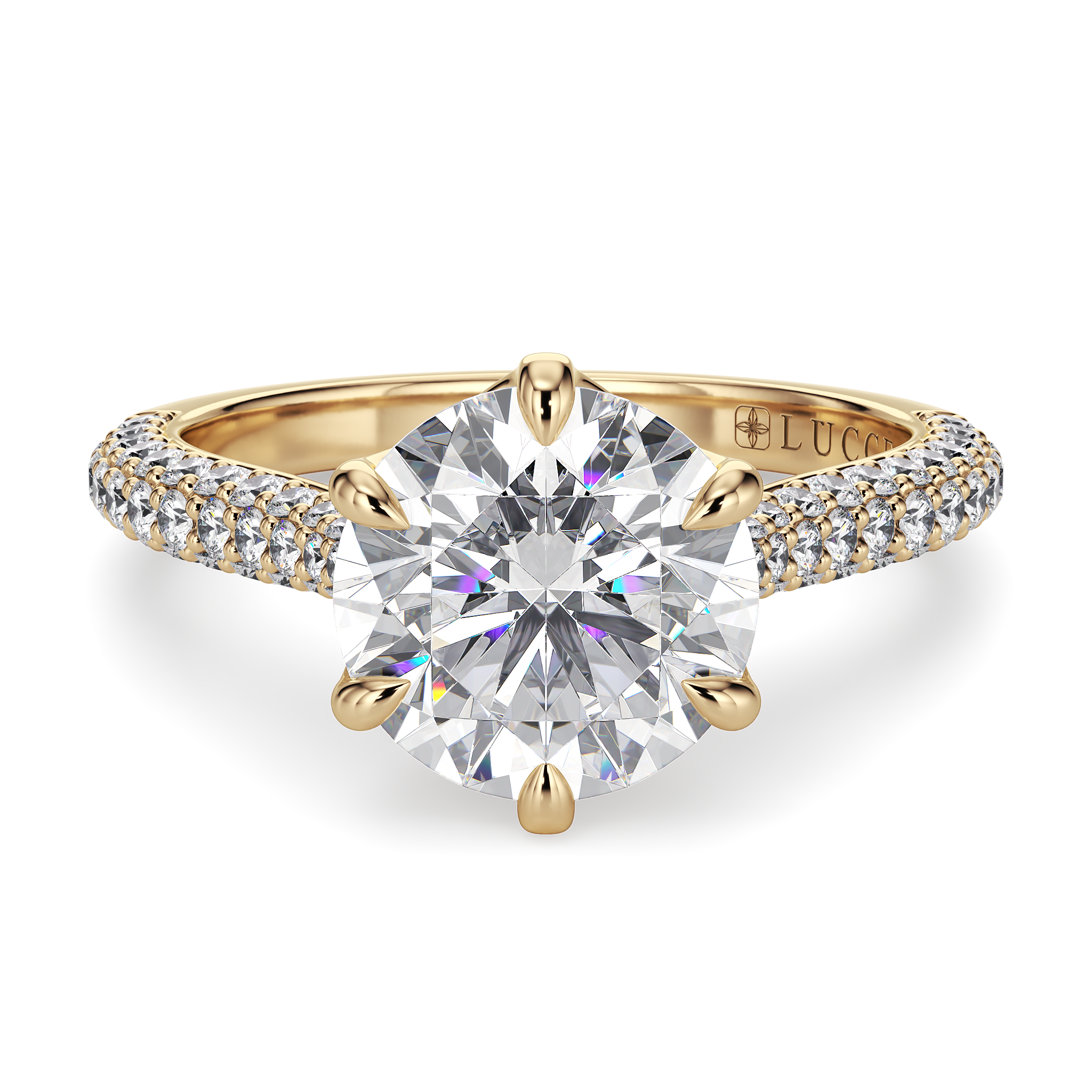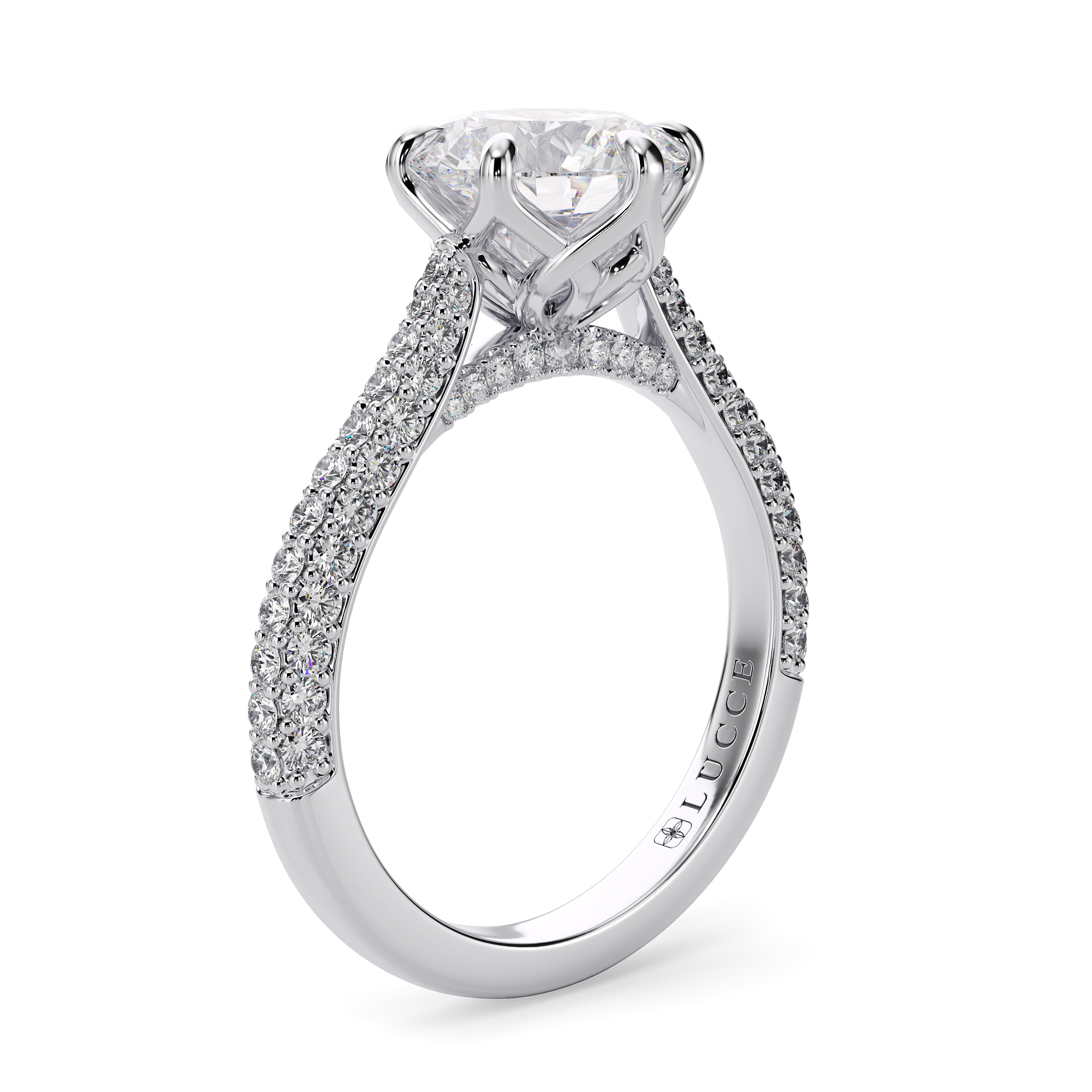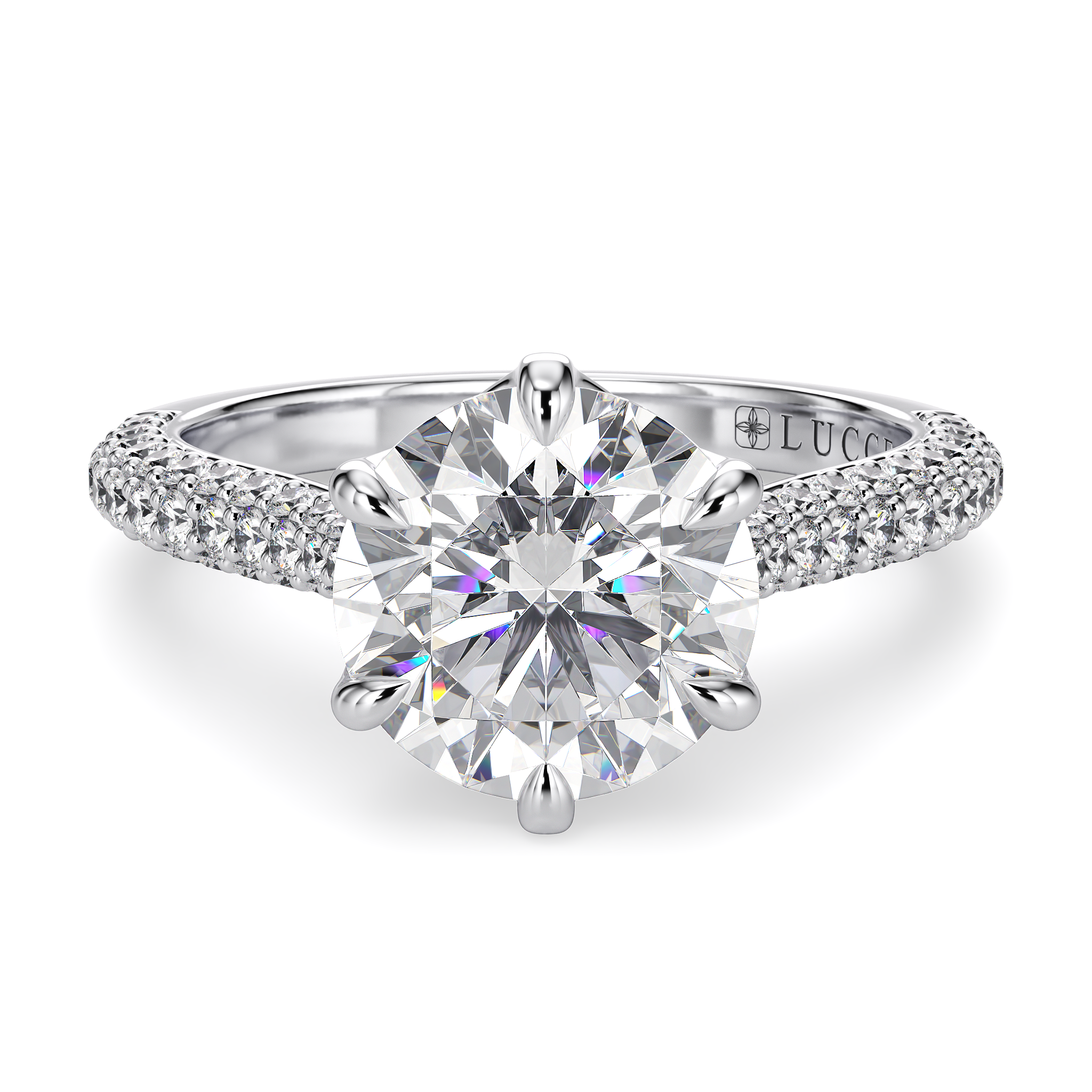 This forever piece is crafted with meaningful details, perfect for an unforgettable proposal. This round cut diamond engagement ring features a radiant tri-row band, a graceful cathedral setting with tapered bridge accents, and Lucce’s signature petal prongs. The tri-row band sparkles from every angle, just like her, beautiful in every way you see her. This ring speaks of a love that says she deserves everything, and of your heartfelt promise to give her nothing less than your all.