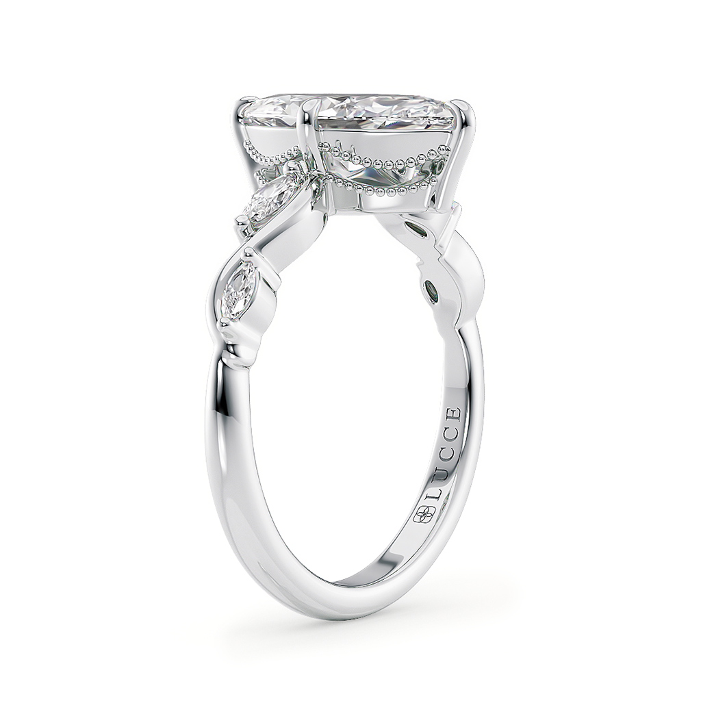 This forever piece features a low profile setting and marquise-cut diamonds nestled in twisting vines, elements that echo Lucce’s iconic emblem. This marquise cut diamond engagement ring's low setting mirrors the kind of love you share, quiet and grounded yet full of depth and meaning. The marquise diamonds in twisting vines form an infinity design, representing a love that is forever true and constant through all times.