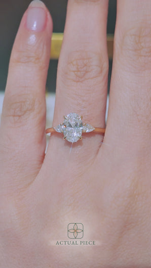 This forever piece is Lucce’s modern, luxurious take on the timeless three-stone ring. This oval cut engagement ring's trio of diamonds blooms like a bouquet, each stone representing the love you’ve shared in the past, share in the present, and will share in the future. It’s like saying I love you, not just once, but as a promise you’ll keep whispering for a lifetime.