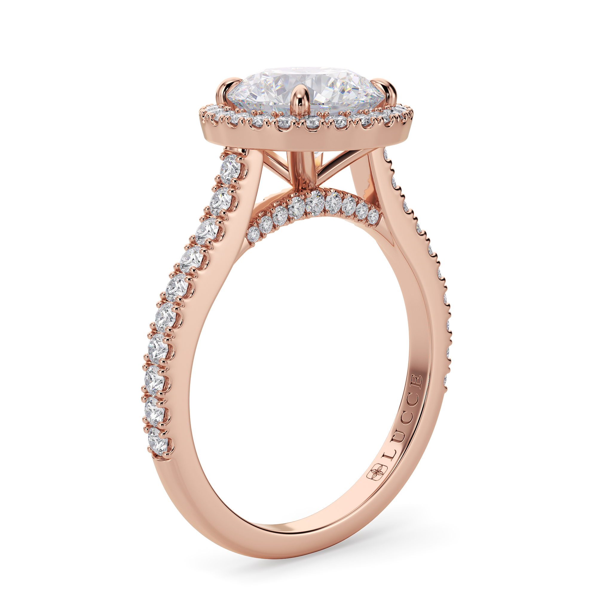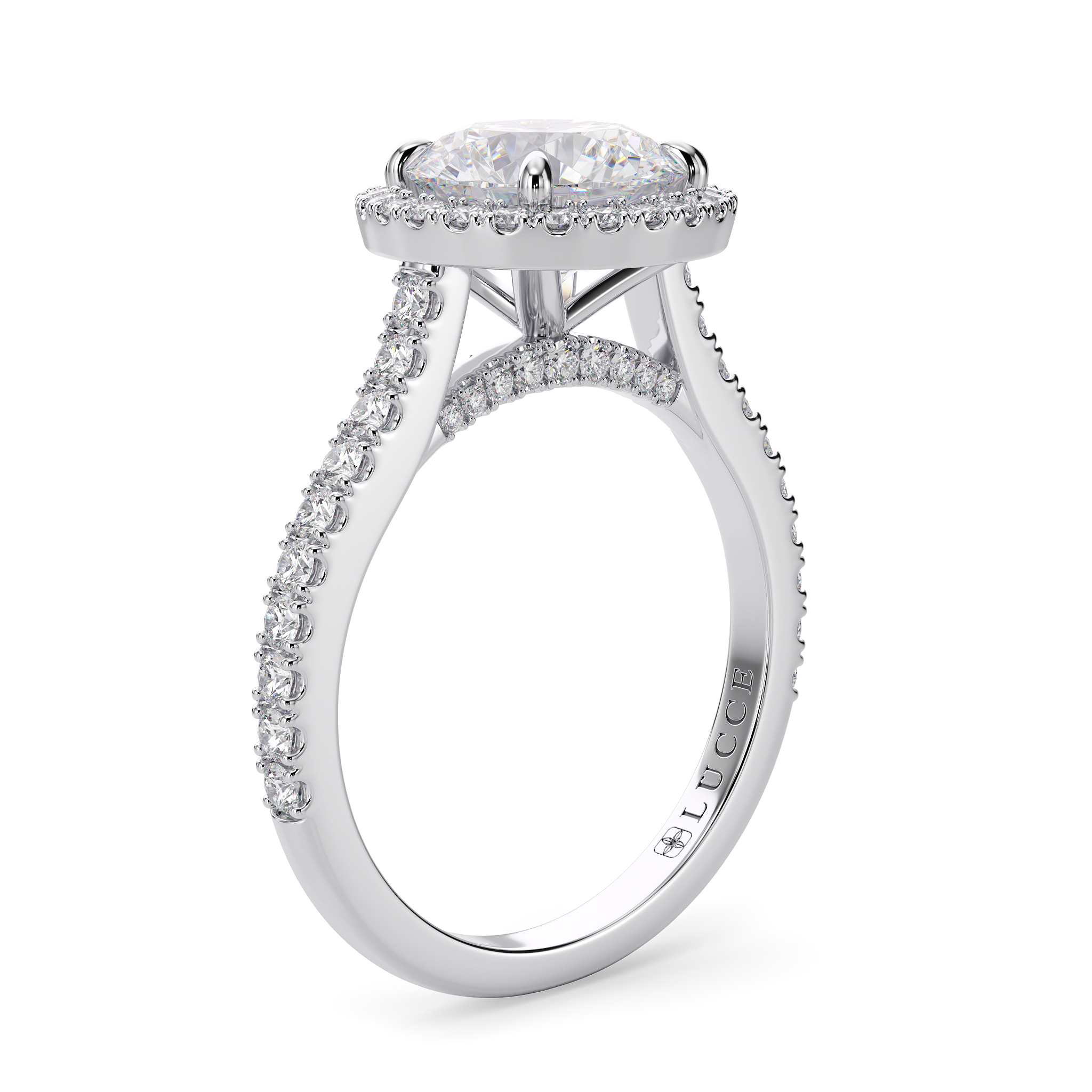 This forever piece features a halo pavé setting with Lucce’s signature tapered bridge. This round cut diamond engagement ring's timeless design speaks of a love without end, just like the halo itself. And like the halo of an angel, it reflects how she’s brought light into your life, made you better, and inspired you to be the best partner you can be for her, always.