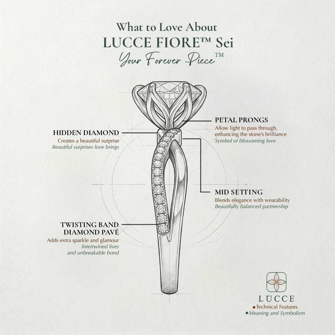 This forever piece features a twisting accented band and LUCCE’s signature petal prongs. This round cut pink diamond engagement ring's twisting band symbolizes two lives intertwined by love, forming an infinity that speaks of a bond that is eternal and unbreakable. It is a promise to stay, through all of life’s twists, turns, and everything in between. Best paired with the LUCCE FIORE™ Sei Flush.