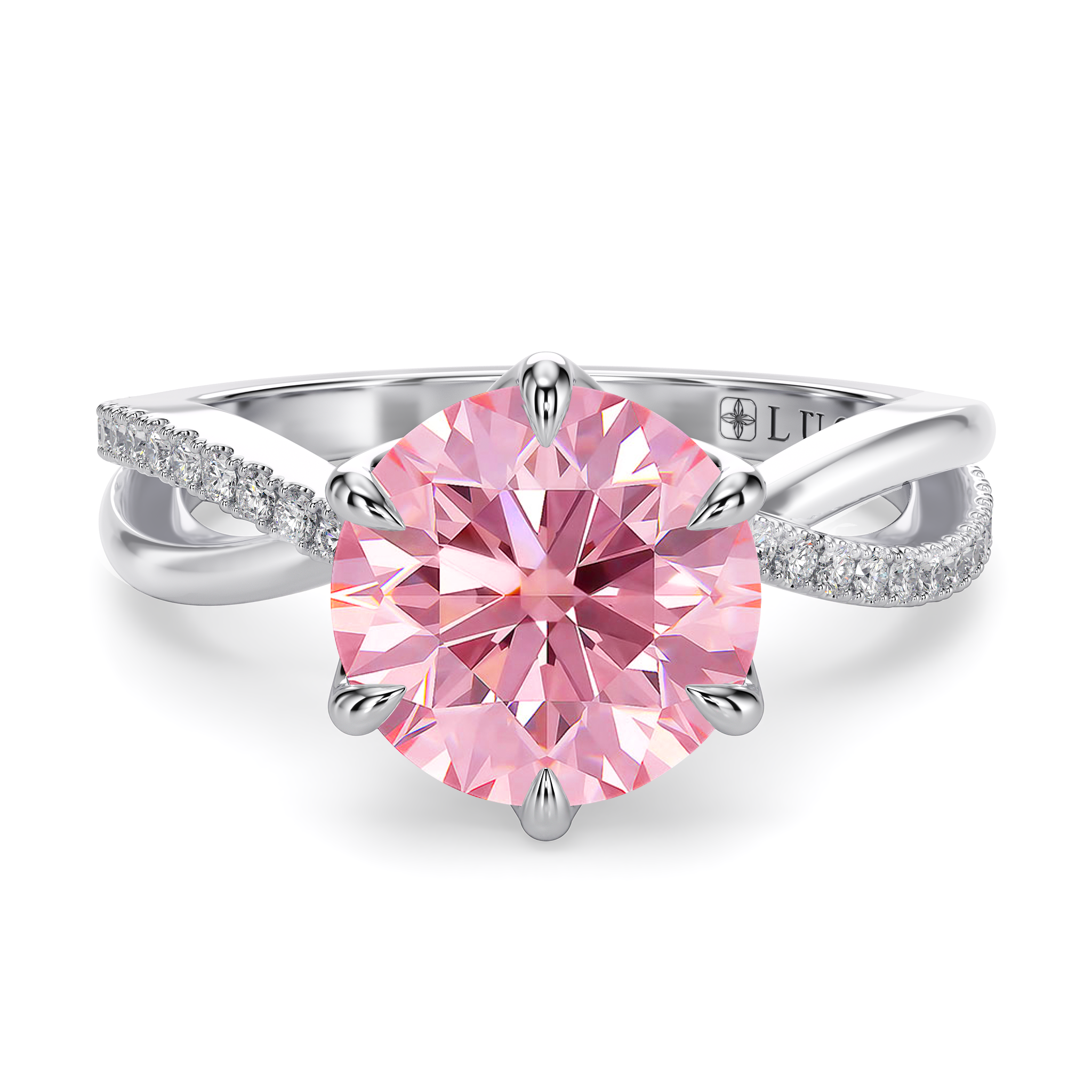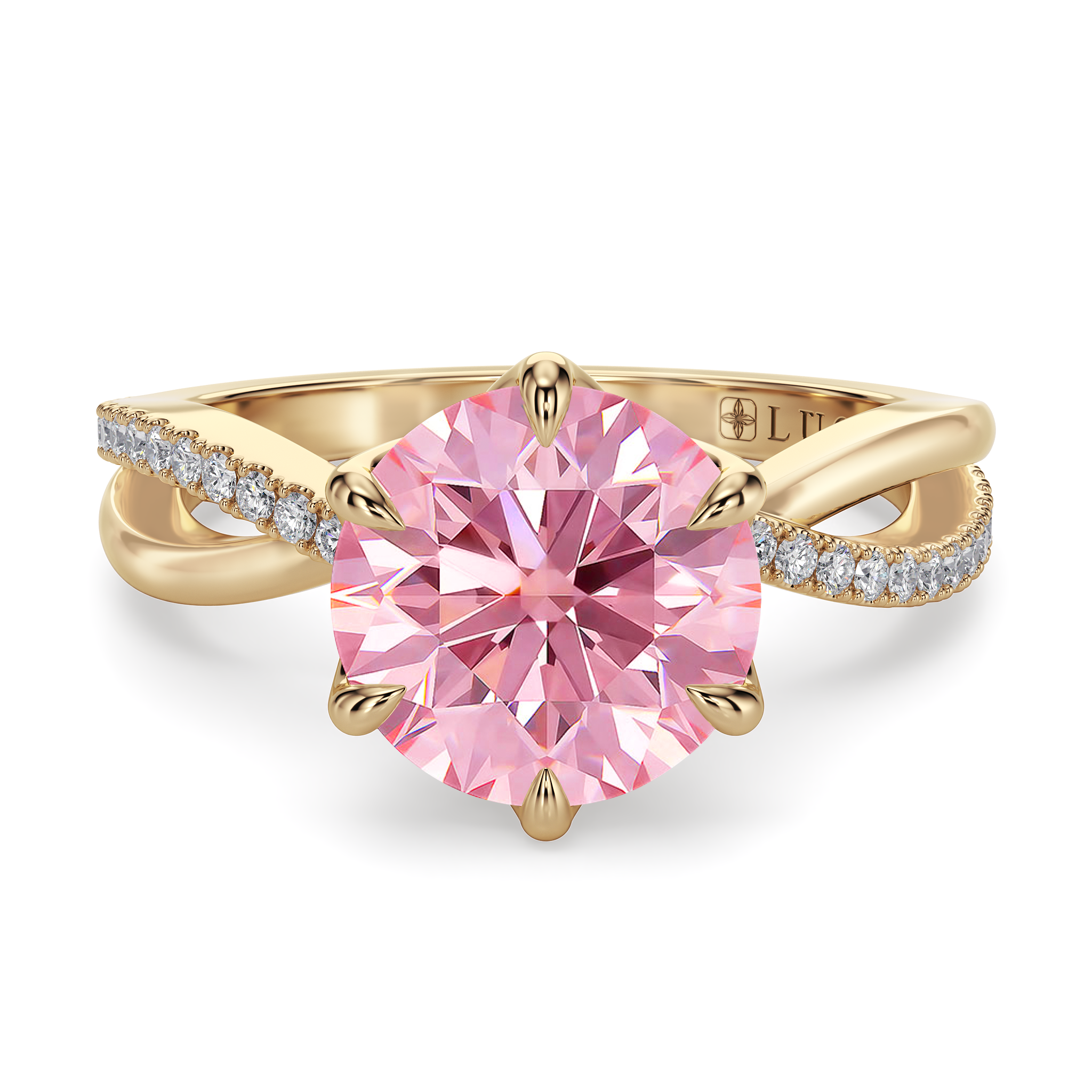 This forever piece features a twisting accented band and Lucce’s signature petal prongs. This round cut pink diamond engagement ring's twisting band symbolizes two lives intertwined by love, forming an infinity that speaks of a bond that is eternal and unbreakable. It is a promise to stay through all of life’s twists, turns, and everything in between.
