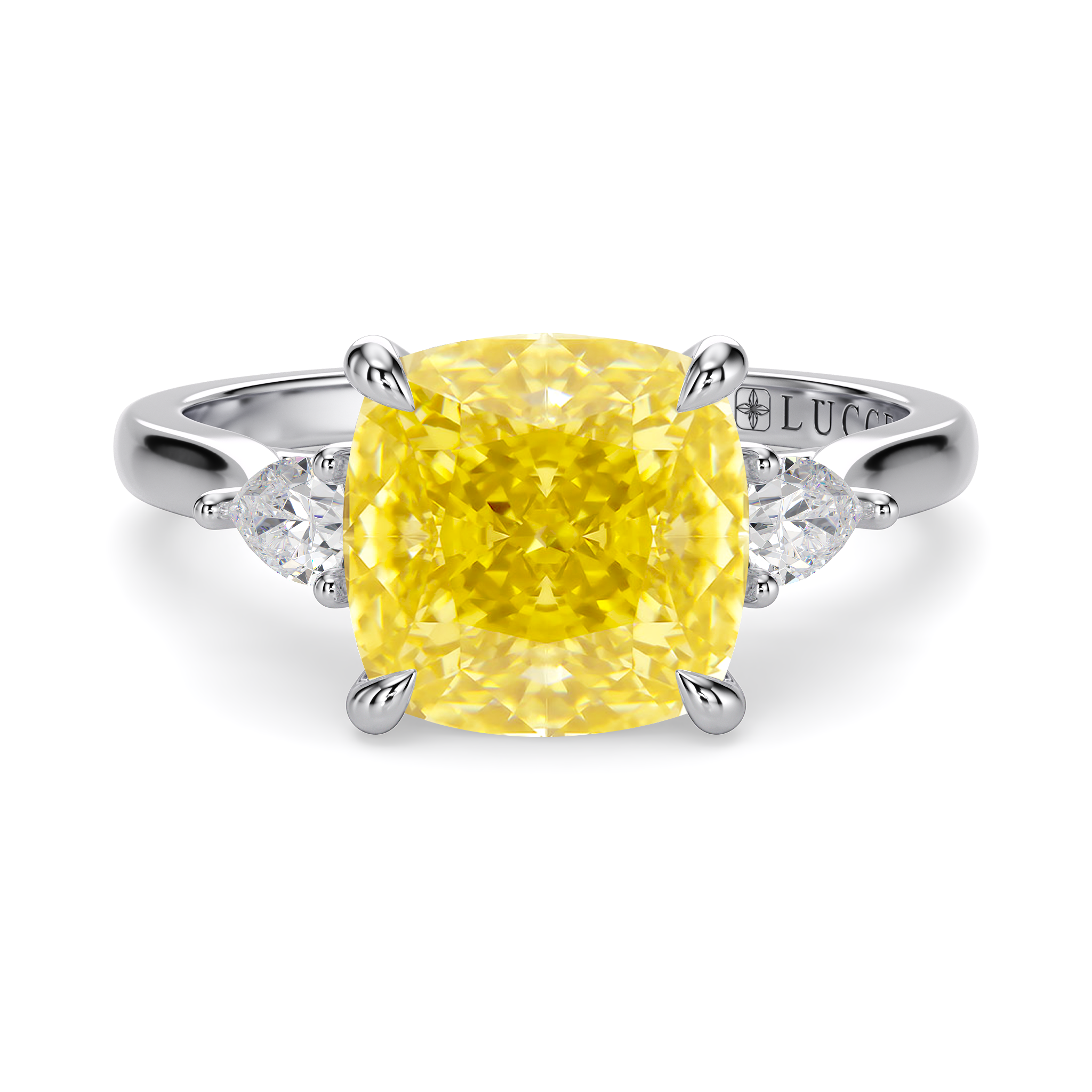 This forever piece is Lucce’s modern take on the timeless three-stone ring. This cushion cut engagement ring's trio of yellow and colorless diamonds blooms like a bouquet, each stone representing the love you’ve shared in the past, share in the present, and will share in the future. It’s like saying I love you, not just once, but as a promise you’ll keep whispering for a lifetime.