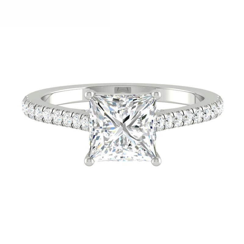 This is a piece made for the true romantic featuring the most stunning princess cut, displayed with a curved gallery rail and framed by bejeweled arches. She is beauty and brilliance, made into one timeless engagement ring.