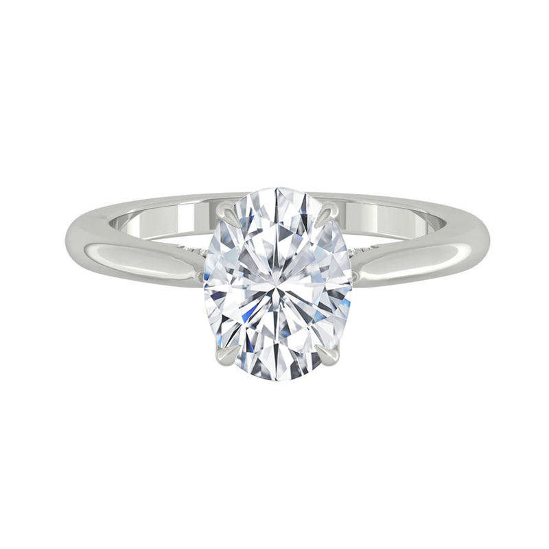 Four petals hug this ring's oval cut center, while an elegant band extends upward like a cathedral's majestic arches to represent the strength of your relationship. Adding a sparkling surprise are unique accents on the tapered bridge- a 4 petal prong support the most brilliant symbol of a love like yours.