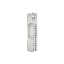 The Caleb Luxe Polished wedding ring is a modern take on the traditional slightly domed wedding band style. It features a carved design with diamonds for that wider and more edgy look.