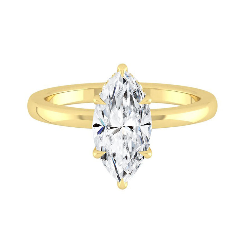 This forever piece features a uniquely wrapped hidden halo and a classic solitaire band. From the top, this marquise cut diamond engagement ring appears simple and elegant, but from another angle, a hidden sparkle is revealed, just like her and the quiet depth of the love you share. The wrapped halo symbolizes your heartfelt promise to keep her safe, embraced in your arms and cherished for all the days to come.