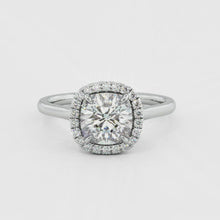 This dazzling ring with a halo of luminous sparkle enhances the beauty and size of the cushion cut center stone. It is best paired with a woman who exemplifies royalty and femininity.