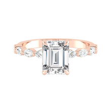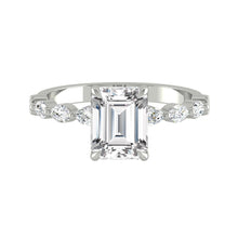 Lucce’s Paula Ring, featuring a mesmerizing cluster design meticulously crafted with marquise and round-cut stones that beautifully emphasize the brilliance of the Emerald Cut Moissanite Center Stone. This exquisite ring goes beyond ordinary elegance with its hidden petal design, adding a touch of romance and sophistication to every gesture.