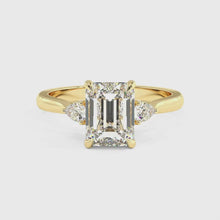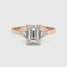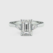 An engagement ring design adorned with three stunning stones — a centerpiece showcasing the finest round lab-grown diamond, flanked by two pear-shaped diamonds on either side. Crafted with the utmost care, this design serves as a heartfelt declaration of love.