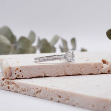 An engagement ring design adorned with three stunning stones — a centerpiece showcasing the finest round diamond, flanked by two pear-shaped diamonds on either side. Crafted with the utmost care, this design serves as a heartfelt declaration of love. The brilliance of the trio is accentuated by the tri-row pave, intricately set along the band. Each row of tiny, shimmering stone not only enhances the overall radiance but also symbolizes the shared journey of the couple — the past, present, and future illuminated by the sparkle of their connection.
