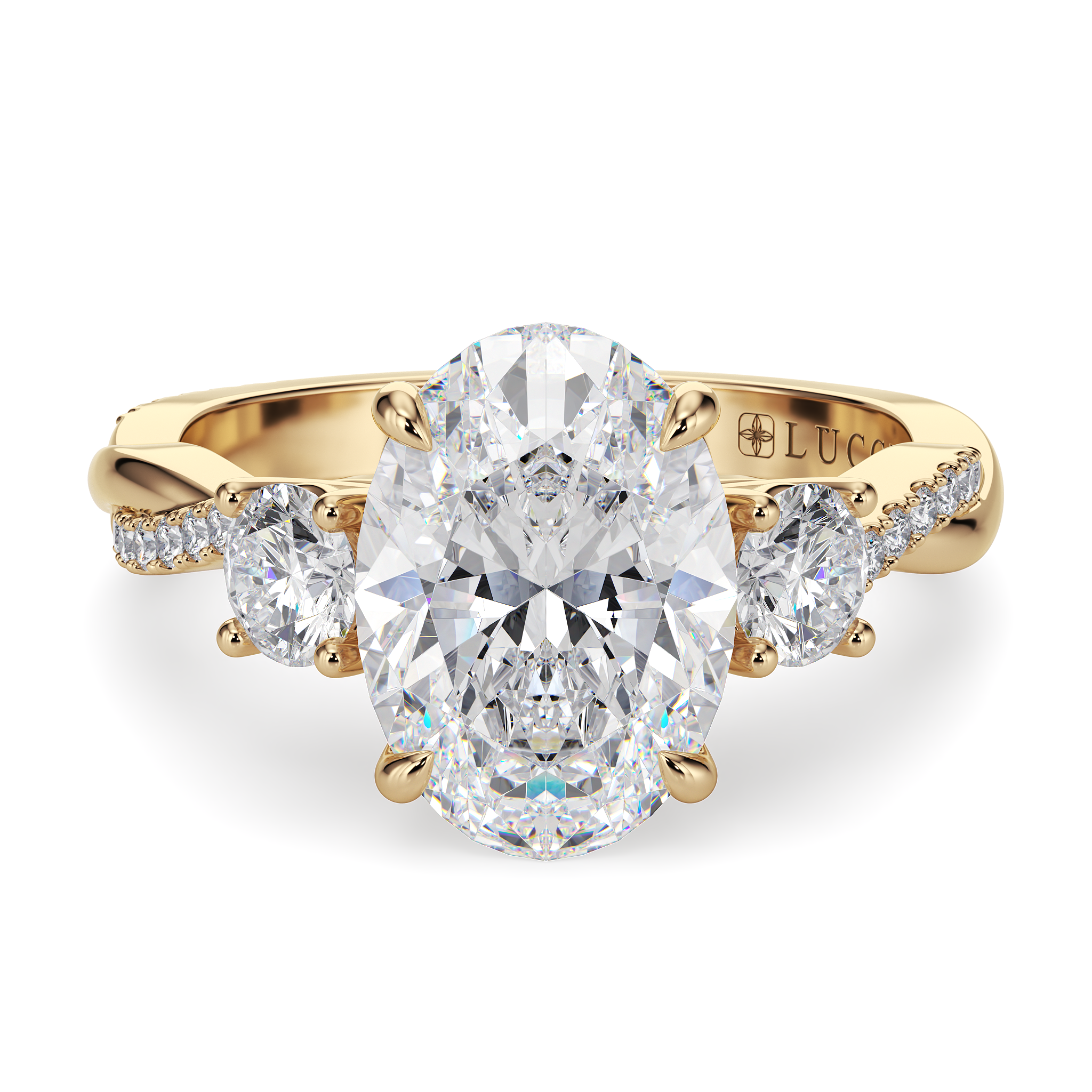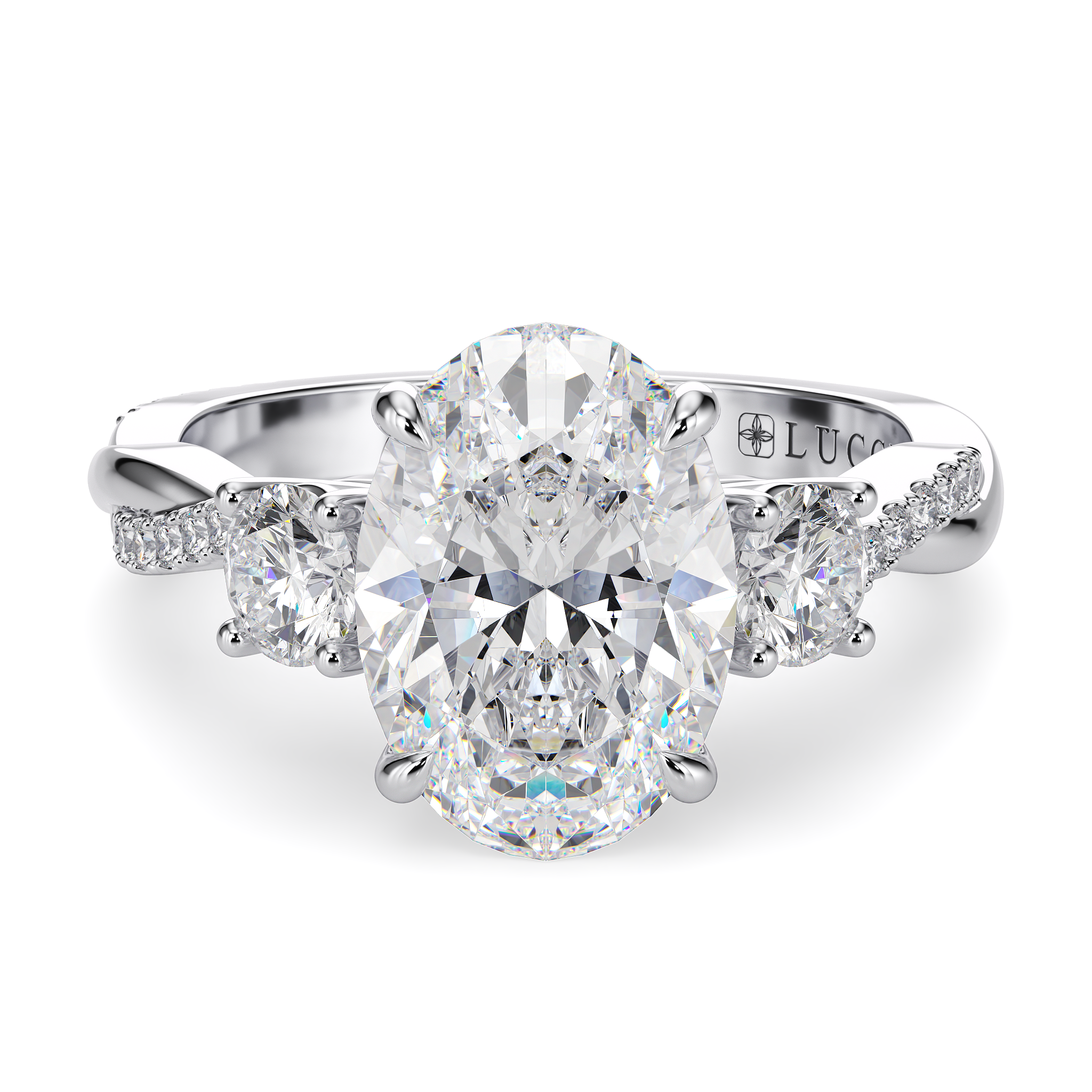 This forever piece showcases a graceful medley of a three-stone setting and a delicately twisting band. This oval cut diamond engagement ring's trio of stones blooms like a bouquet of flowers, each gem representing the love you've shared in the past, share in the present, and will share in the future. The vine-like band gently weaves around them, symbolizing two lives intertwined by love, forming an infinity that speaks of a bond that is unbreakable.