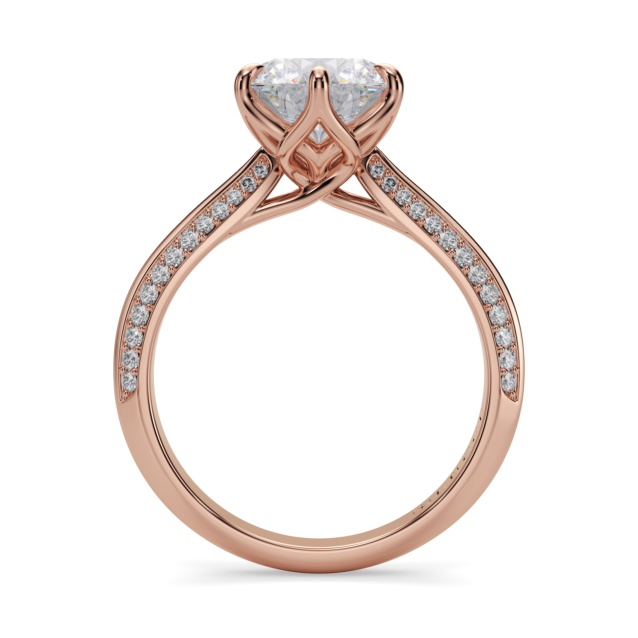 This forever piece features overlapping petal prongs that flow seamlessly into a frosted knife-edge band, symbolizing a love that’s beautifully connected, from promise to forever. Inspired by the Ecuadorian Rose which is among the most beautiful and the biggest rose in the world, admired for its enduring bloom, strong stem, velvety petals, and striking leaves. This round cut engagement ring reflects the depth of your love: bold in its presence, steady through time, and breathtaking in every season.