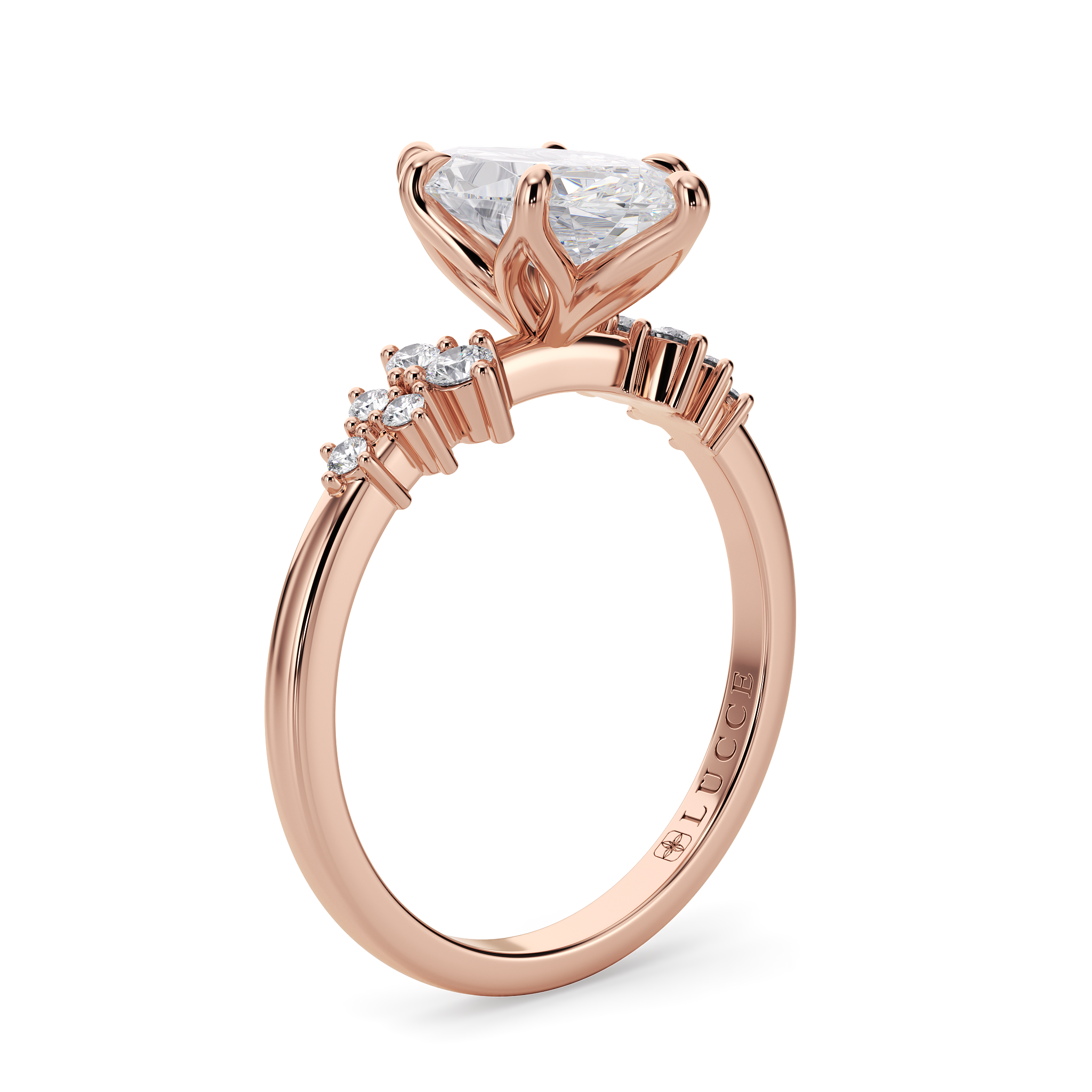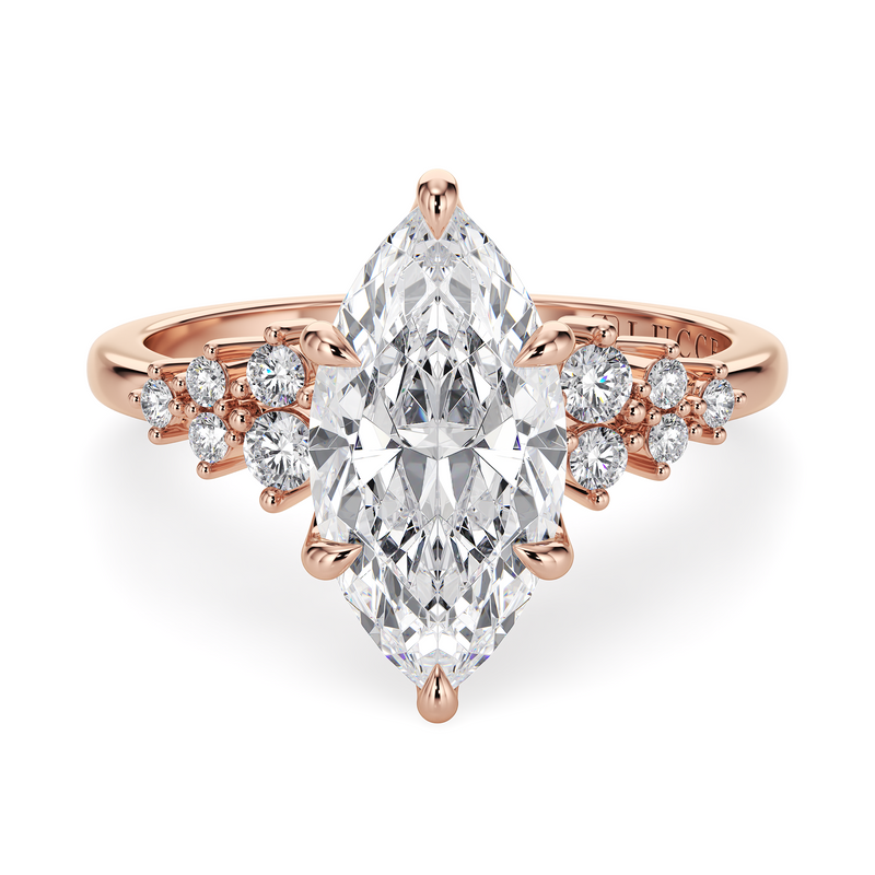 This forever piece features a delicate cluster setting with Lucce's signature petal prongs, forming a bloom of scattered pink diamond blossoms. This marquise cut diamond engagement ring's cluster of stones also symbolizes the beautiful differences between you, each unique, yet coming together in perfect harmony. This ring symbolizes your promise to stay with her because your love is beautifully real.