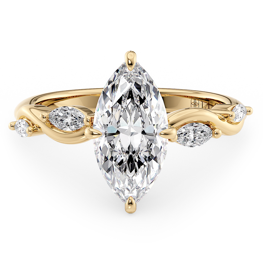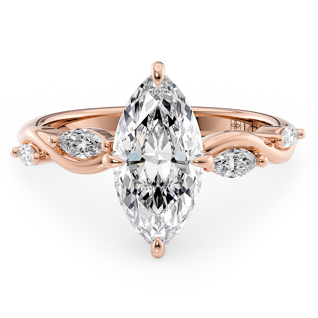 This forever piece features a low profile setting and marquise-cut diamonds nestled in twisting vines, elements that echo Lucce’s iconic emblem. This marquise cut diamond engagement ring's low setting mirrors the kind of love you share, quiet and grounded yet full of depth and meaning. The marquise diamonds in twisting vines form an infinity design, representing a love that is forever true and constant through all times.
