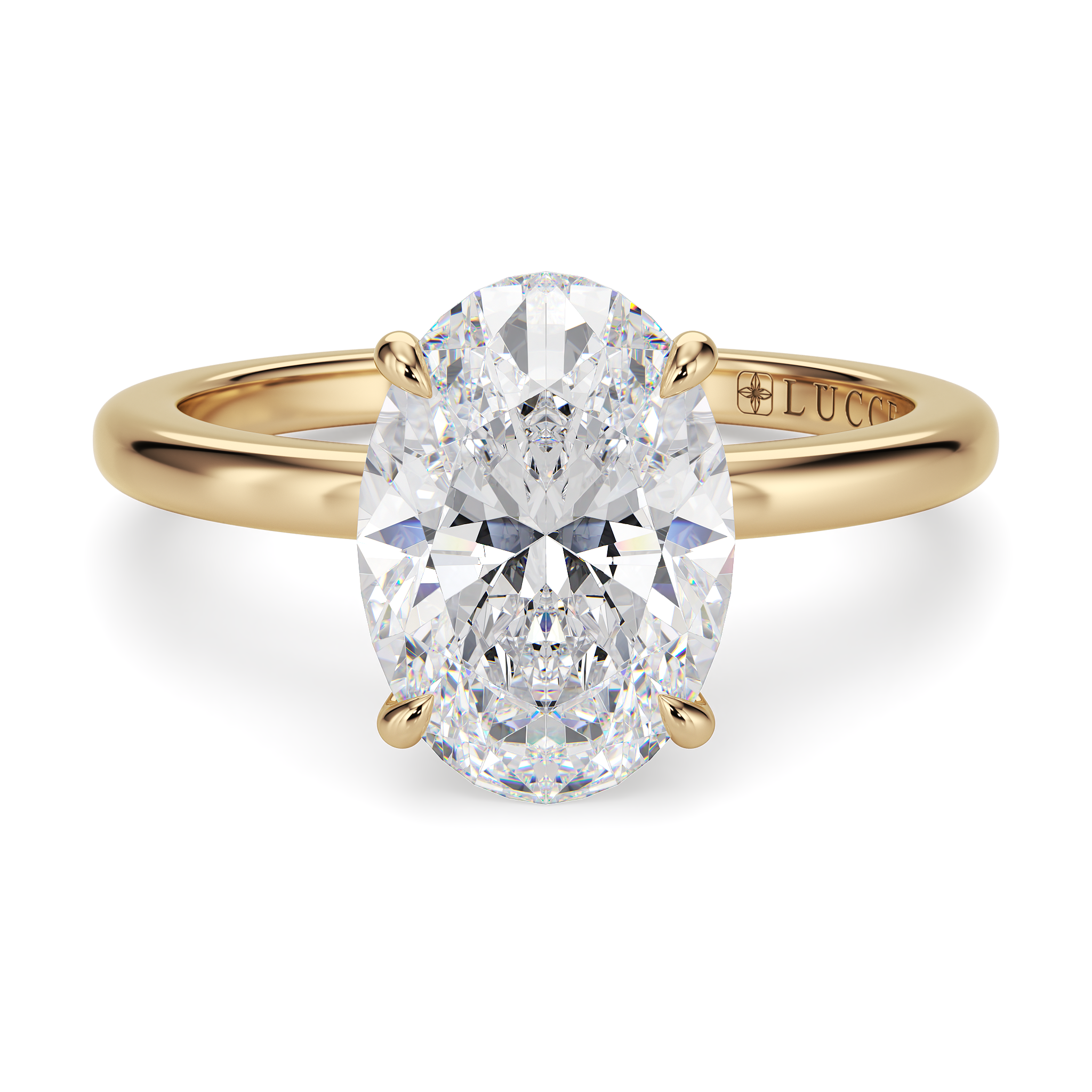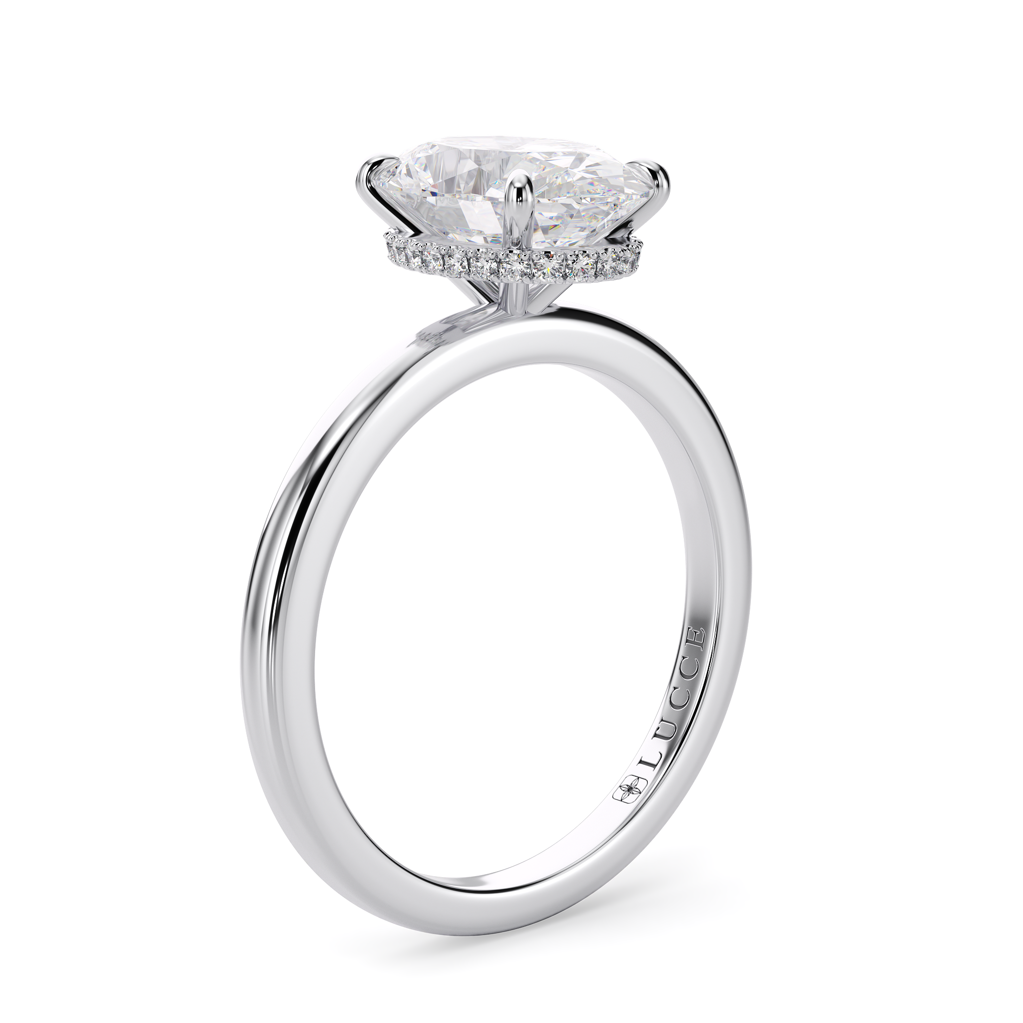 This forever piece features a uniquely wrapped hidden halo and a classic solitaire band. From the top, this oval cut diamond engagement ring appears simple and elegant, but from another angle, a hidden sparkle is revealed, just like her and the quiet depth of the love you share. The wrapped halo symbolizes your heartfelt promise to keep her safe, embraced in your arms and cherished for all the days to come.