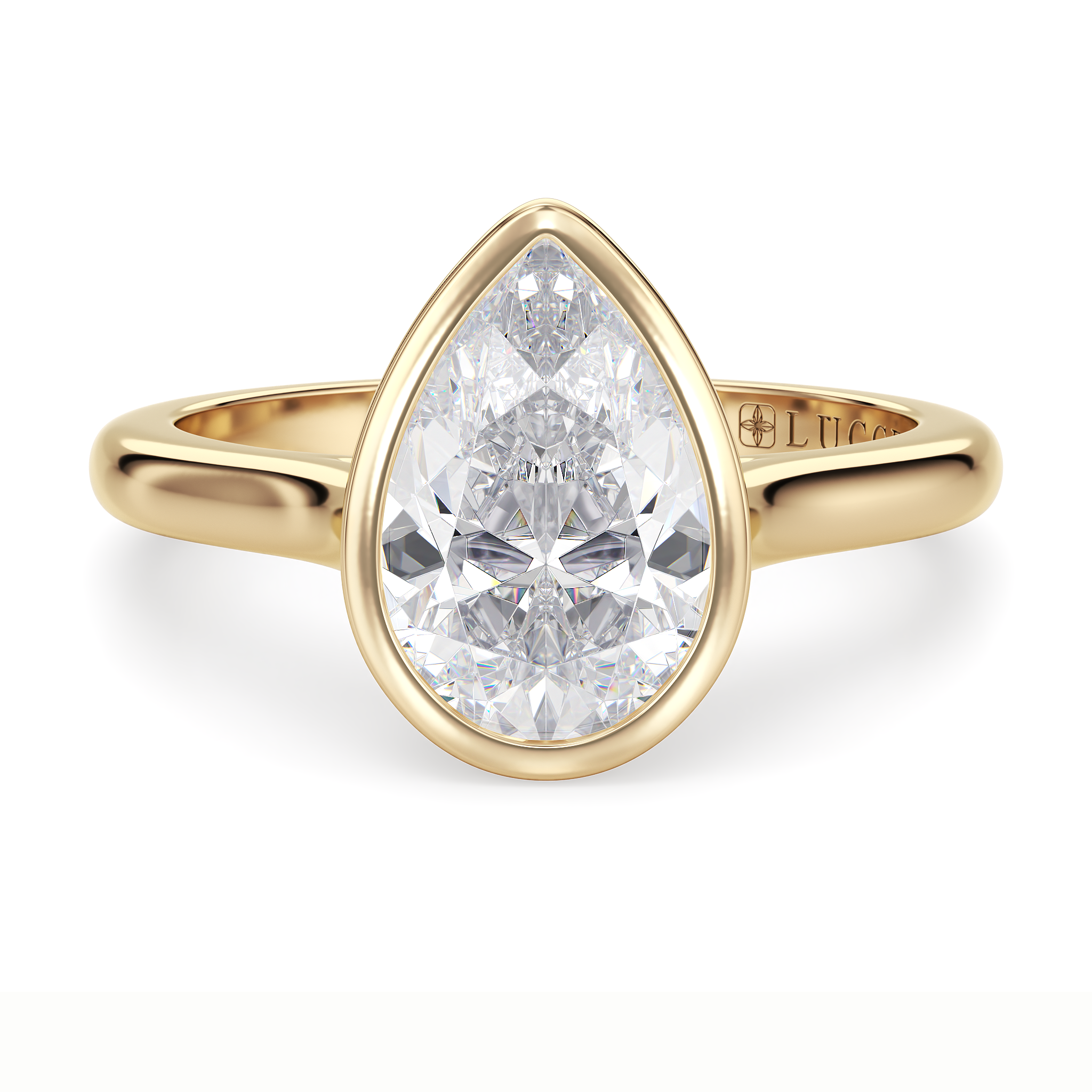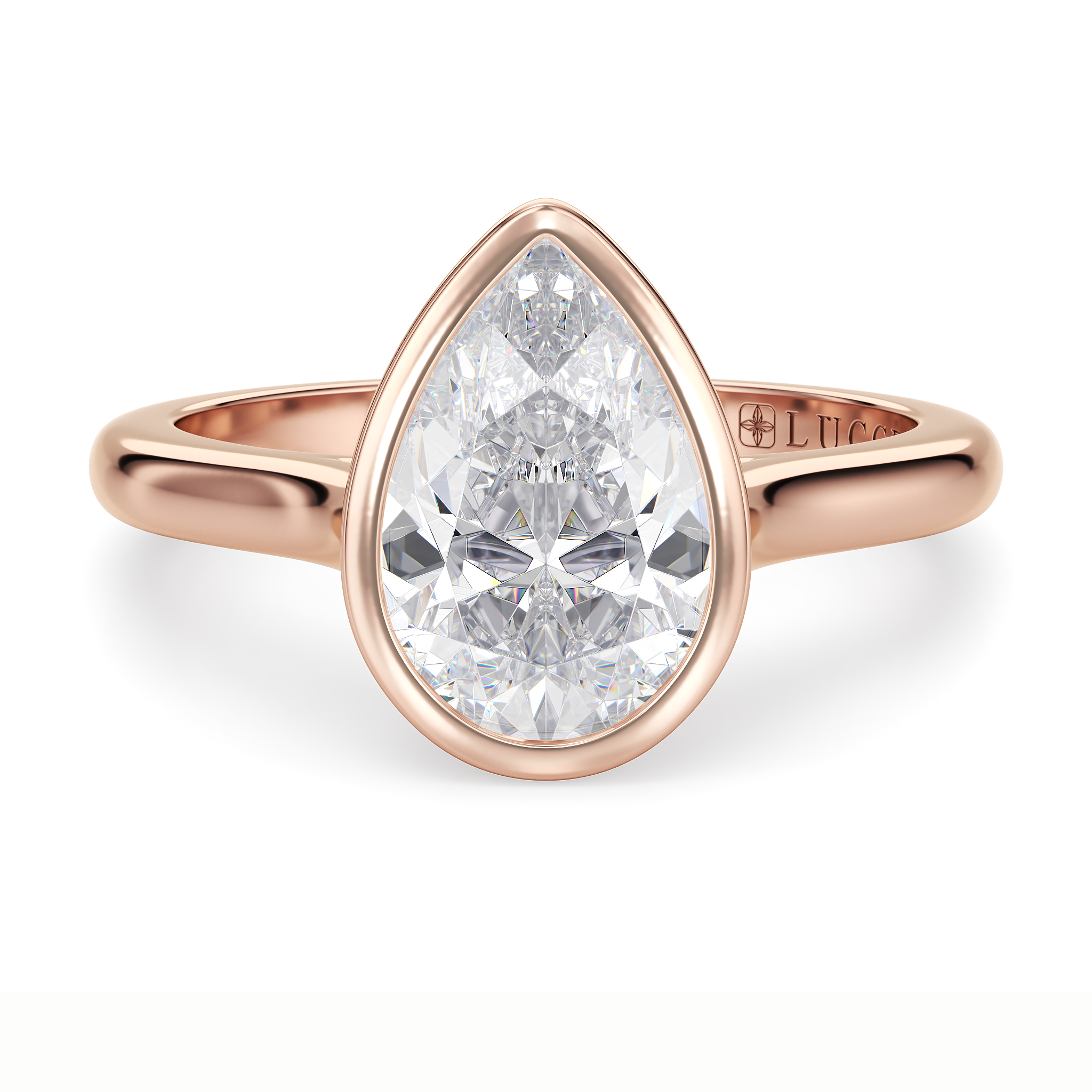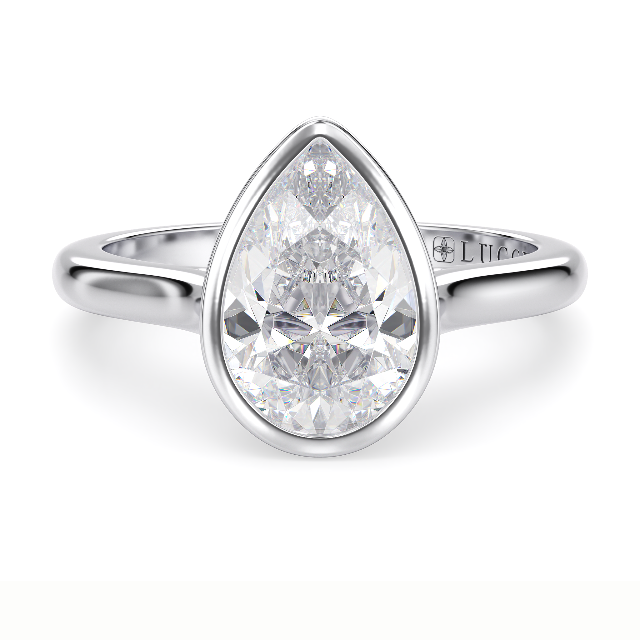 This forever piece is Lucce’s graceful interpretation of a pear cut diamond engagement ring in a bezel setting. The bezel gently cradles the diamond, symbolizing your promise to protect her with all your heart and hold her close forever. Beneath it, the soft petals unfold, echoing the love that continues to bloom beautifully, nurtured and tenderly safeguarded by your devotion.