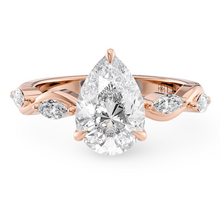 This forever piece features Lucce’s signature petal prongs and marquise-cut diamonds nestled in graceful, twisting vines. This pear cut diamond engagement ring's delicate petal prongs symbolize her beauty, like a flower in eternal bloom, capturing the grace, warmth, and gentle strength that make her truly unforgettable. The marquise diamonds in twisting vines form an infinity design, representing a love that is forever true and constant through all times.