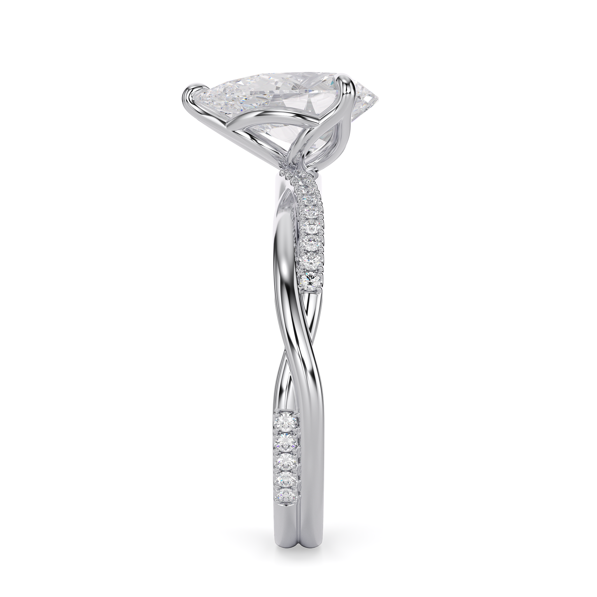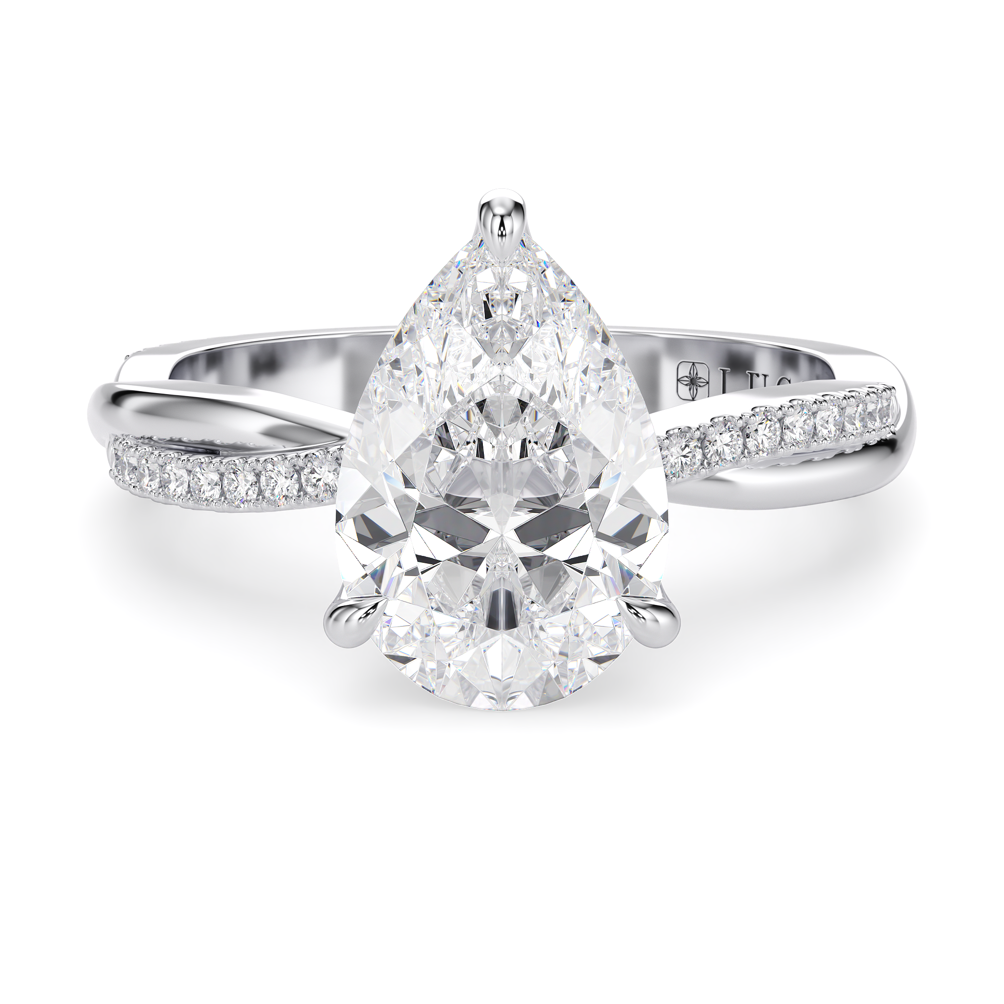 This forever piece features a twisting accented band and Lucce’s signature petal prongs. This pear cut diamond engagement ring's vine-like band symbolizes two lives intertwined by love, forming an infinity that speaks of a bond that is unbreakable. Like a delicate flower found in vines, it reflects how you found her, beautiful, one-of-a-kind, and meant to be.