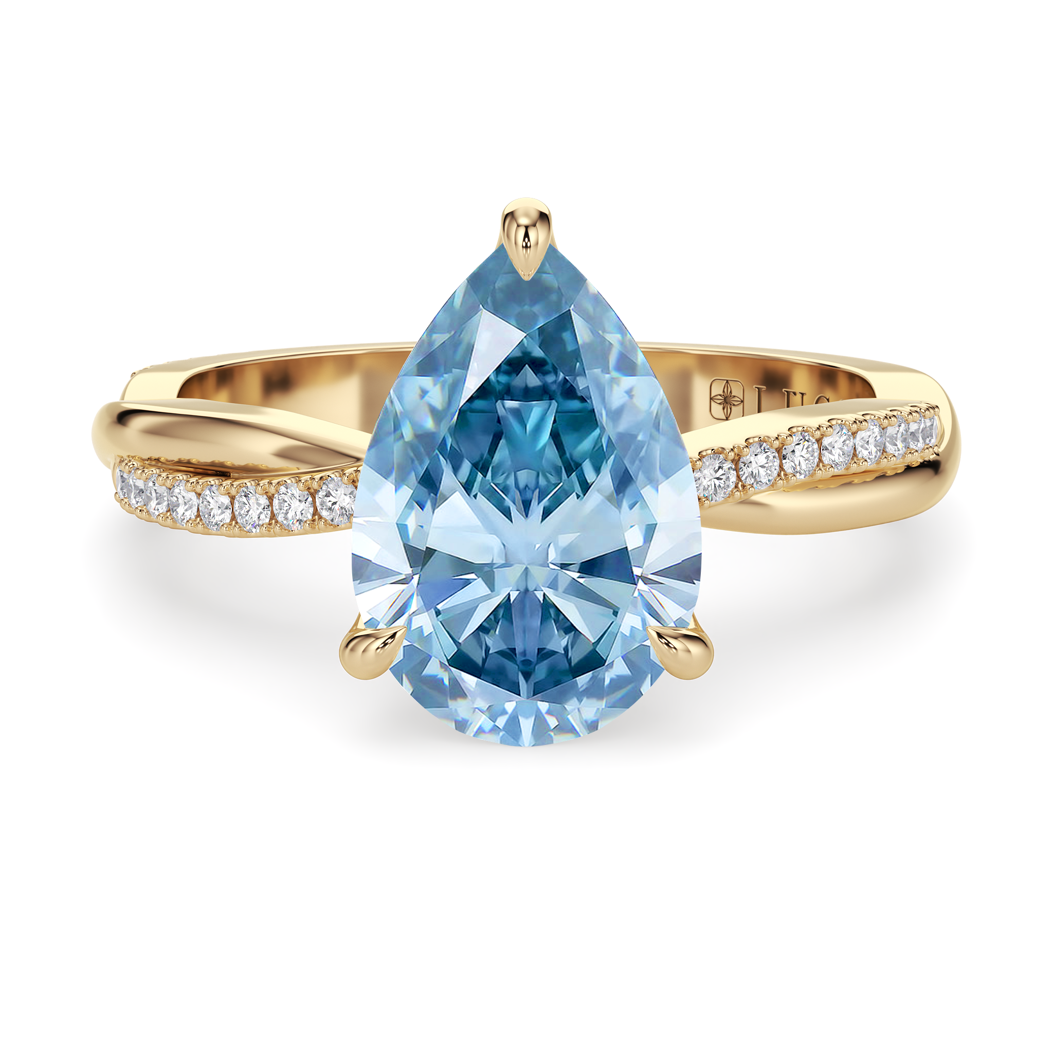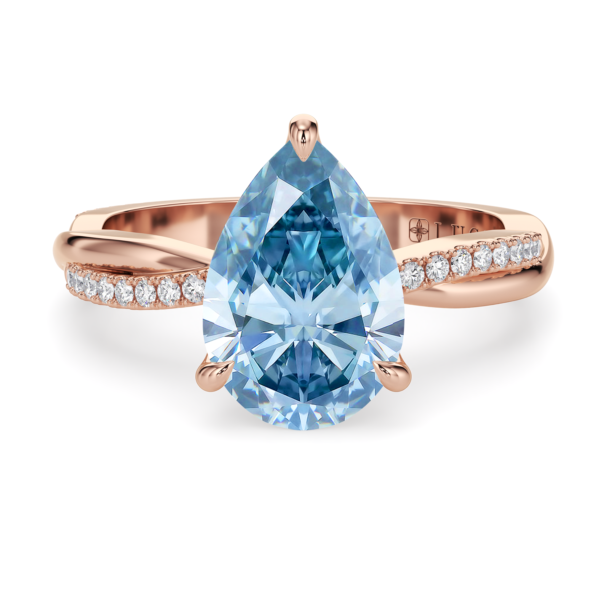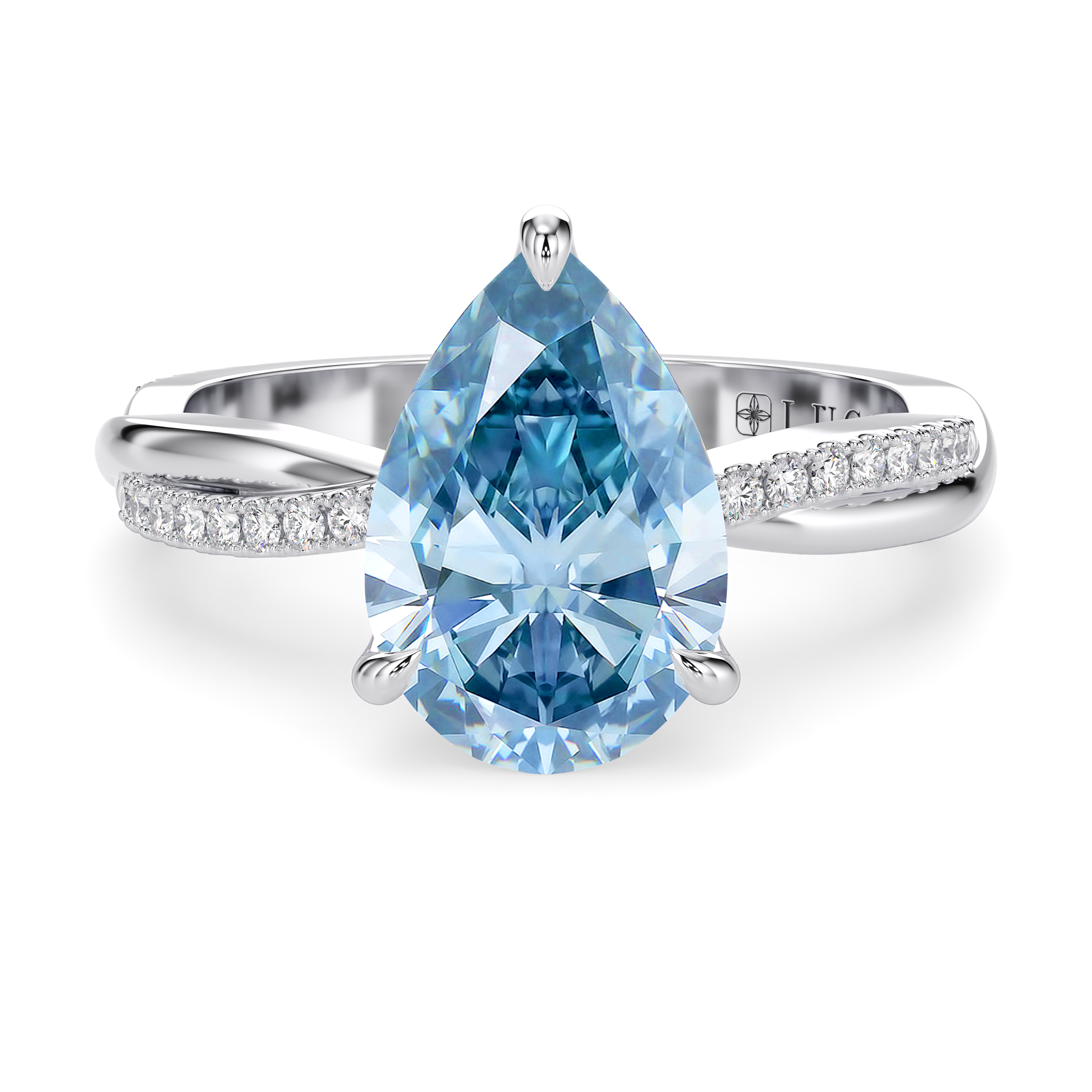 This forever piece features a twisting accented band and Lucce’s signature petal prongs. This pear cut blue diamond engagement ring's vine-like band symbolizes two lives intertwined by love, forming an infinity that speaks of a bond that is unbreakable. Like a delicate flower found in vines, it reflects how you found her, beautiful, one-of-a-kind, and meant to be.