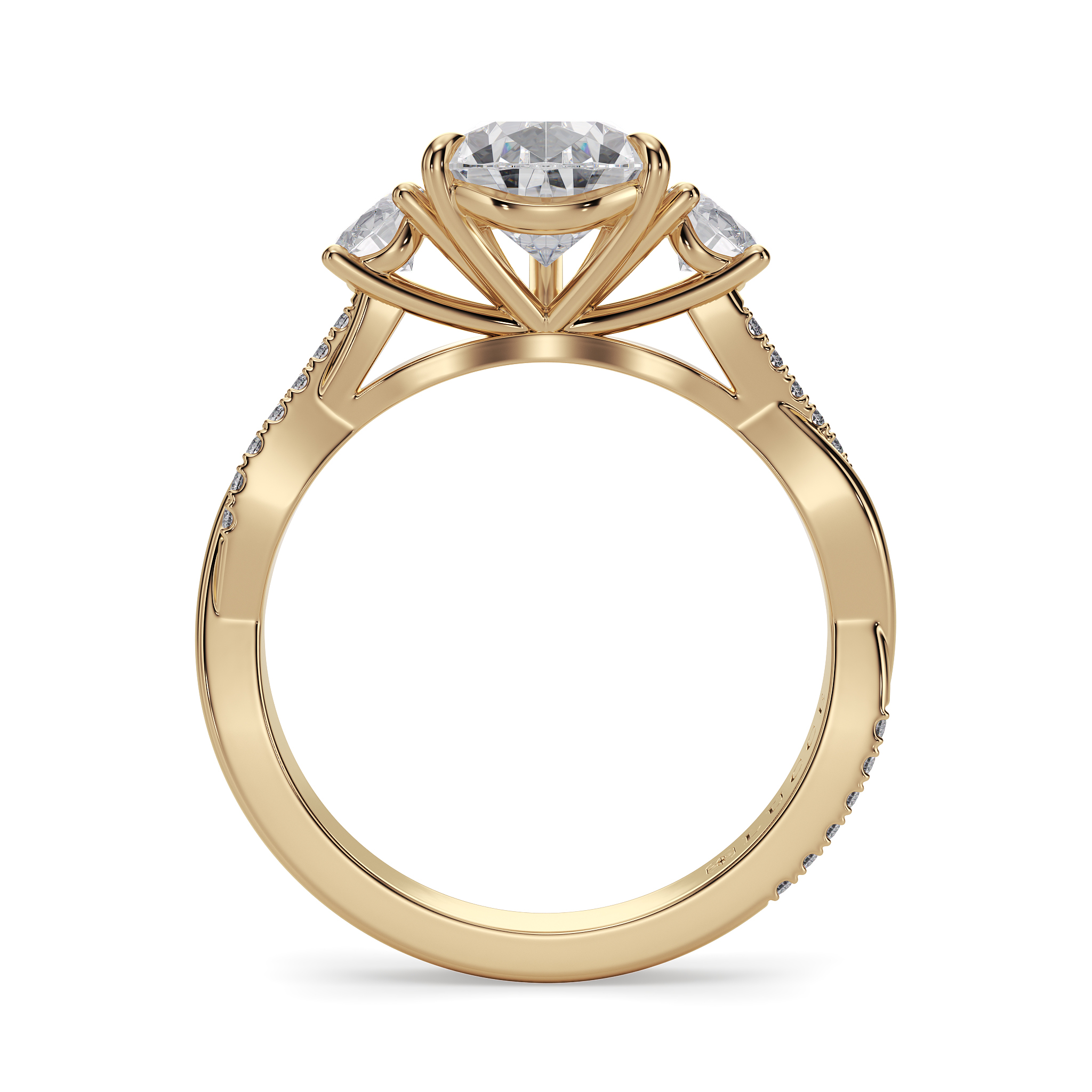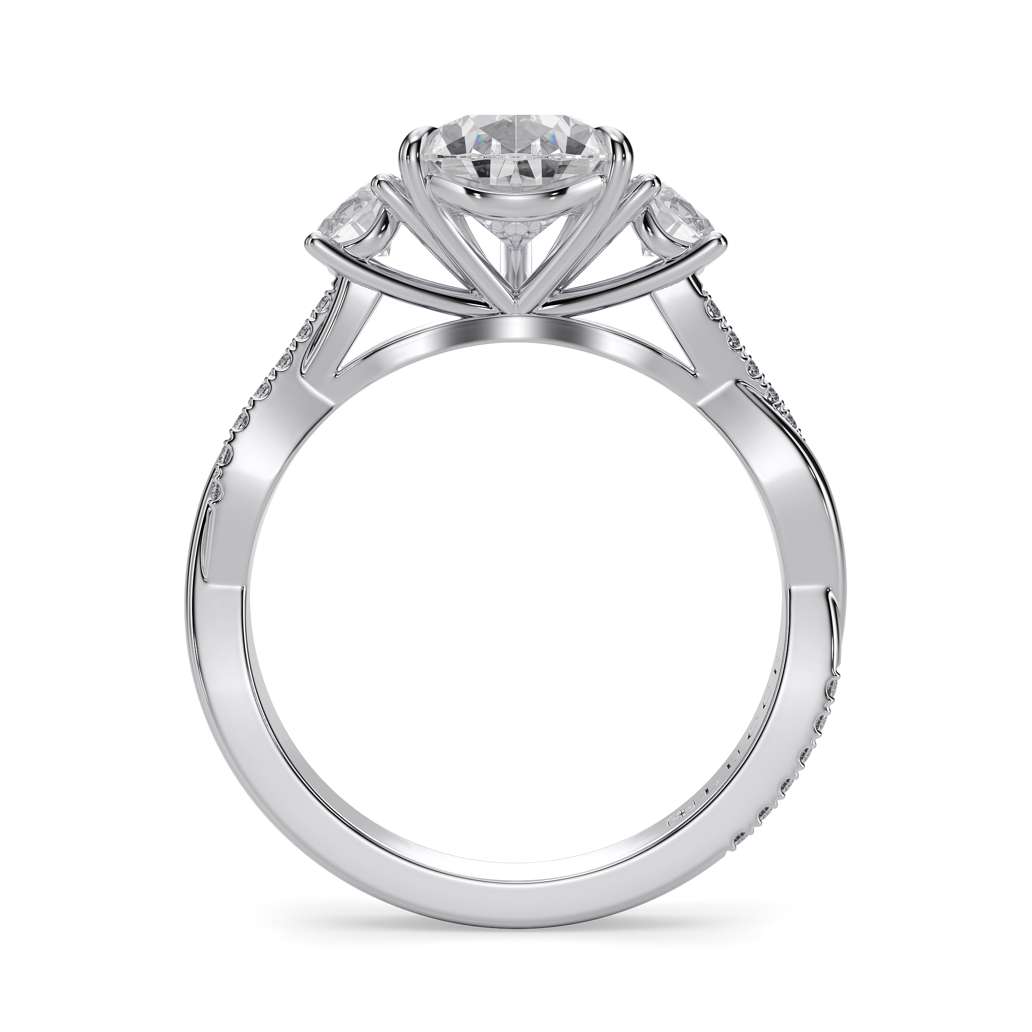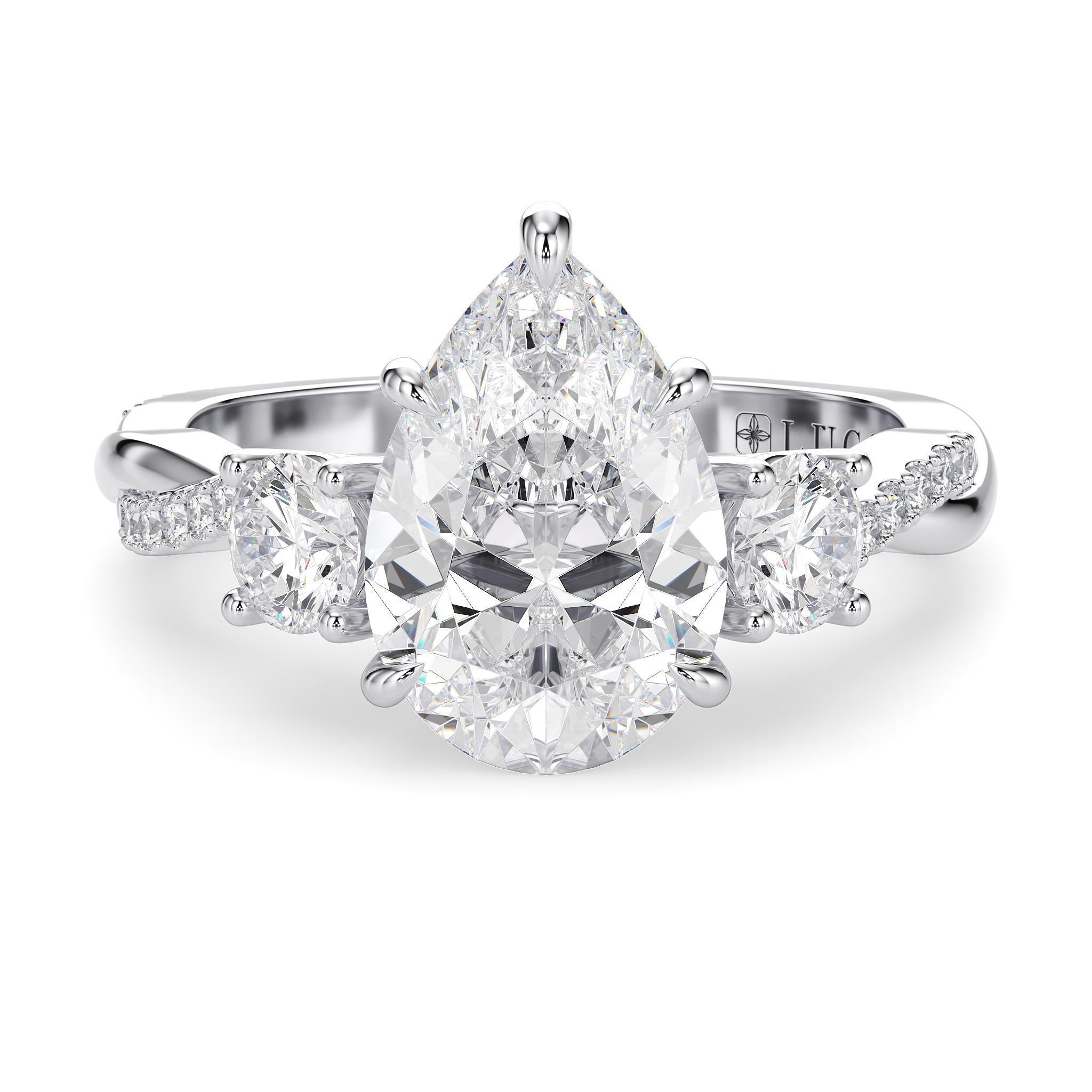 This forever piece showcases a graceful medley of a three-stone setting and a delicately twisting band. This pear cut diamond engagement ring's trio of stones blooms like a bouquet of flowers, each gem representing the love you've shared in the past, share in the present, and will share in the future. The vine-like band gently weaves around them, symbolizing two lives intertwined by love, forming an infinity that speaks of a bond that is unbreakable.
