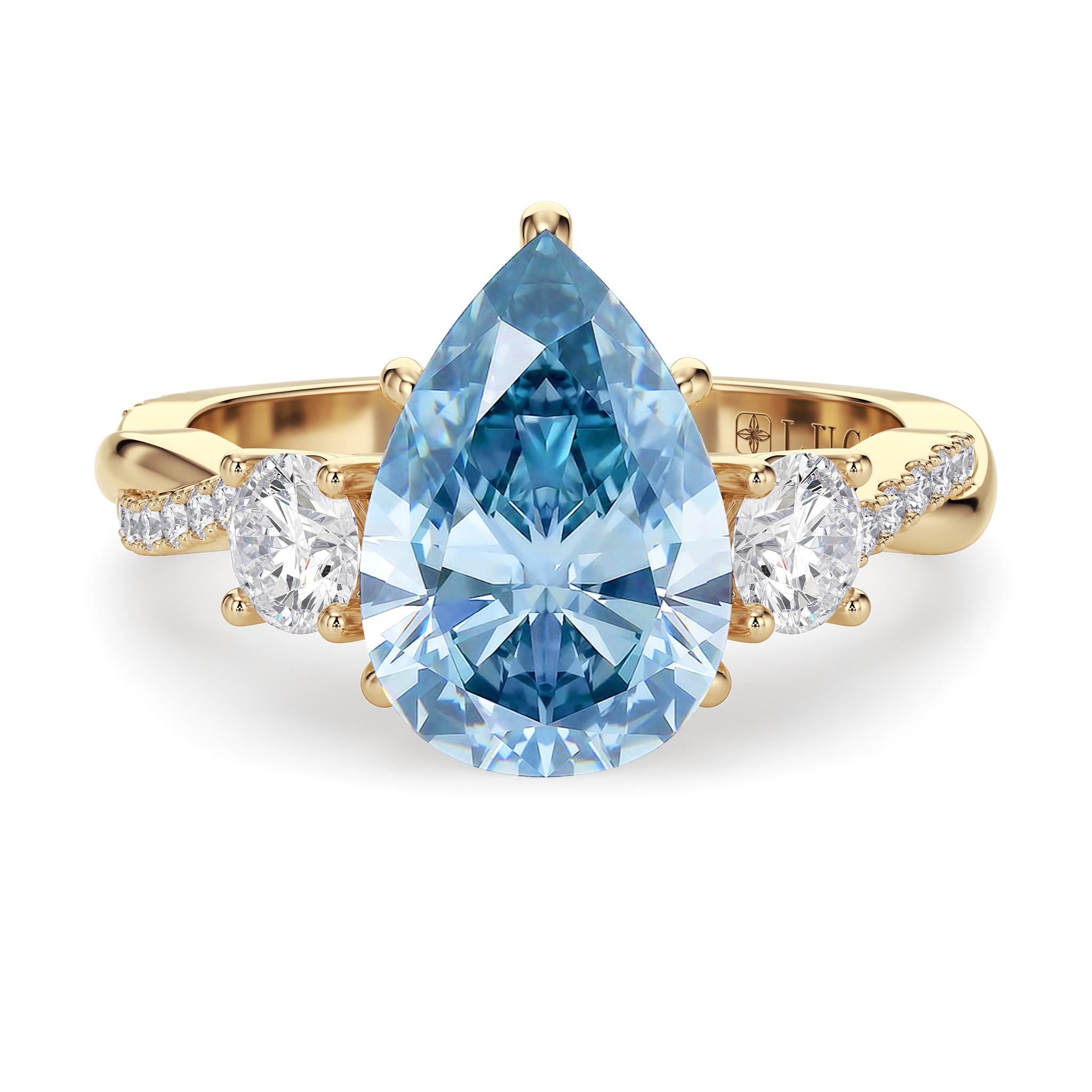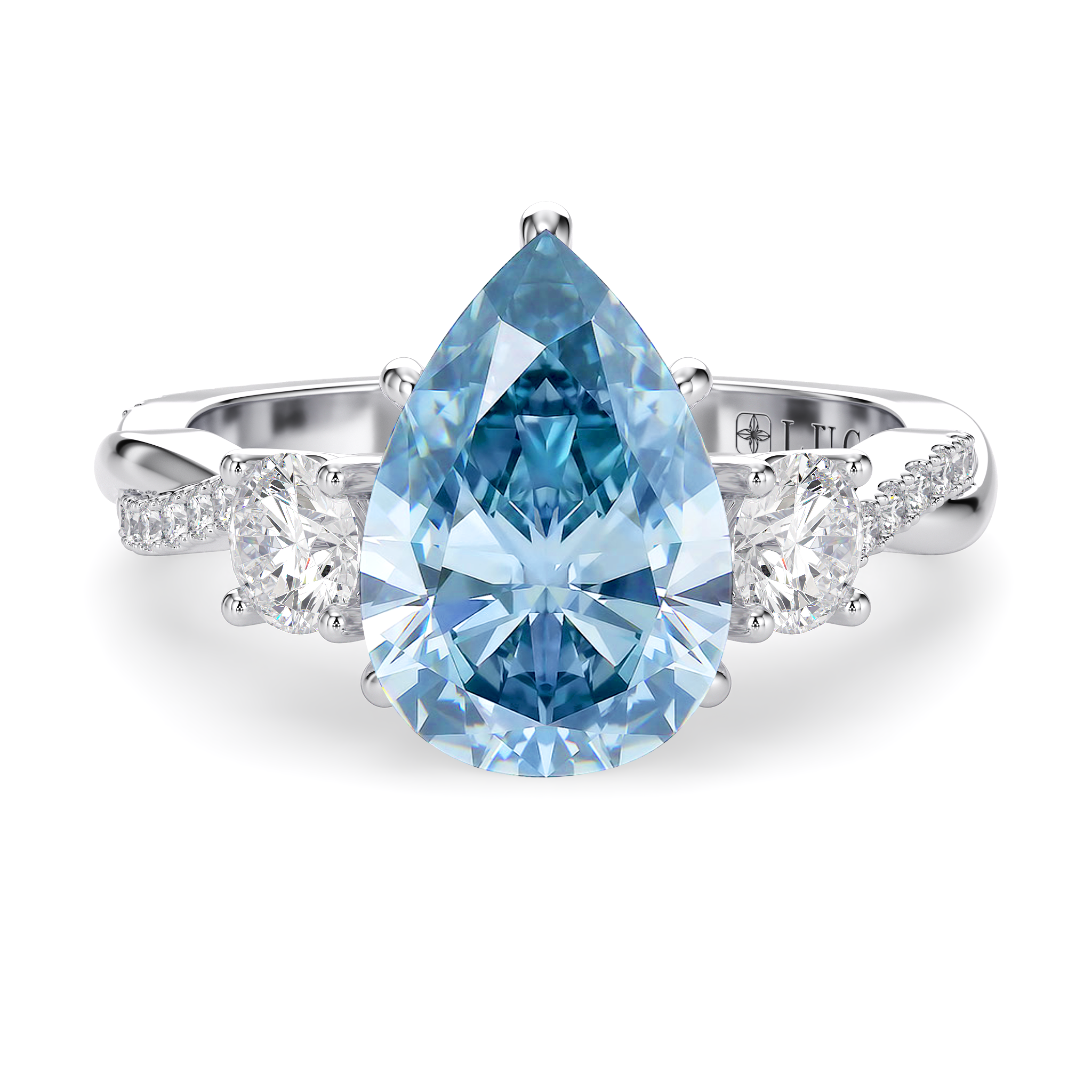 This forever piece showcases a graceful medley of a three-stone setting and a delicately twisting band. This pear cut blue diamond engagement ring's trio of stones blooms like a bouquet of flowers, each gem representing the love you've shared in the past, share in the present, and will share in the future. The vine-like band gently weaves around them, symbolizing two lives intertwined by love, forming an infinity that speaks of a bond that is unbreakable.