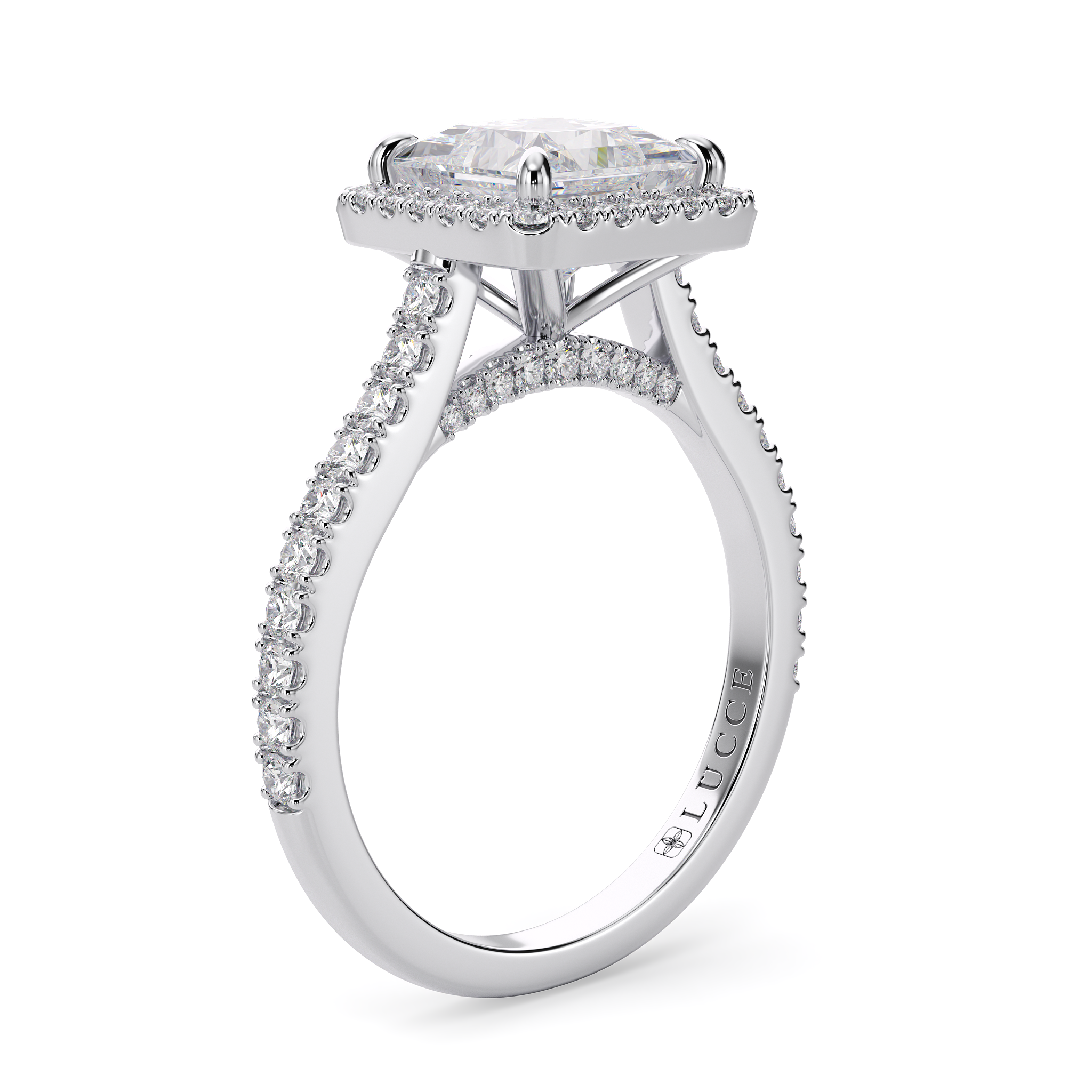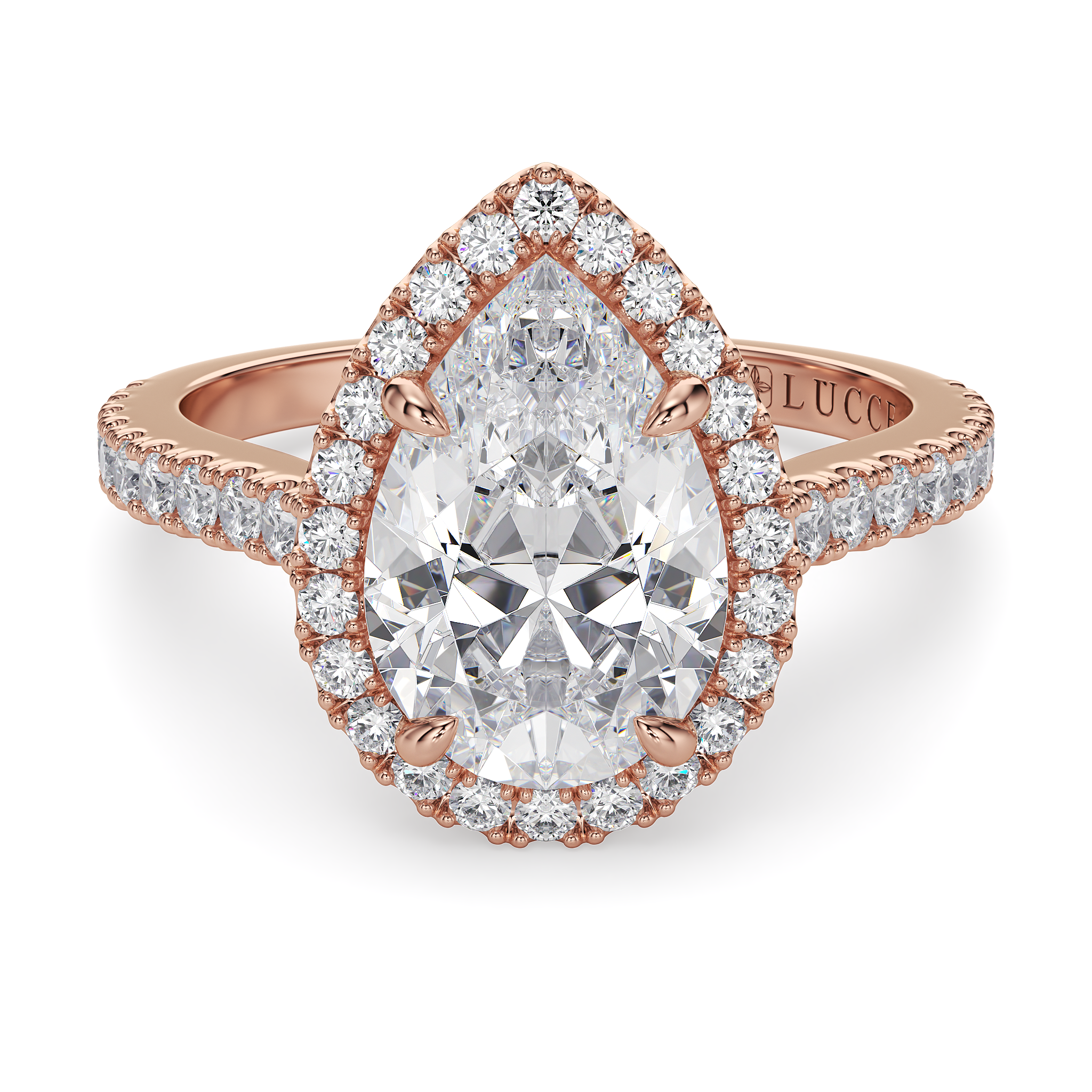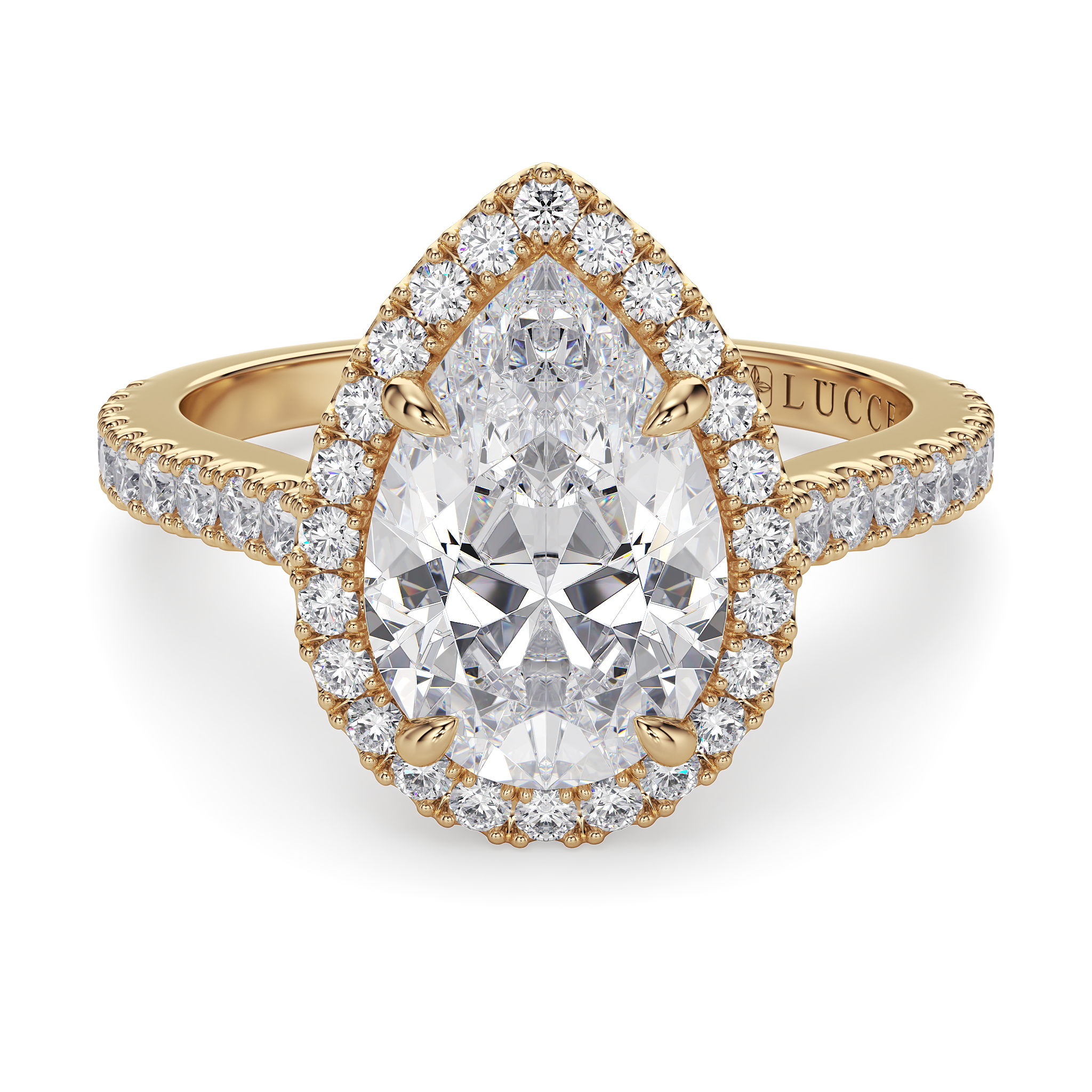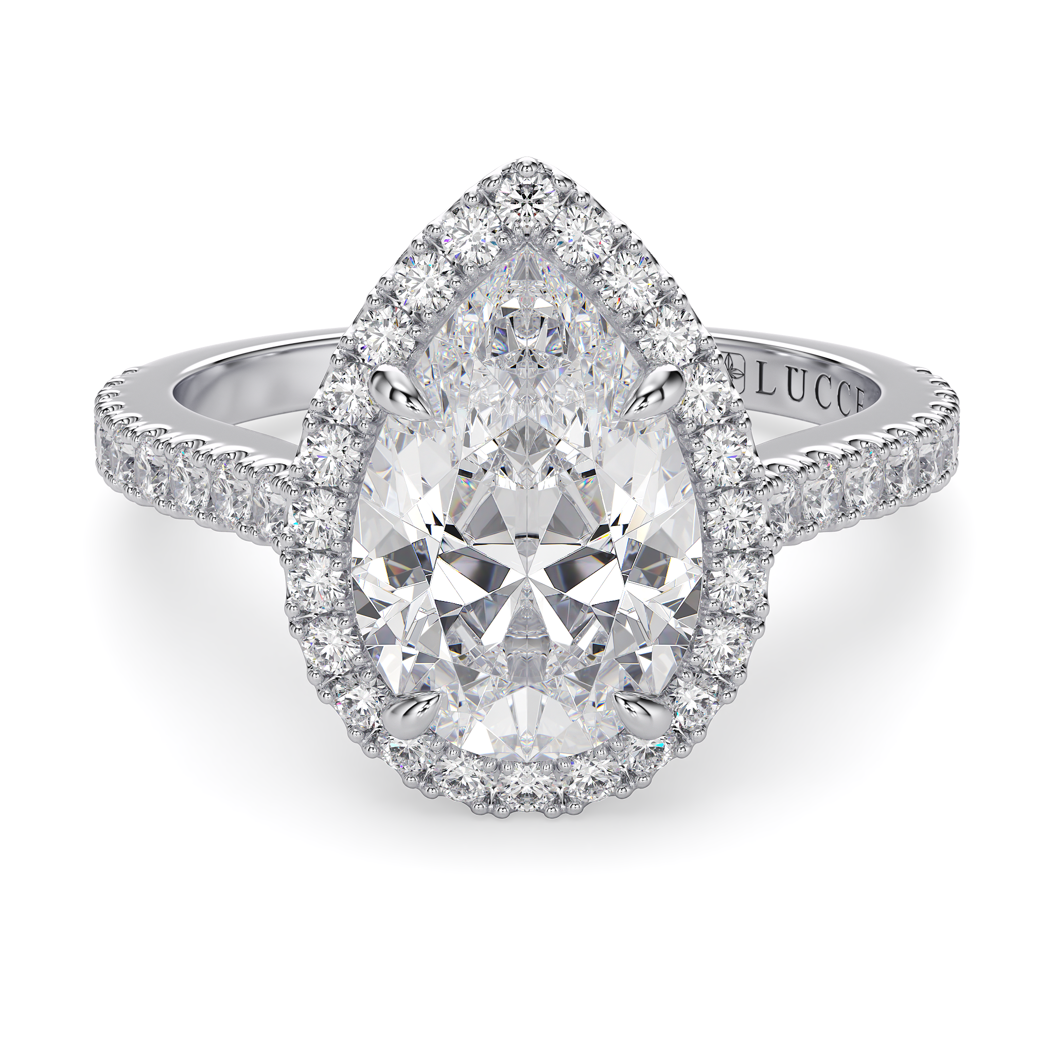 This forever piece features a halo pavé setting with Lucce’s signature tapered bridge. This pear cut diamond engagement ring's timeless design speaks of a love without end, just like the halo itself. And like the halo of an angel, it reflects how she’s brought light into your life, made you better, and inspired you to be the best partner you can be for her, always.