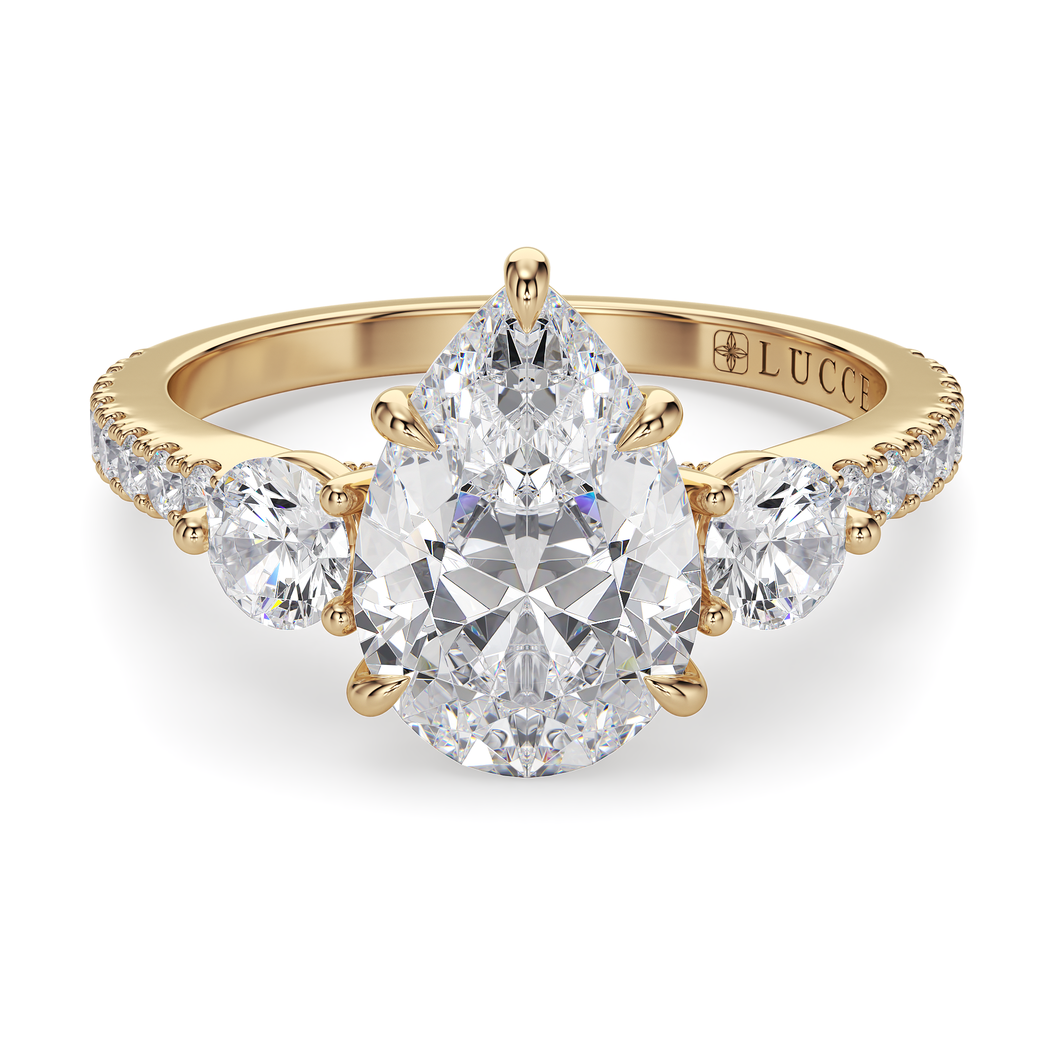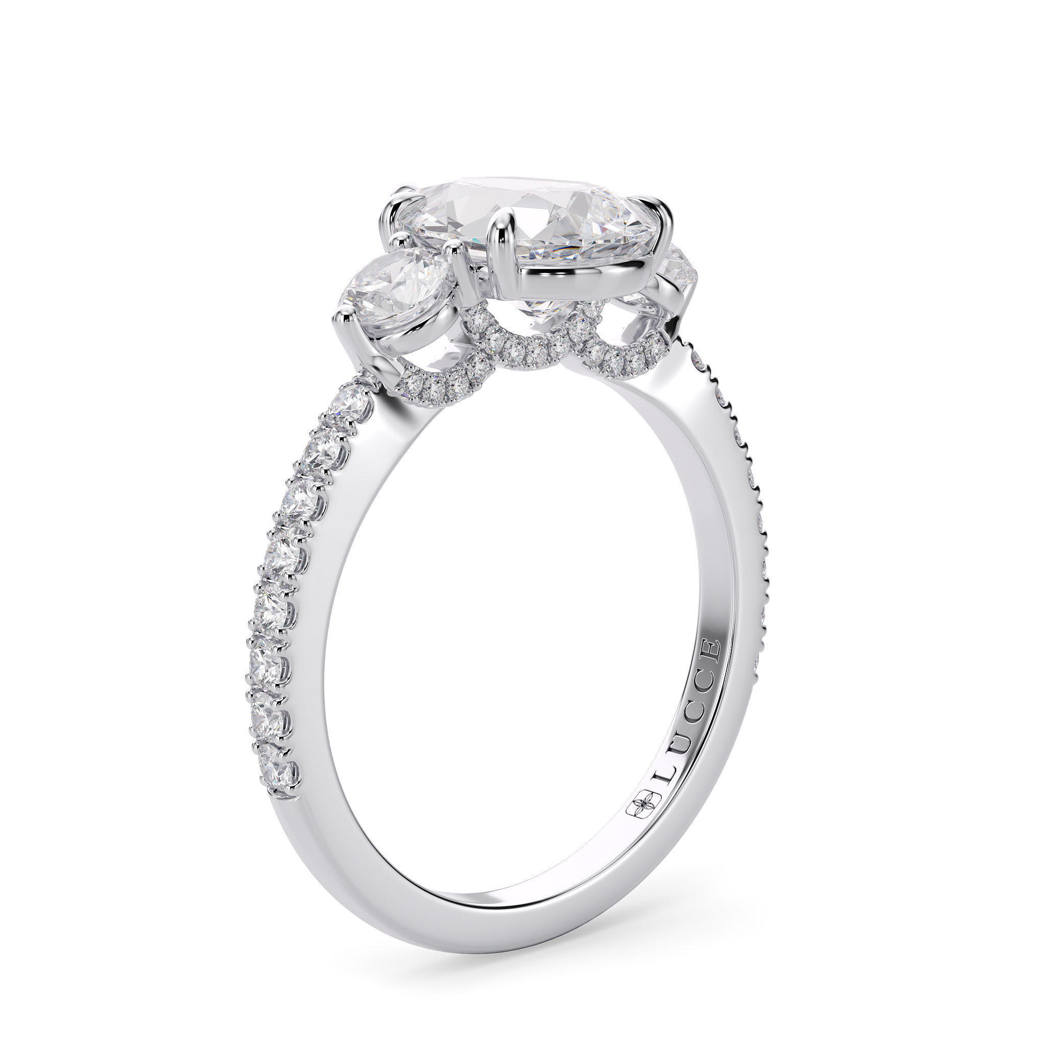 This forever piece features a timeless three-stone setting with hidden, heartwarming accents and a pavé band. Designed to hold a pear-cut center diamond embraced by round side stones, each gem represents a chapter of your love, the past, present, and the future you promise to build together. The hidden accents reflect the quiet kind of love you share, the kind that needs no display, only the two of you to feel its depth.