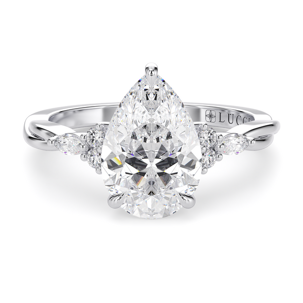 Like the oval and marquise cuts, the flattering pear shape engagement ring elongates the finger—especially when worn with the point facing the nail.
