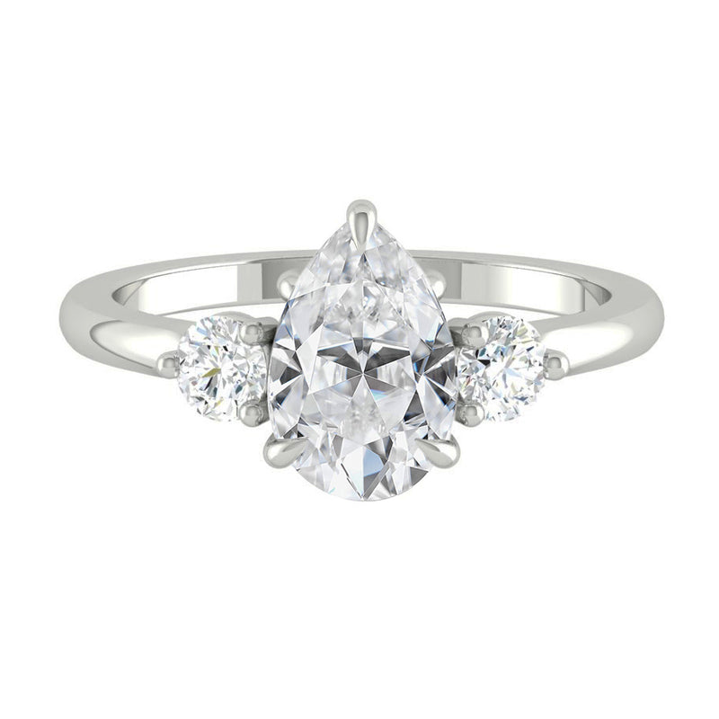 Made for the most special woman. Her one-of-a-kind beauty deserves a ring without comparison as characterized by this lovely pear cut center. Framed by two stunning round cuts and cradled by a brilliant scalloped bridge, this is the most exquisite ring that represents your romance at its rarest.