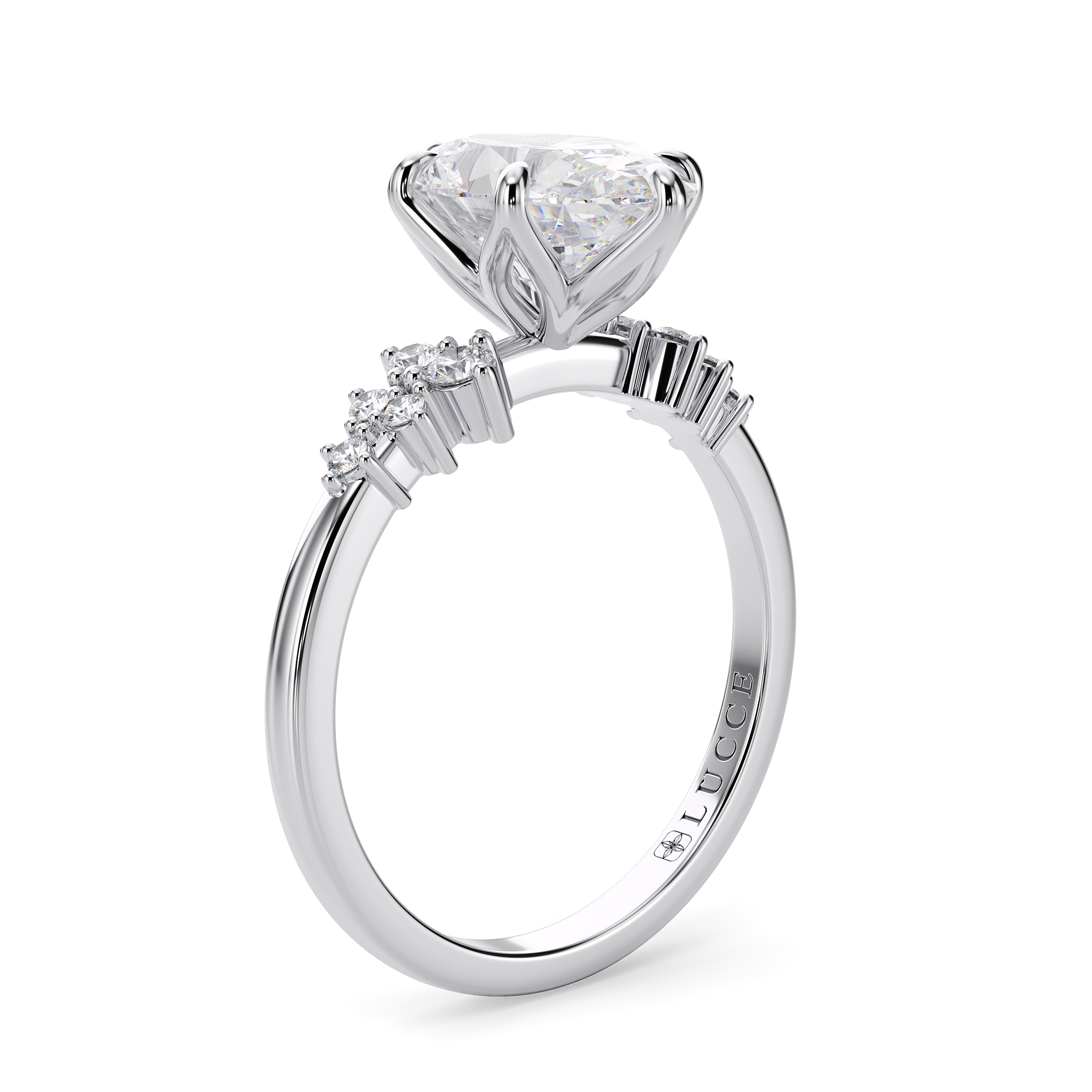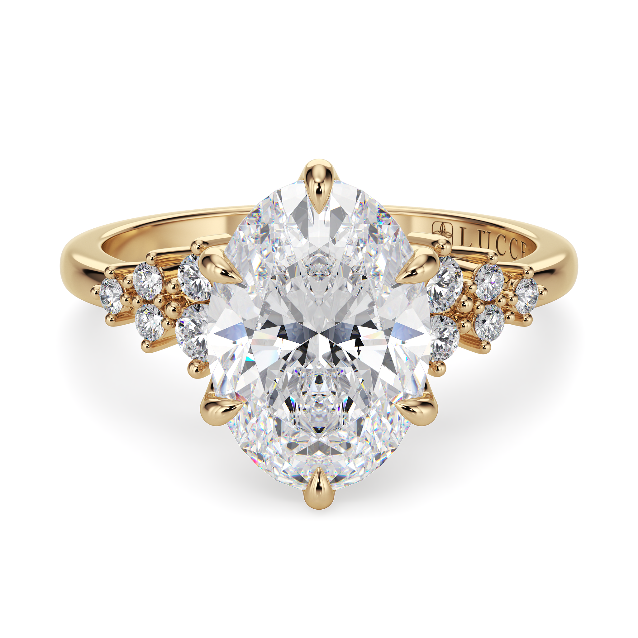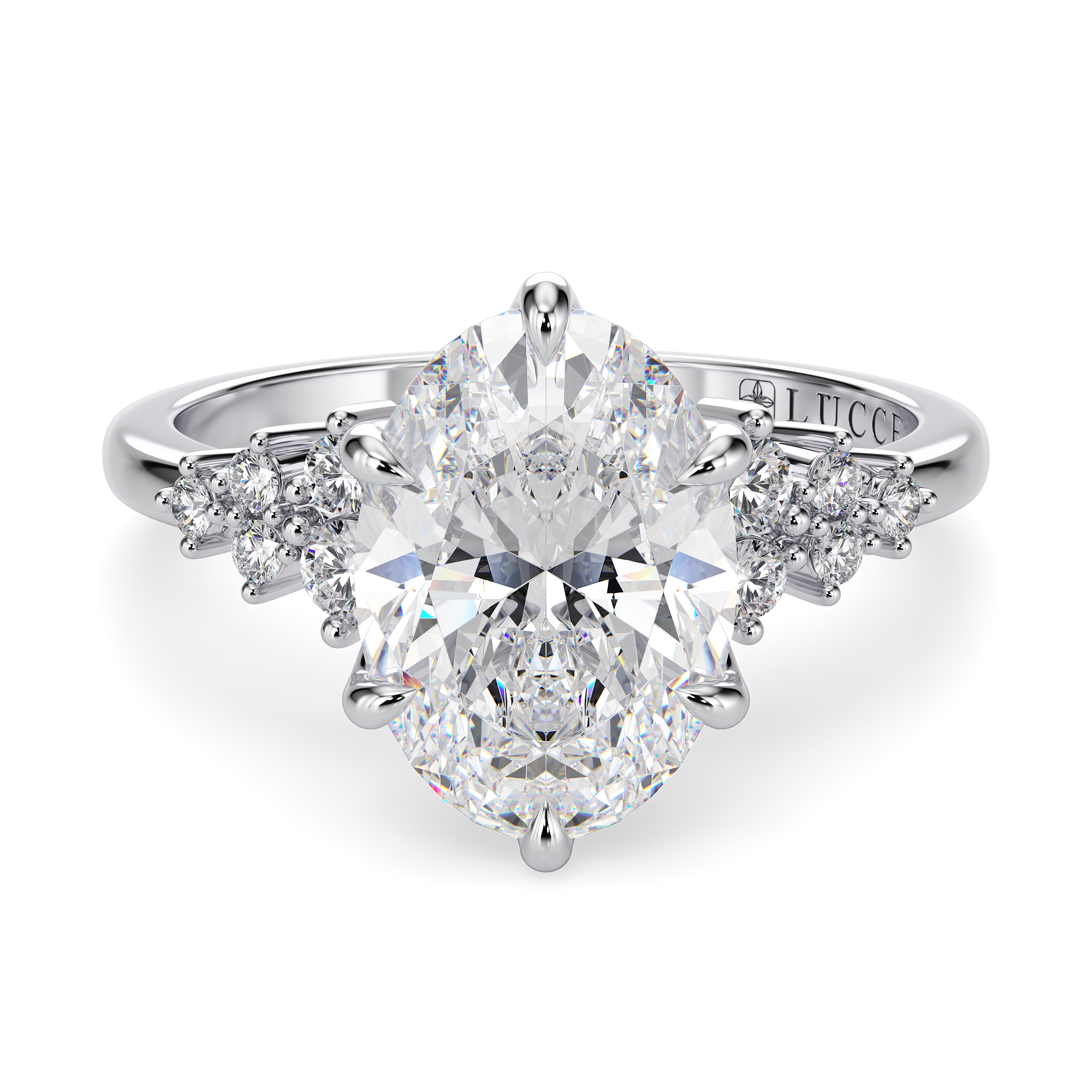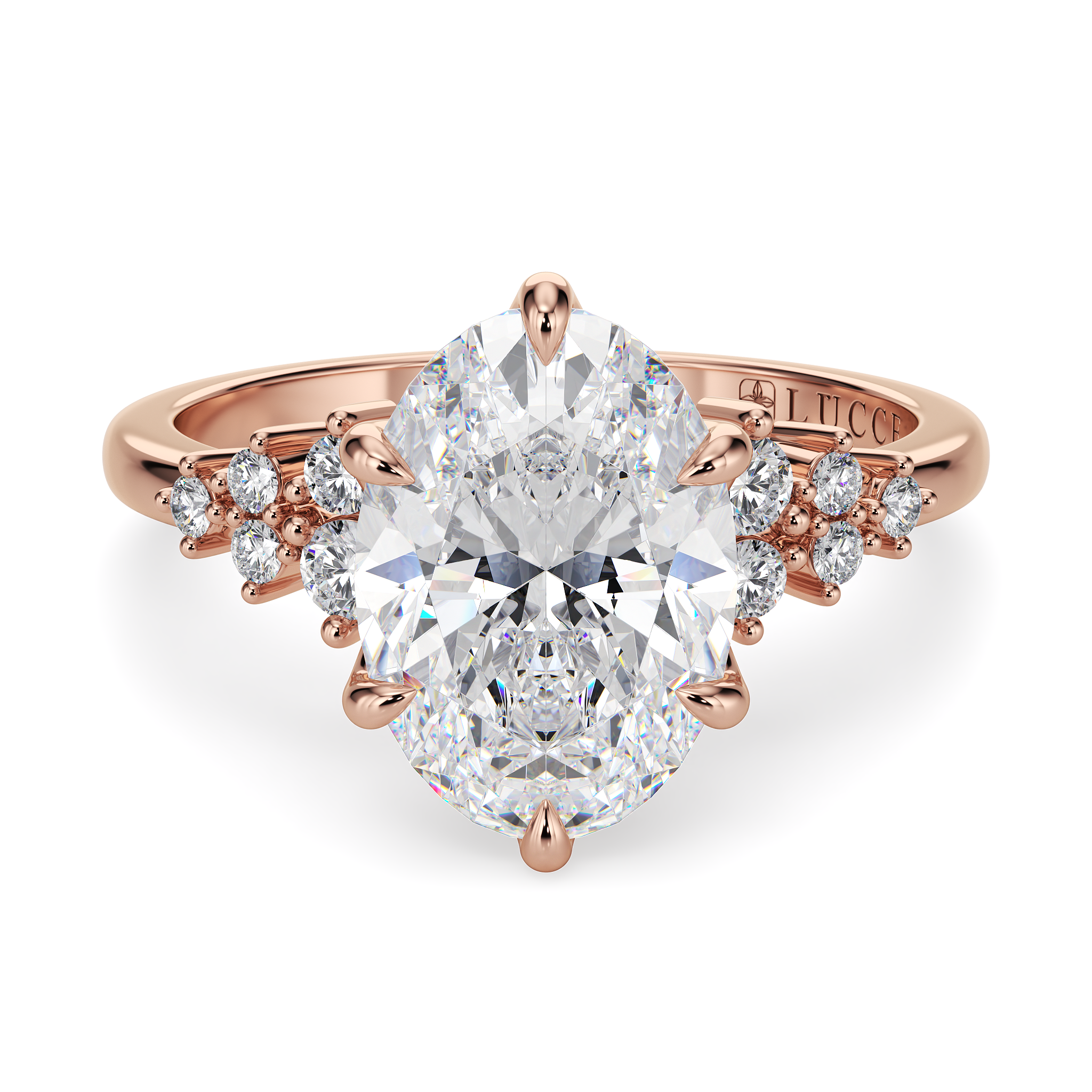 This forever piece features a delicate cluster setting with Lucce's signature petal prongs, forming a bloom of scattered blossoms. This oval cut diamond engagement ring's cluster of stones also symbolizes the beautiful differences between you, each unique, yet coming together in perfect harmony. This ring symbolizes your promise to stay with her because your love is beautifully real.