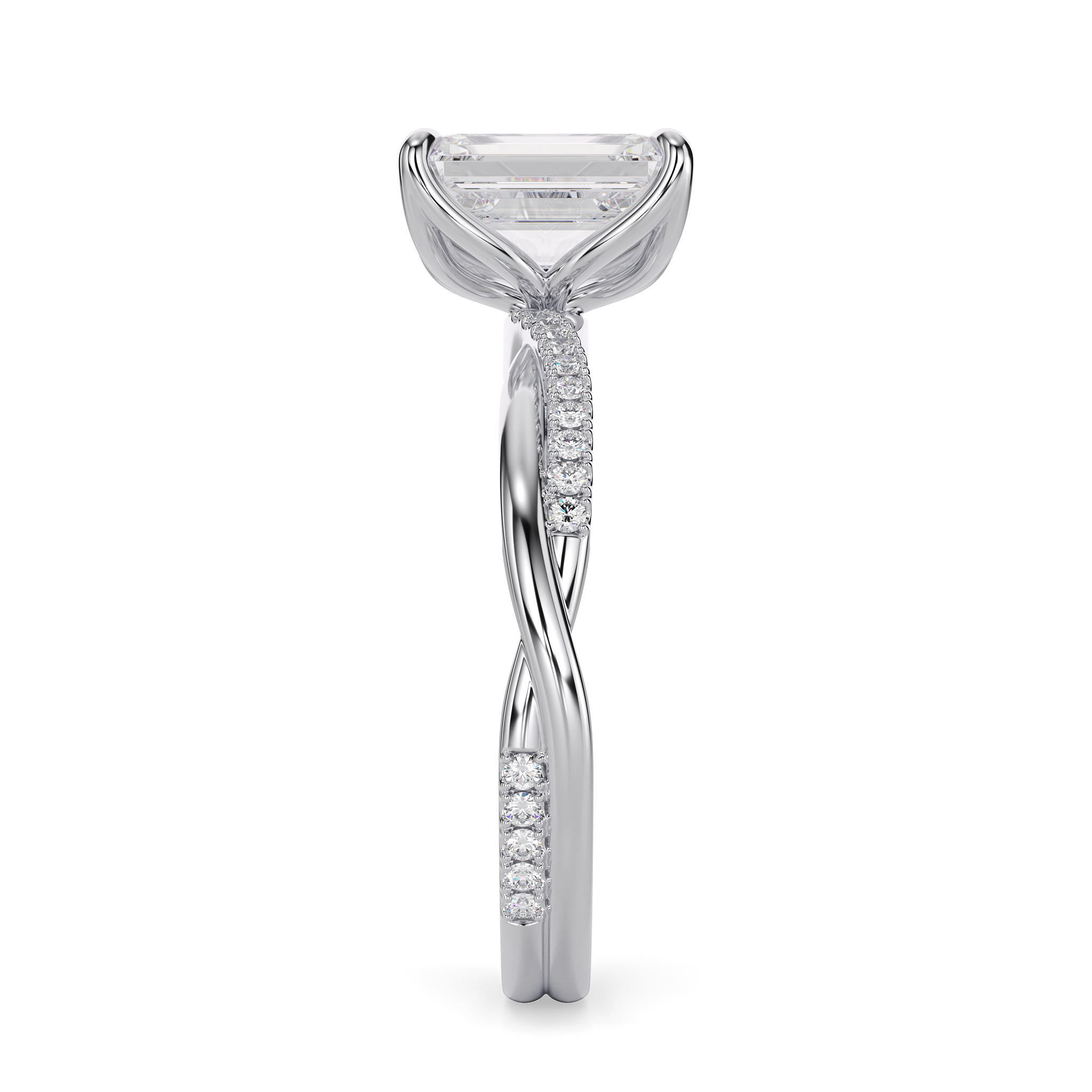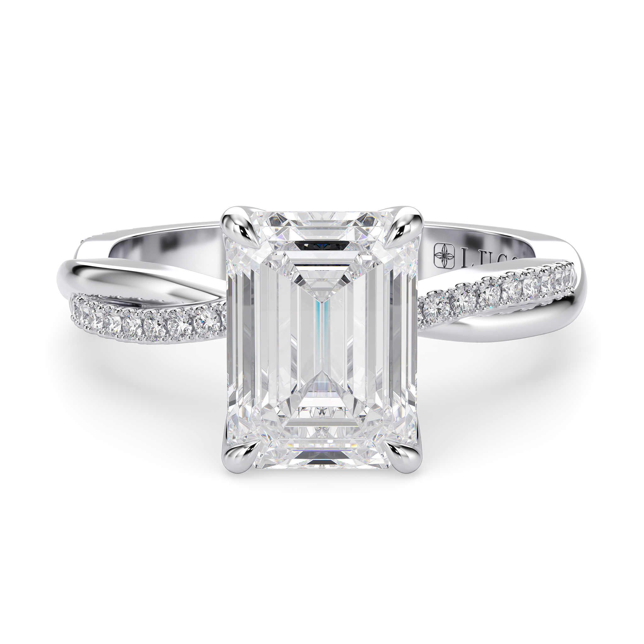 This forever piece features a twisting accented band and Lucce’s signature petal prongs. This emerald cut diamond engagement ring's vine-like band symbolizes two lives intertwined by love, forming an infinity that speaks of a bond that is unbreakable. Like a delicate flower found in vines, it reflects how you found her, beautiful, one-of-a-kind, and meant to be.
