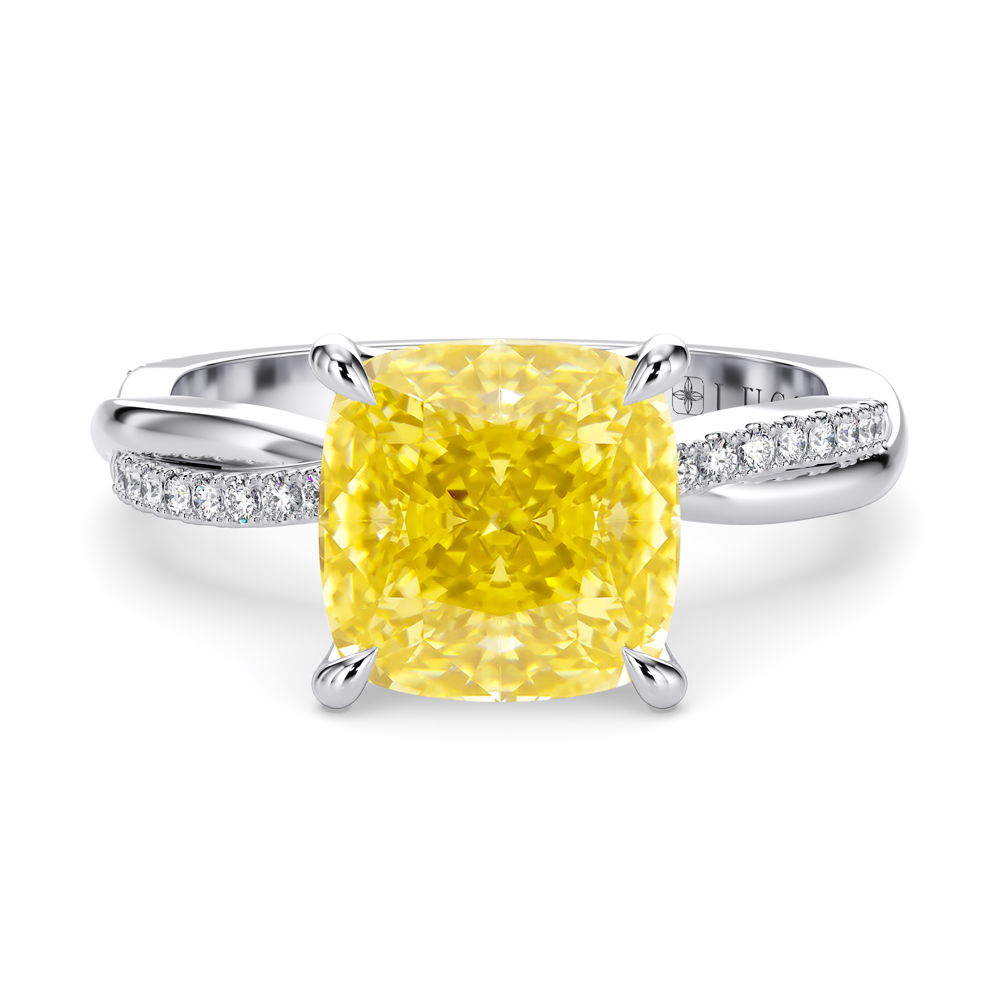 This forever piece features a twisting accented band and Lucce’s signature petal prongs. This cushion cut yellow diamond engagement ring's vine-like band symbolizes two lives intertwined by love, forming an infinity that speaks of a bond that is unbreakable. Like a delicate flower found in vines, it reflects how you found her, beautiful, one-of-a-kind, and meant to be.