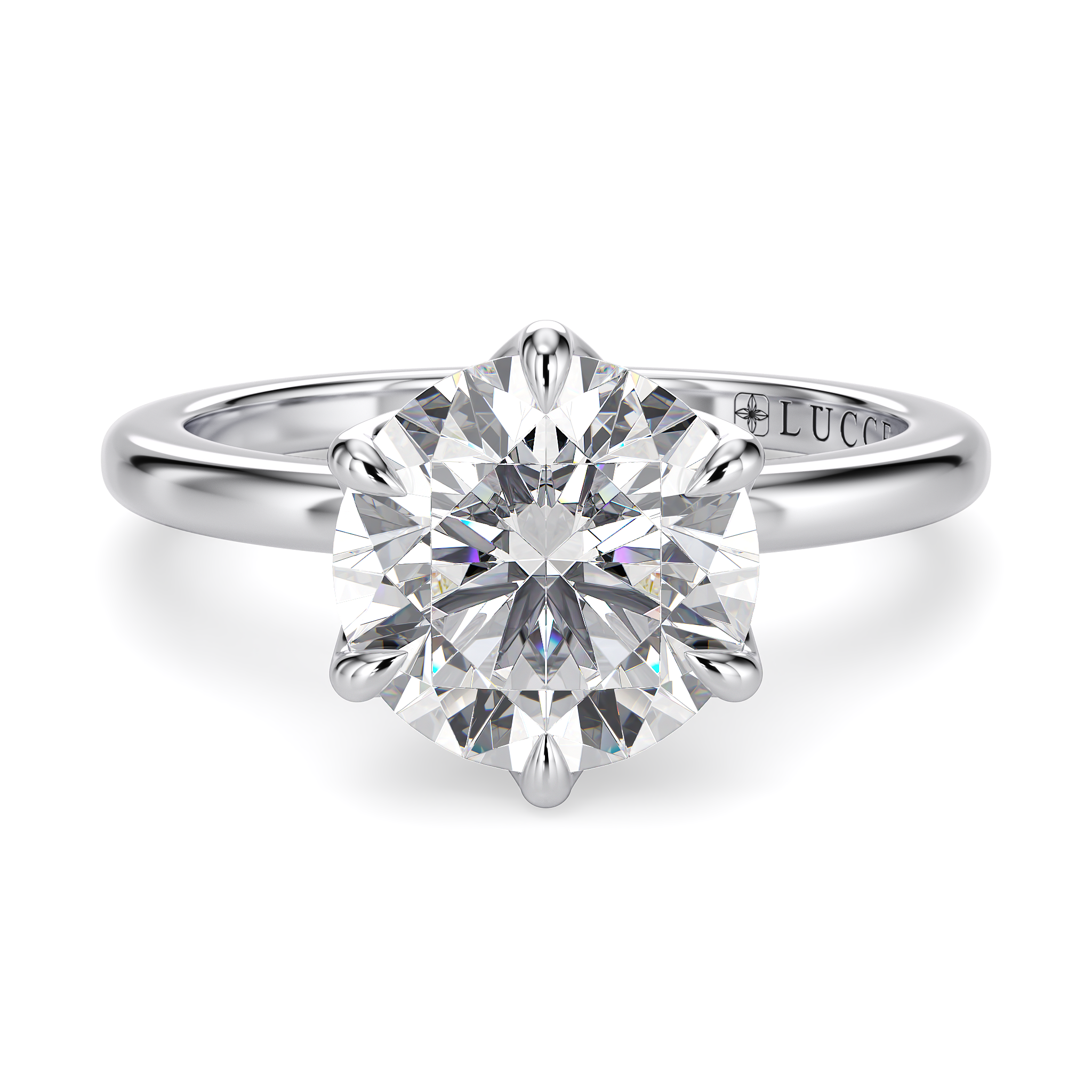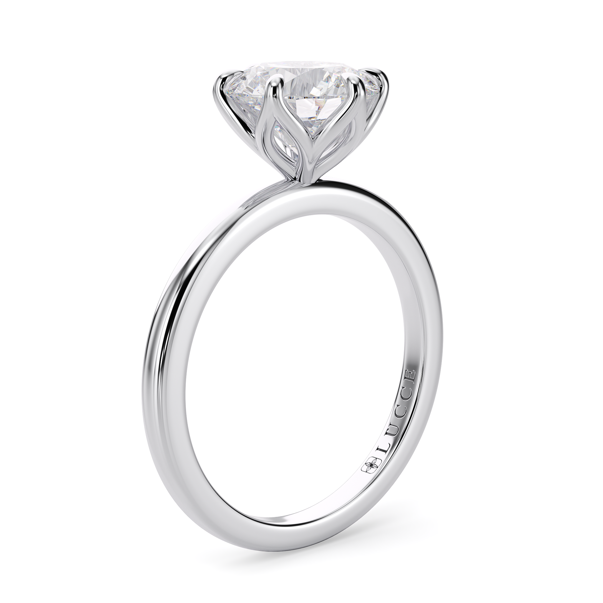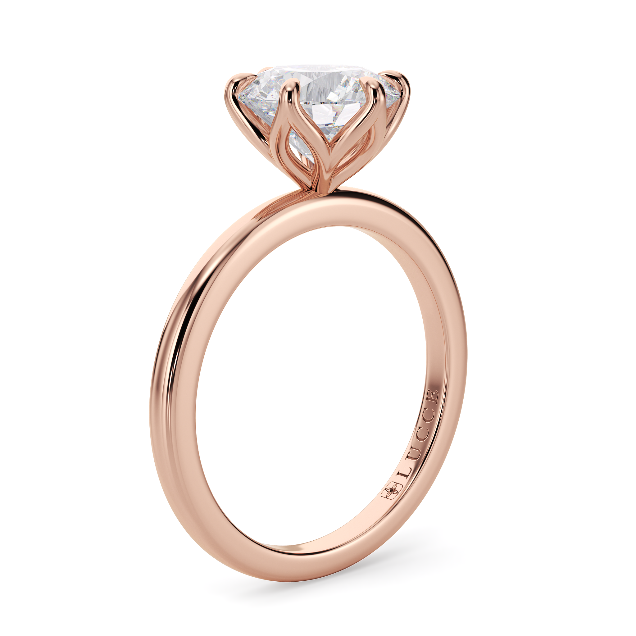 This forever piece features six delicate petal prongs and a timeless solitaire band, a design that finds its beauty in simplicity, much like the love you share: quiet, genuine, and deeply content. This round cut diamond engagement ring's solitaire band is a symbol of devotion, a reminder that she is the only one your heart desires. Like a tulip in full bloom, she is graceful in her simplicity, yet endlessly captivating.