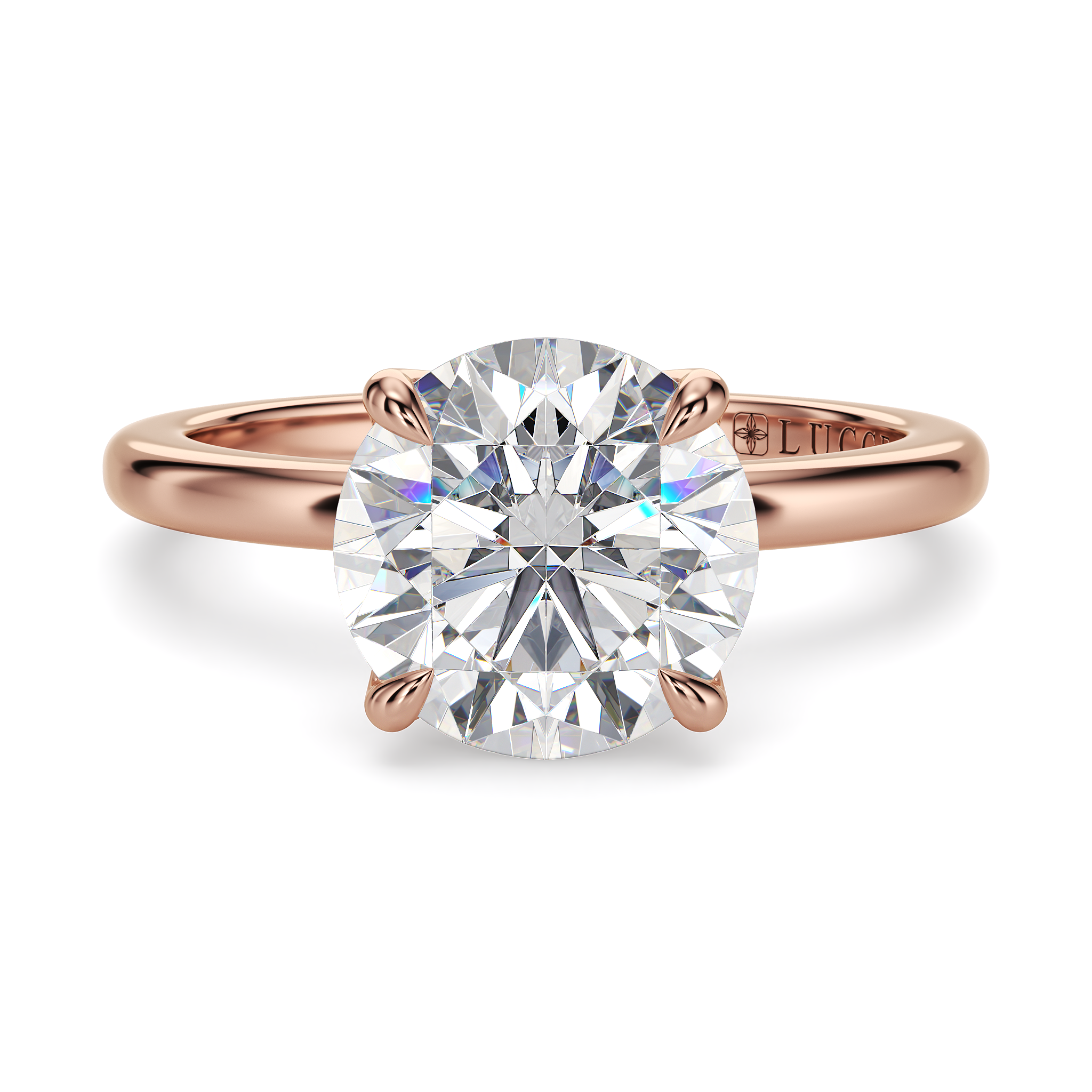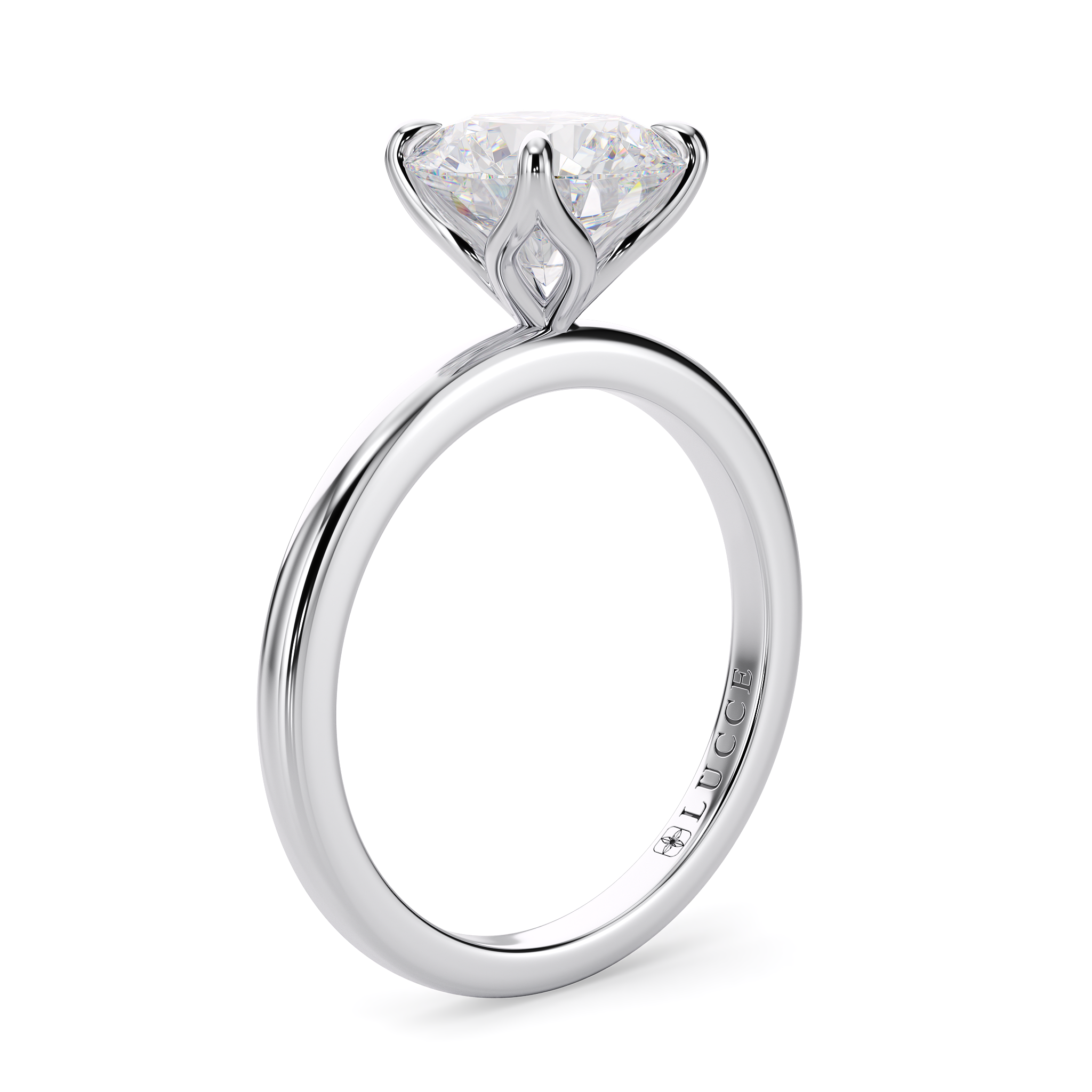 This forever piece features four delicate petal prongs and a timeless solitaire band, a design that finds its beauty in simplicity, much like the love you share: quiet, genuine, and deeply content. This round cut diamond engagement ring's solitaire band is a symbol of devotion, a reminder that she is the only one your heart desires. Like a tulip in full bloom, she is graceful in her simplicity, yet endlessly captivating.