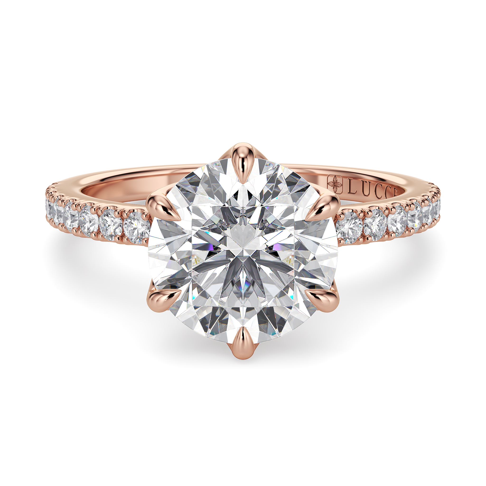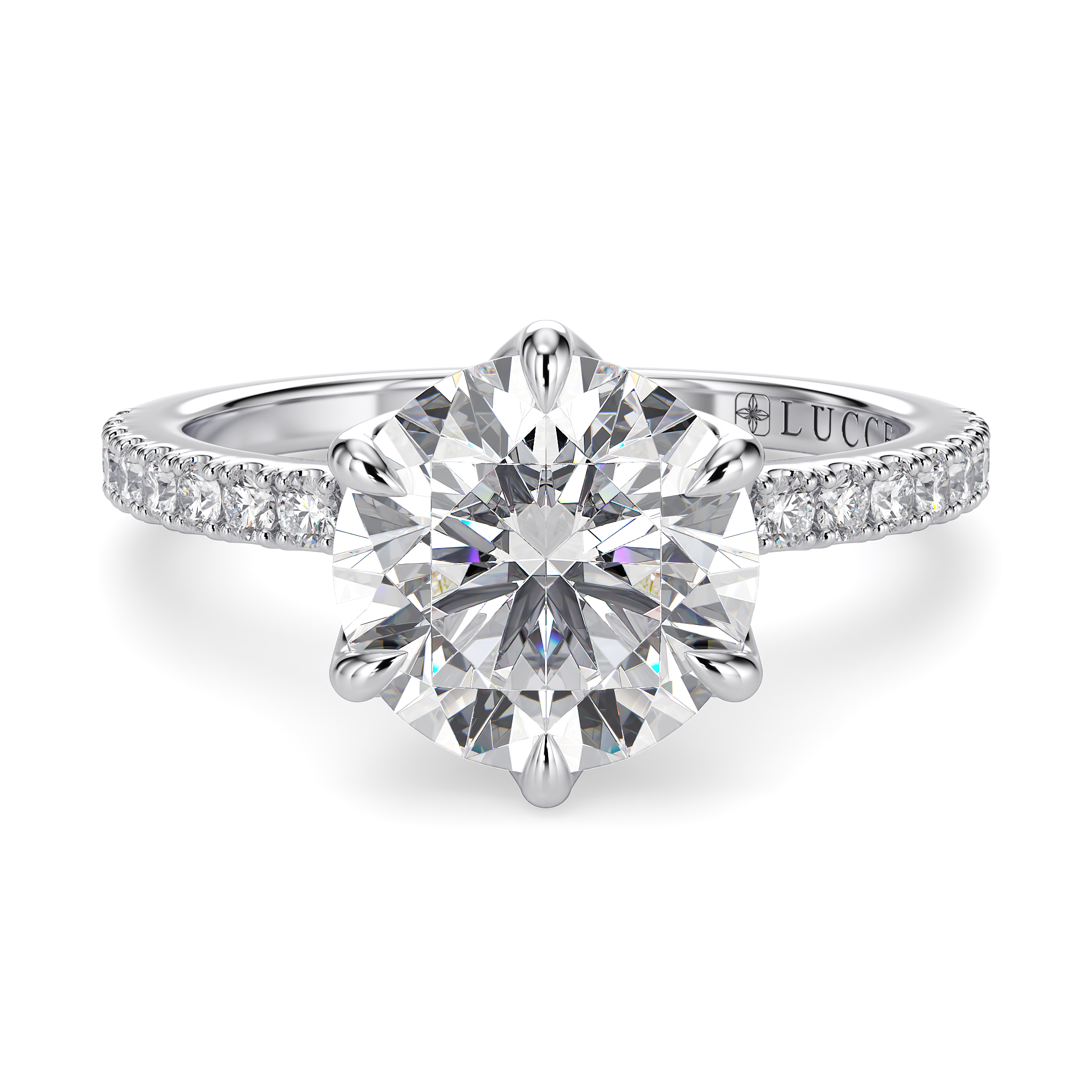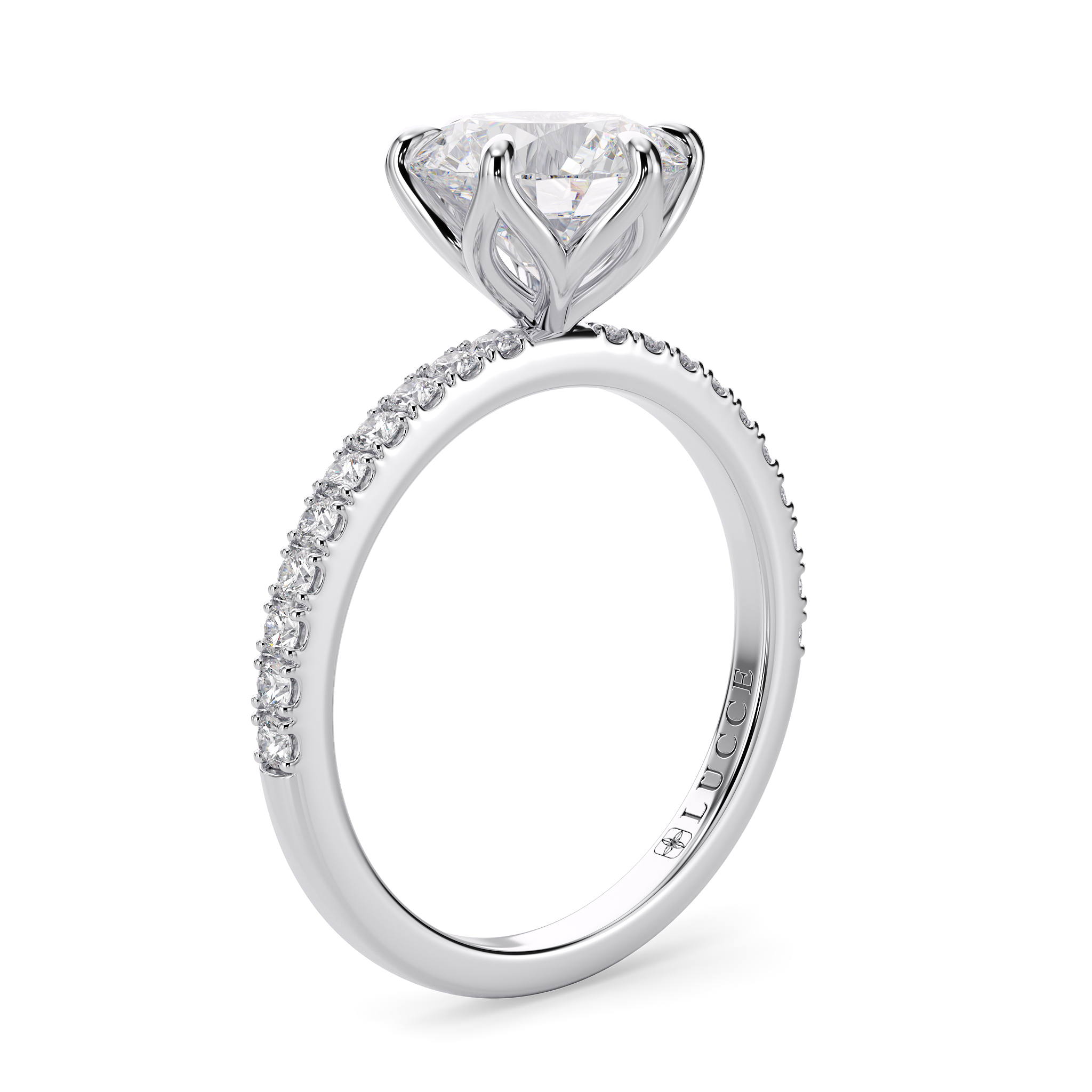 This forever piece features six delicate petal prongs and a classic pavé band, a design as graceful and captivating as she is. Like her, its beauty isn’t loud; it blooms softly, effortlessly, like a flower kissed by morning light. This round cut diamond engagement ring's pavé accents shimmer gently, just like the true and steady love you’ve nurtured together.