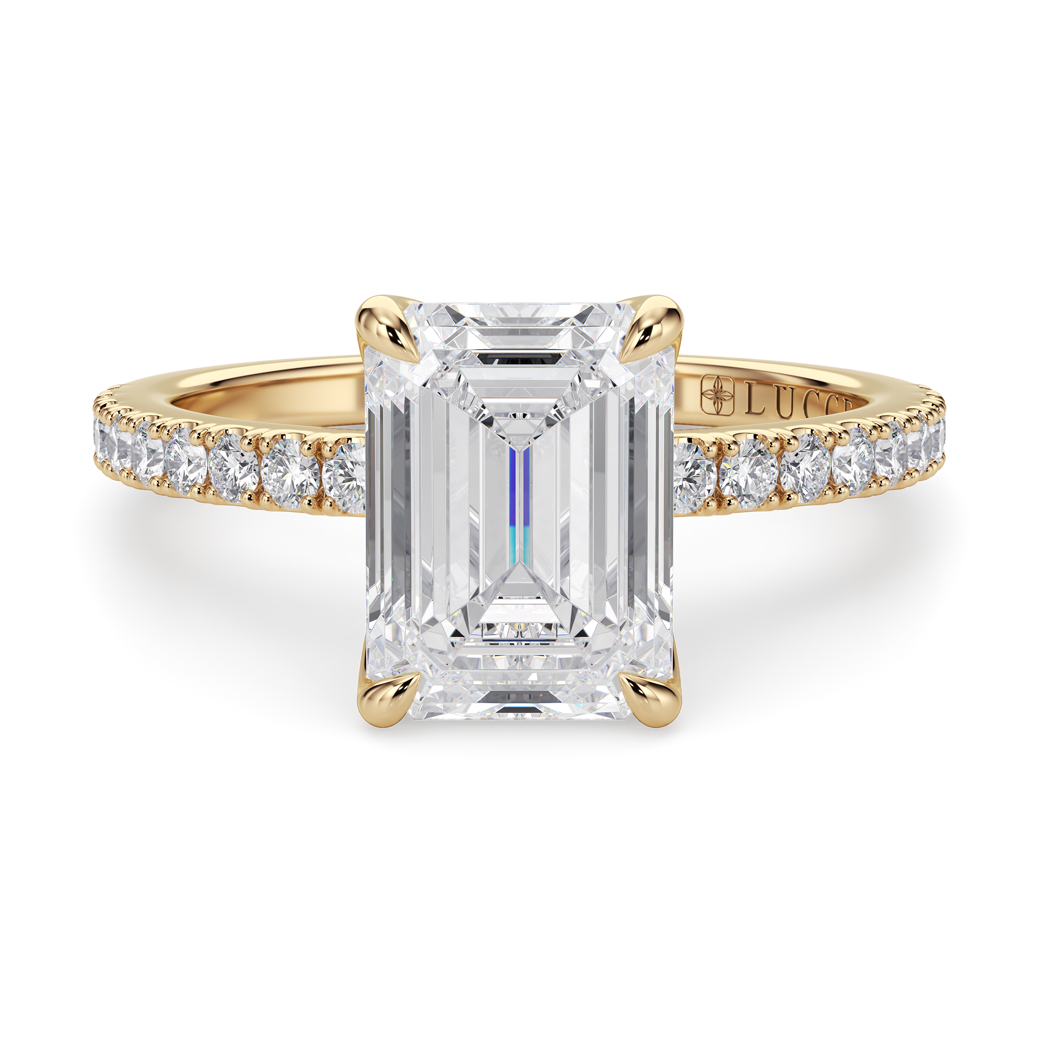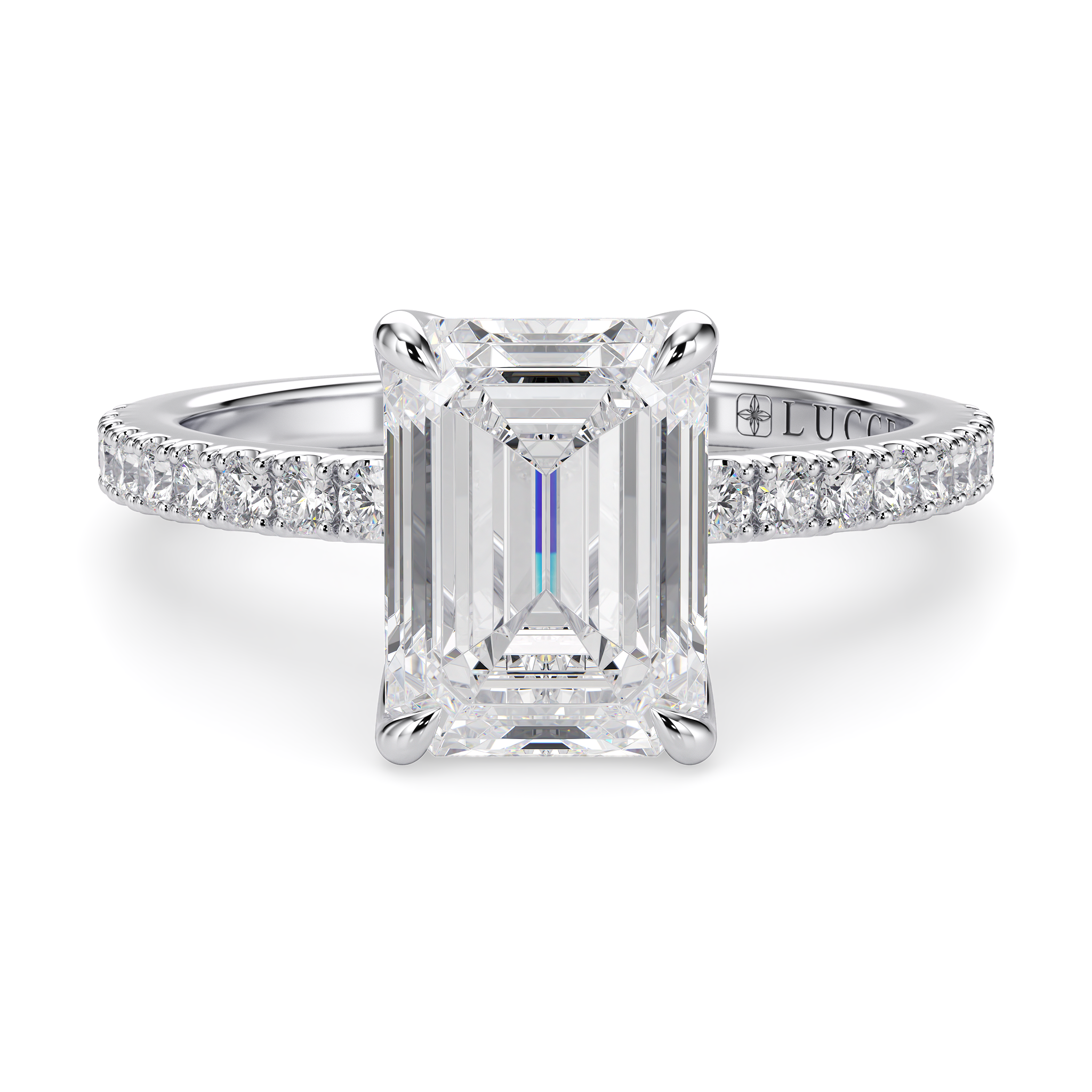 This forever piece features delicate petal prongs and a classic pavé band, a design as graceful and captivating as she is. Like her, its beauty isn’t loud; it blooms softly, effortlessly, like a flower kissed by morning light. This emerald cut diamond engagement ring's pavé accents shimmer gently, just like the true and steady love you’ve nurtured together.