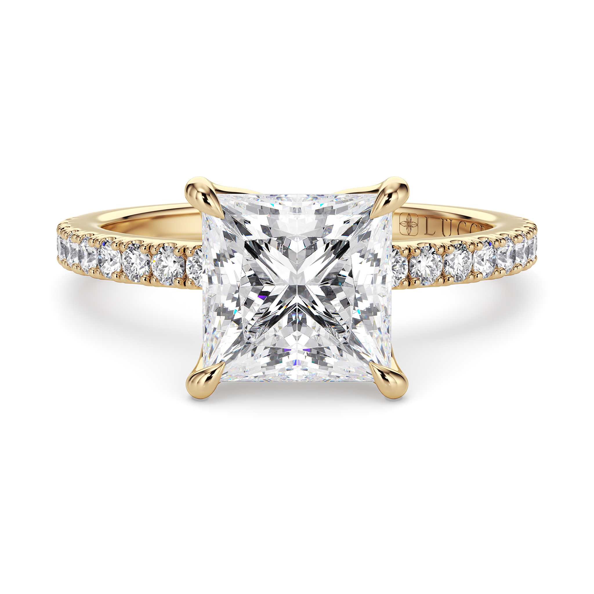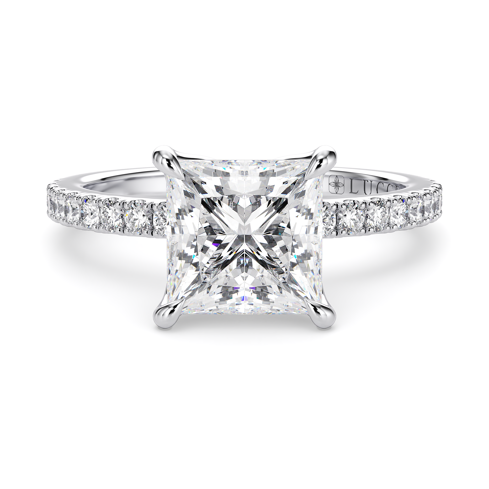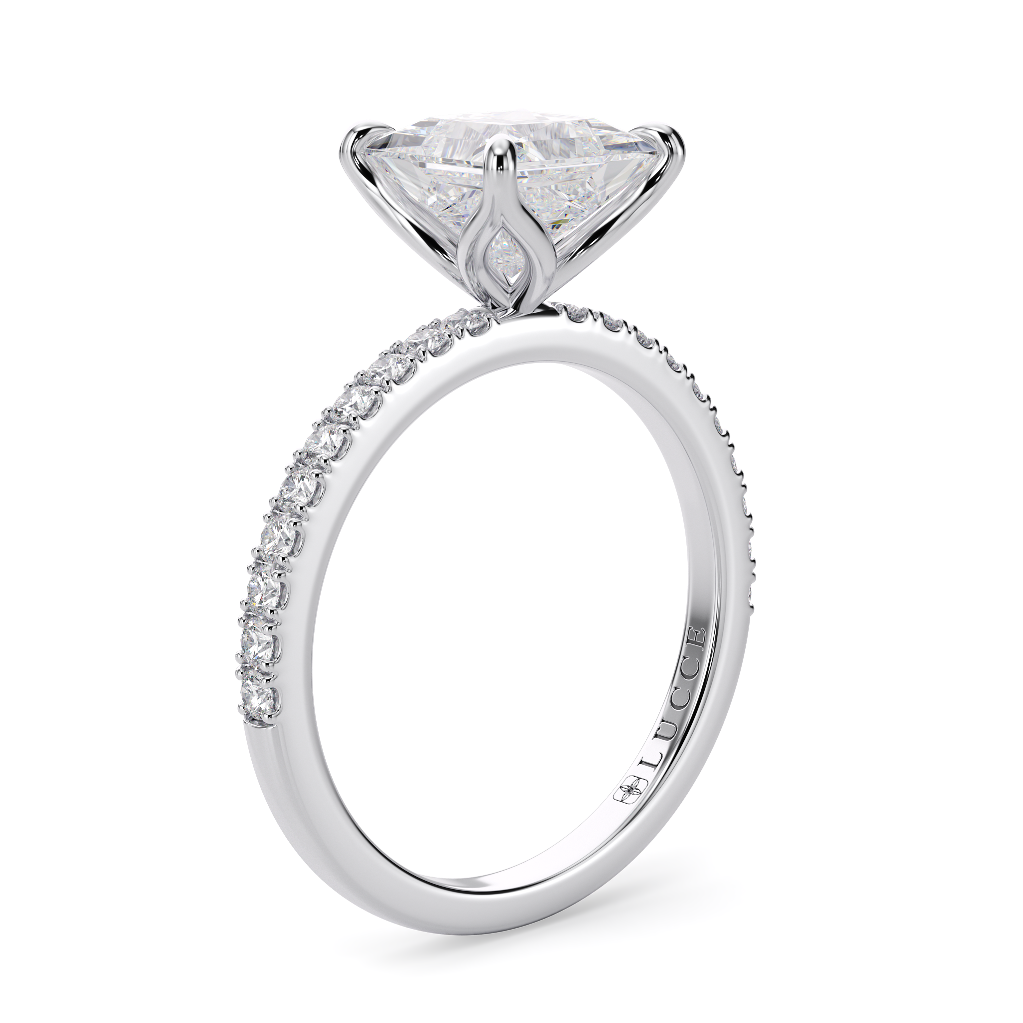This forever piece features delicate petal prongs and a classic pavé band, a design as graceful and captivating as she is. Like her, its beauty isn’t loud; it blooms softly, effortlessly, like a flower kissed by morning light. This princess cut diamond engagement ring's pavé accents shimmer gently, just like the true and steady love you’ve nurtured together.