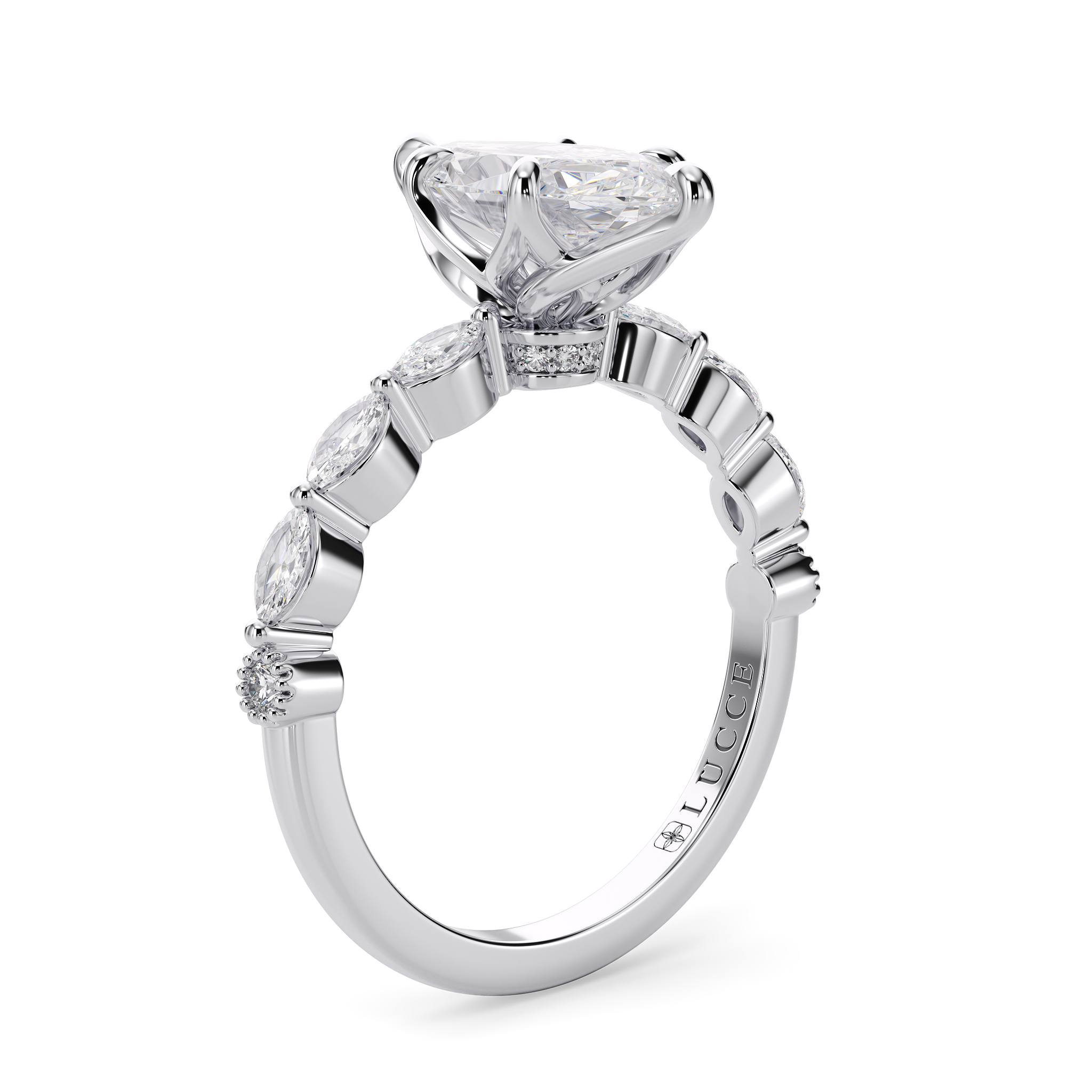 This forever piece showcases a modern marquise cluster setting with delicate petals prongs, forming a graceful floral silhouette. This marquise cut diamond engagement ring's marquise accents resemble tender leaves, while end of the band is adorned with a round-cut milgrain dew drops, evoking a freshness of a blooming garden. This ring is a symbol of love that blooms, and a promise to grow and flourish together, always.