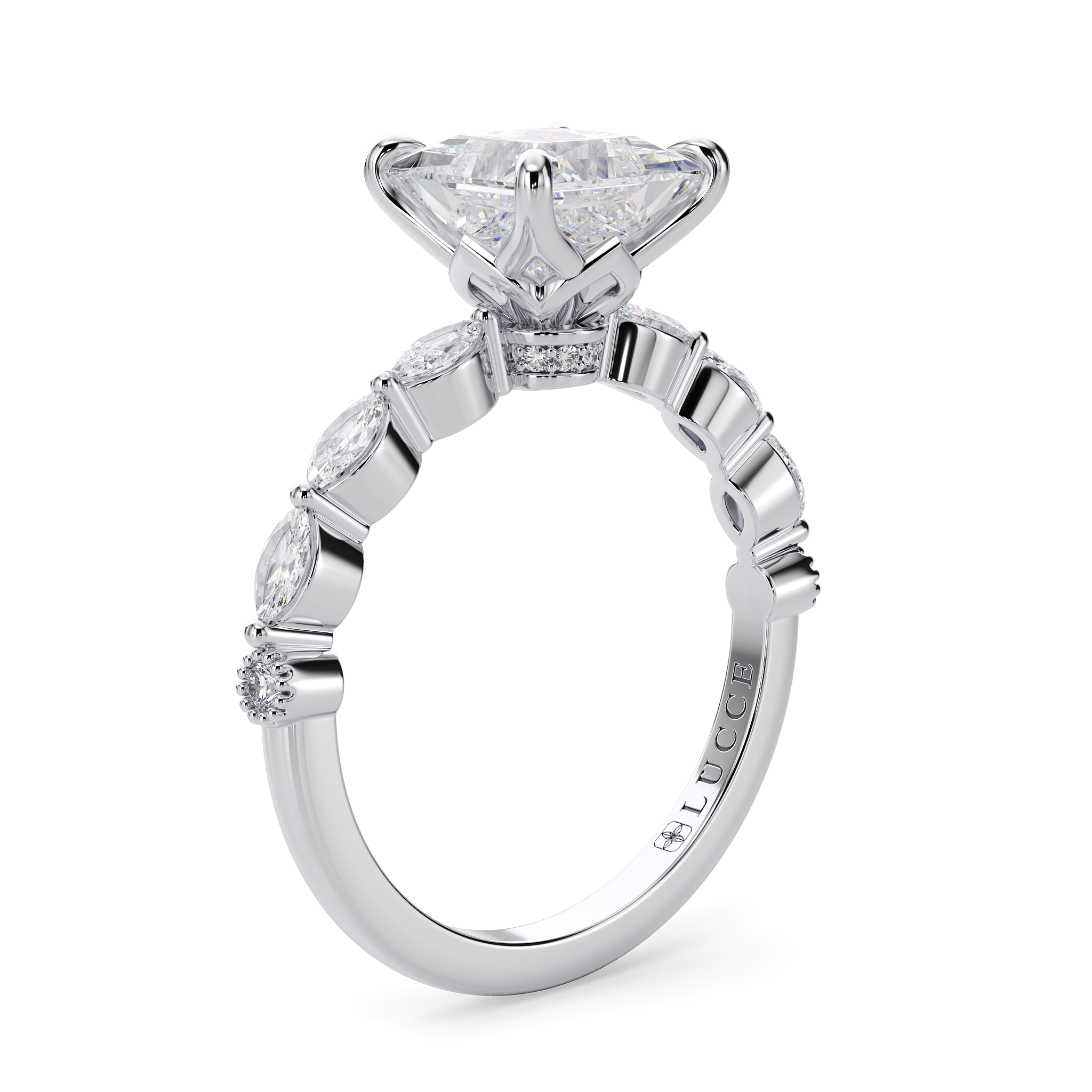 This forever piece showcases a modern marquise cluster setting with delicate petals prongs, forming a graceful floral silhouette. This princess cut diamond engagement ring's marquise accents resemble tender leaves, while end of the band is adorned with a round-cut milgrain dew drops, evoking a freshness of a blooming garden. This ring is a symbol of love that blooms, and a promise to grow and flourish together, always.
