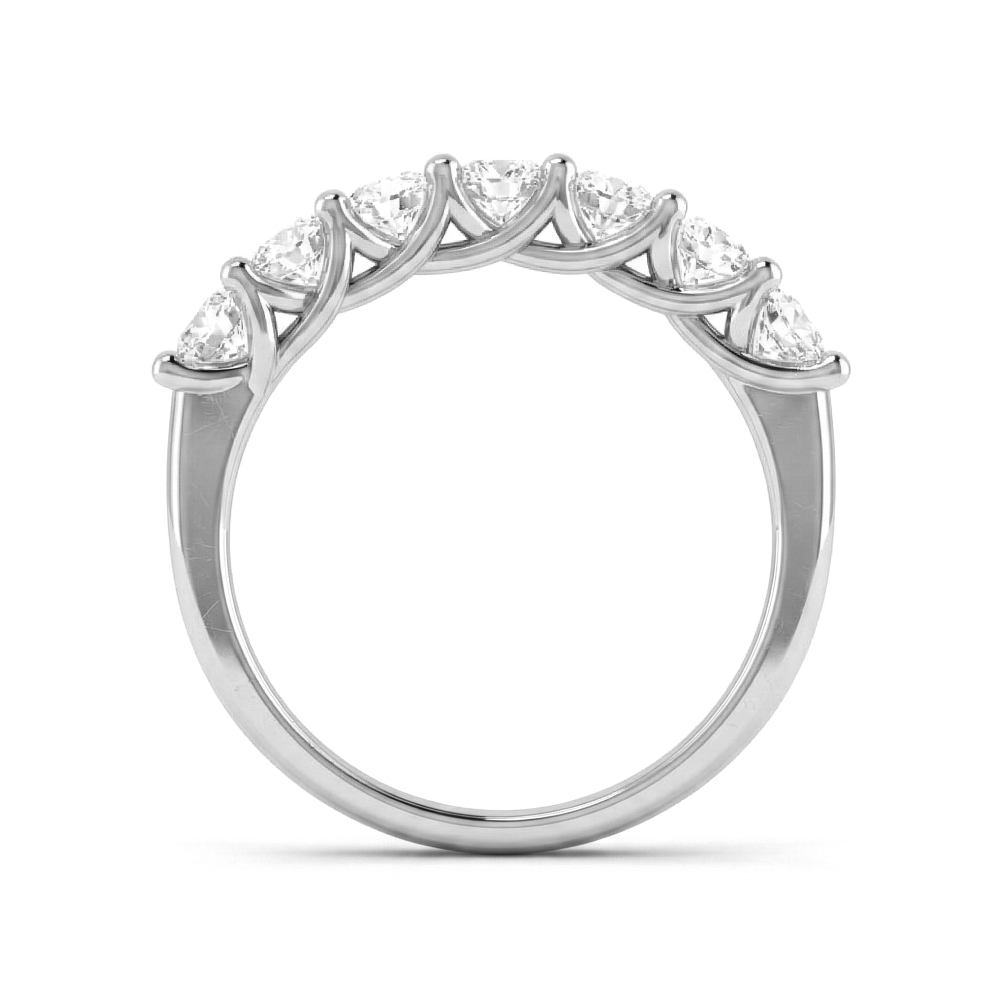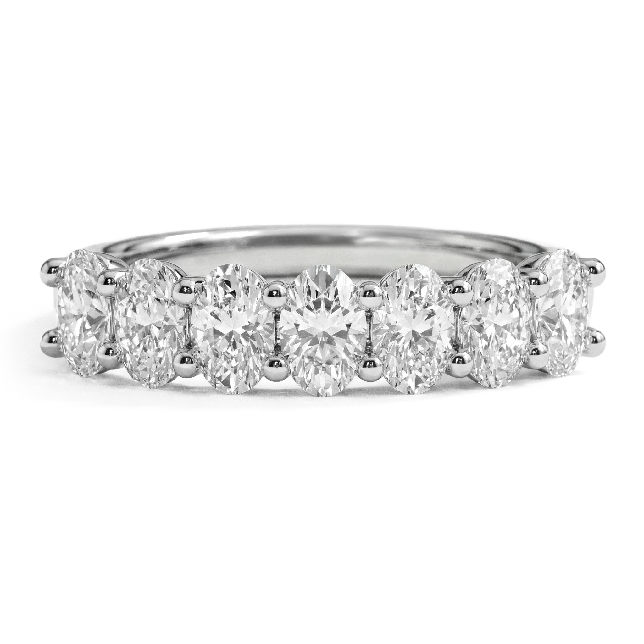 This timeless 7-Stone ring showcases the pure brilliance of the oval cut diamonds in a refined trellis settings. This band is a perfect wedding or anniversary ring and signifies the promise of fulfillment of promises and oaths.