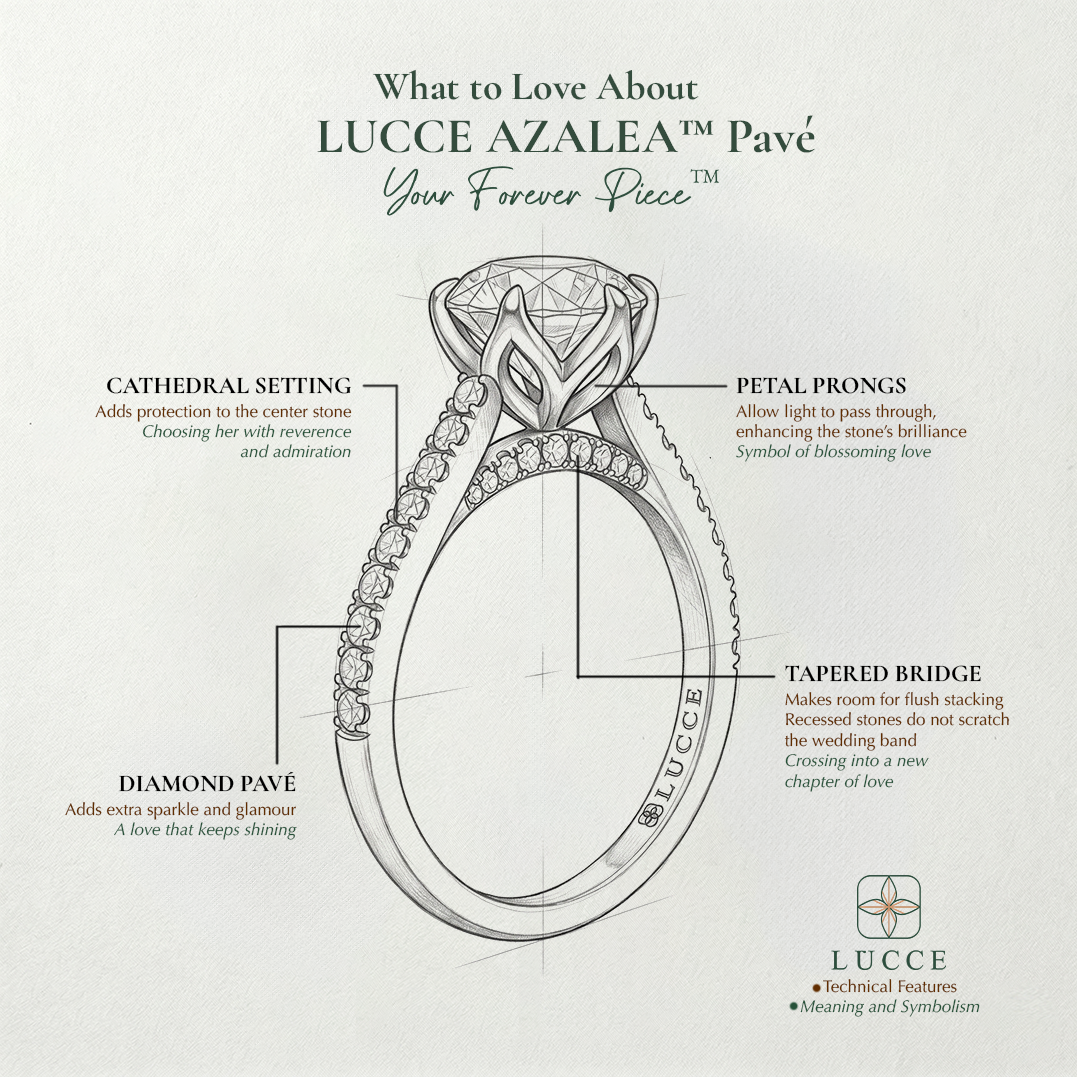 What to love about your LUCCE forever piece, Azalea cathedral pavé with cathedral setting, petal prongs and tapered bridge with accents
