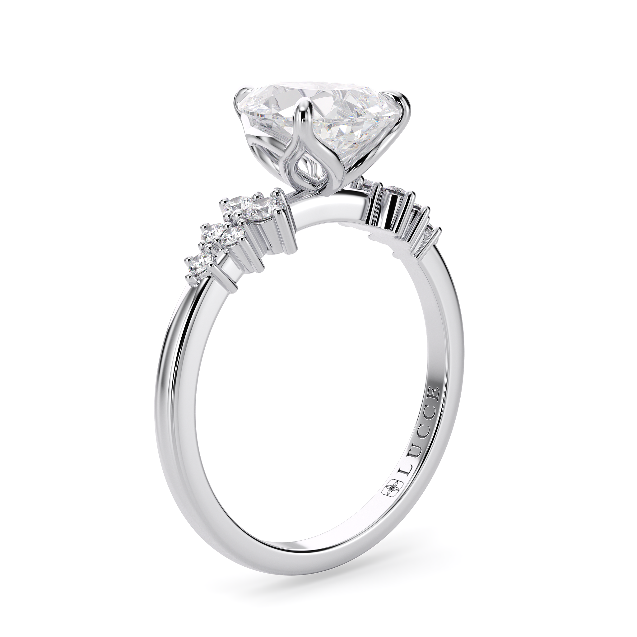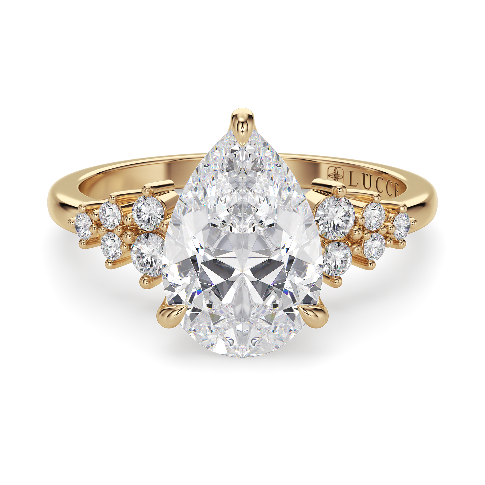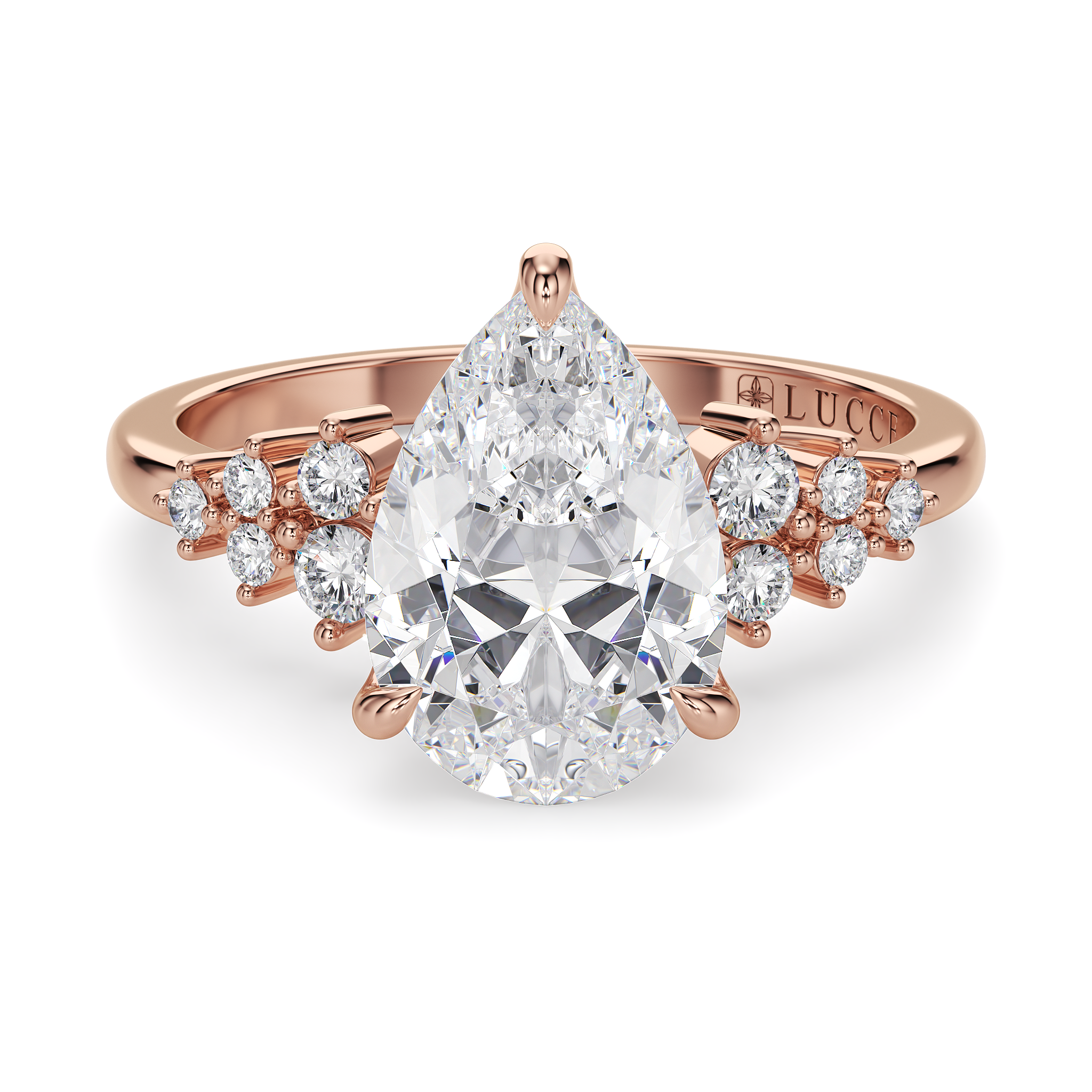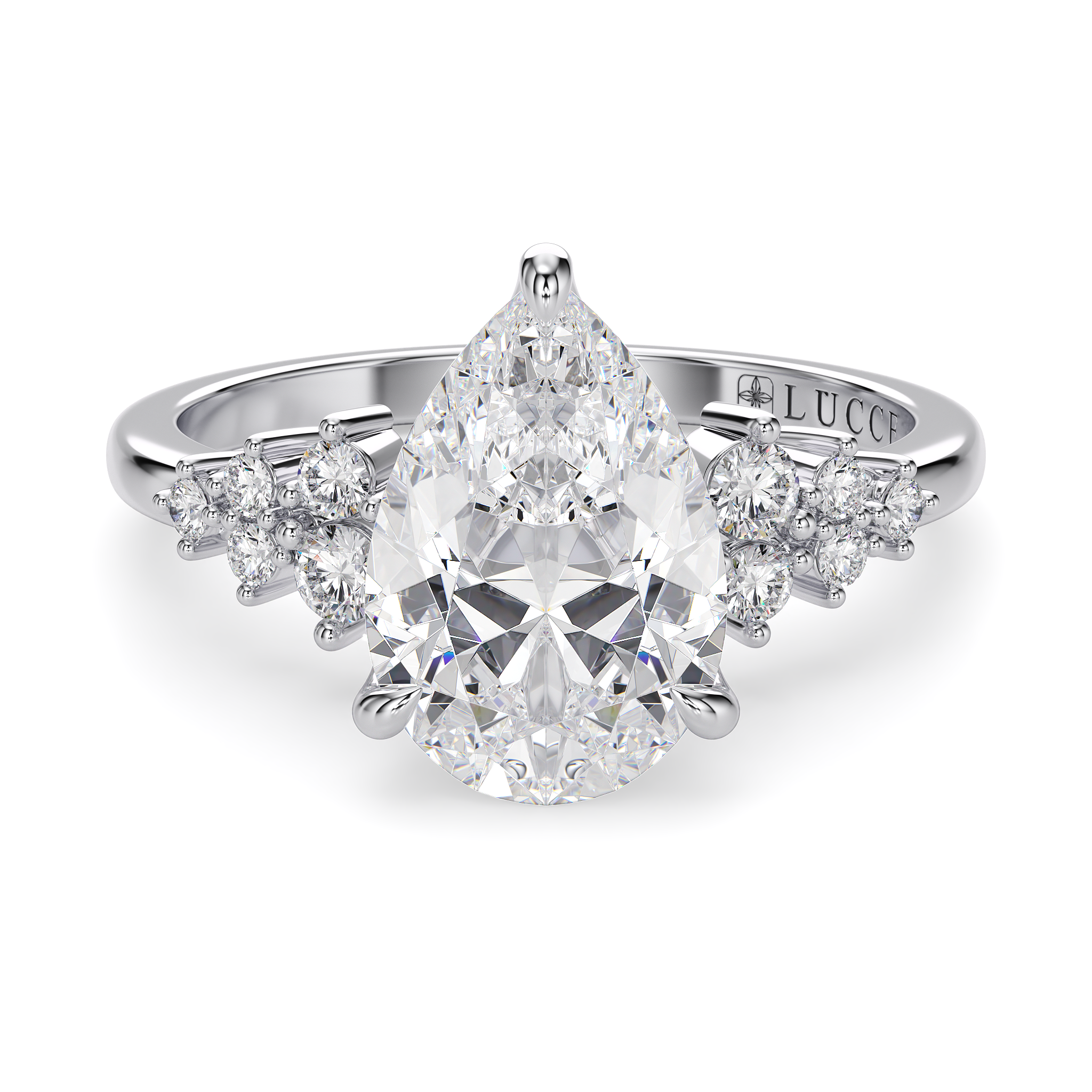 This forever piece features a delicate cluster setting with Lucce's signature petal prongs, forming a bloom of scattered diamond blossoms. This pear cut diamond engagement ring's cluster of stones also symbolizes the beautiful differences between you, each unique, yet coming together in perfect harmony. This ring symbolizes your promise to stay with her because your love is beautifully real.
