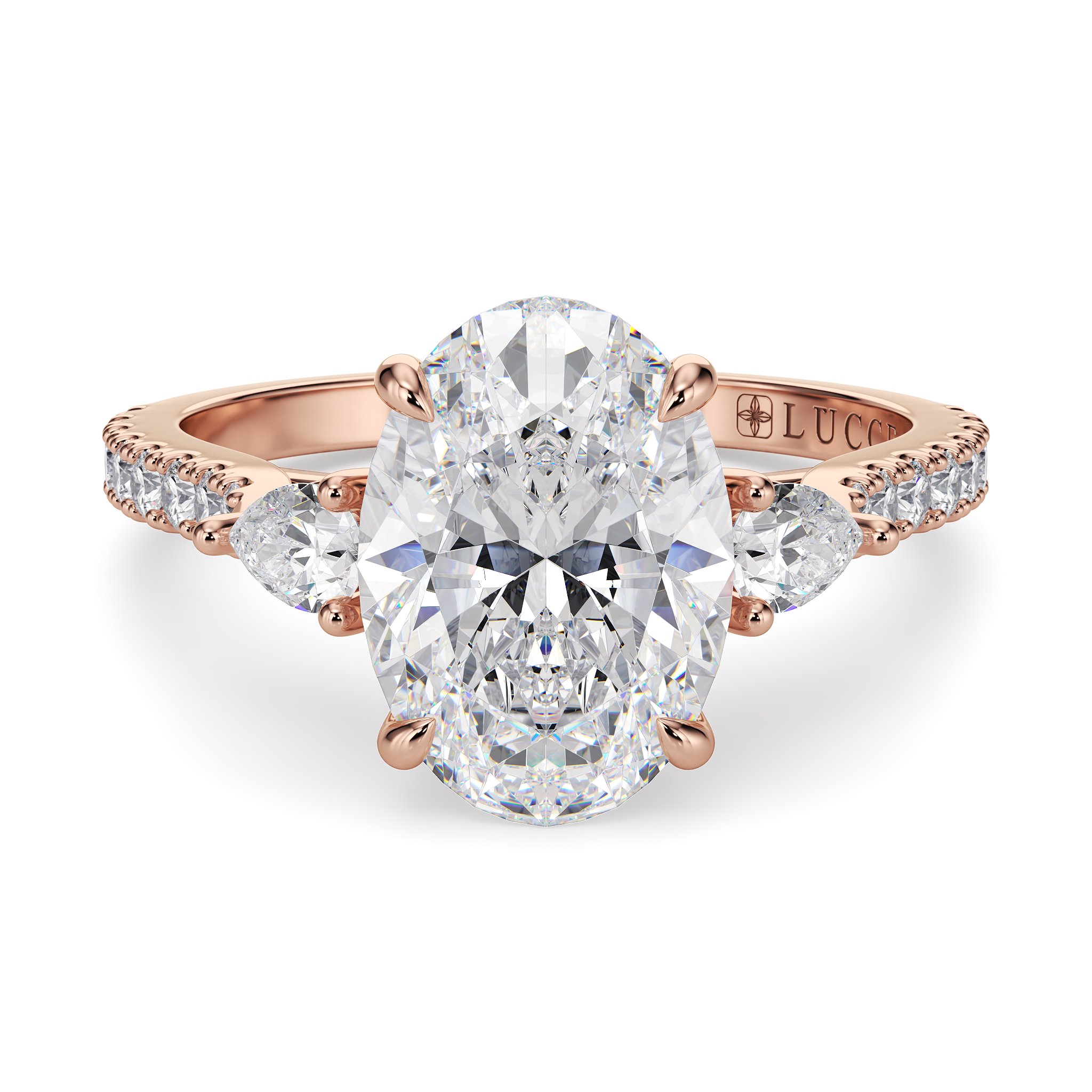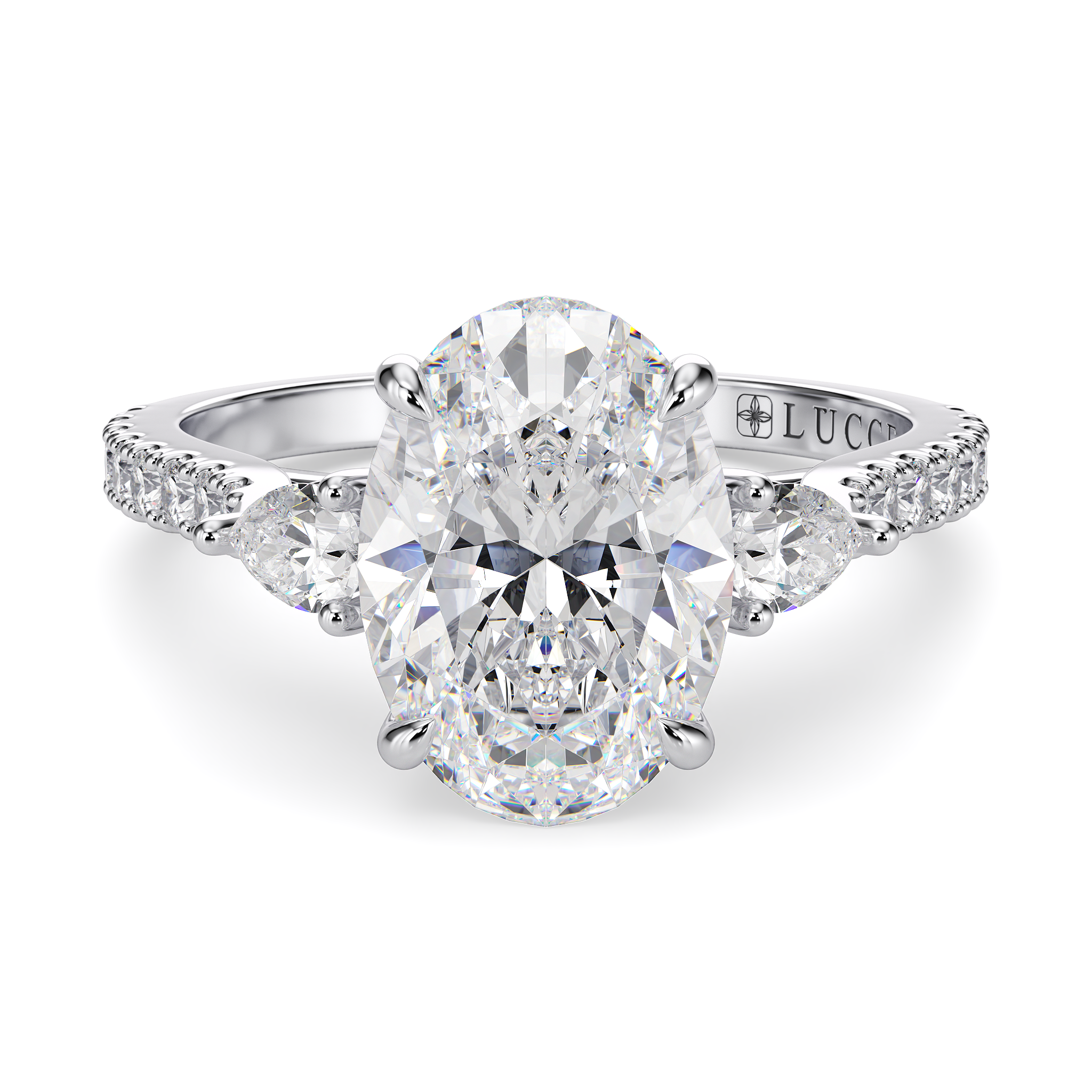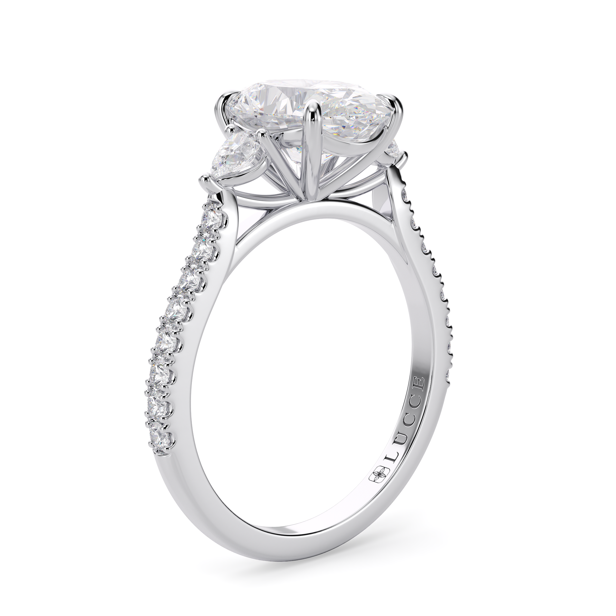 This forever piece is Lucce’s modern take on the timeless three-stone ring with a pavé band. The oval cut engagement ring's trio of diamonds blooms like a bouquet, each stone representing the love you’ve shared in the past, share in the present, and will share in the future. It’s like saying I love you, not just once, but as a promise you’ll keep whispering for a lifetime.